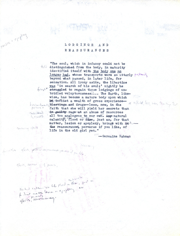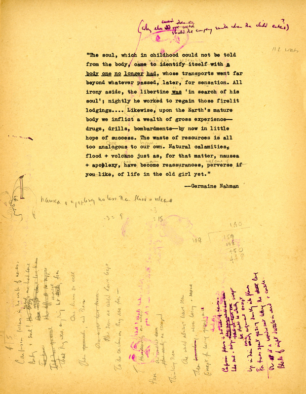 provides an allegorical interpretation of Merrill’s "grotesque" sexual pursuits. Here he links the libertine’s quest for stimulation and pleasure, as he would much later in The Changing Light at Sandover, to man’s abuse of the planet: "Likewise, upon Earth’s mature body we inflict a wealth of gross experience— drugs, drills, bombardments— with what effect? A stale frisson, a waste of resources all too analogous to our own. Natural calamities (tumor and apoplexy no less than flood and volcano) may at last be hailed as positive reassurances, perverse if you like, of life in the old girl yet."