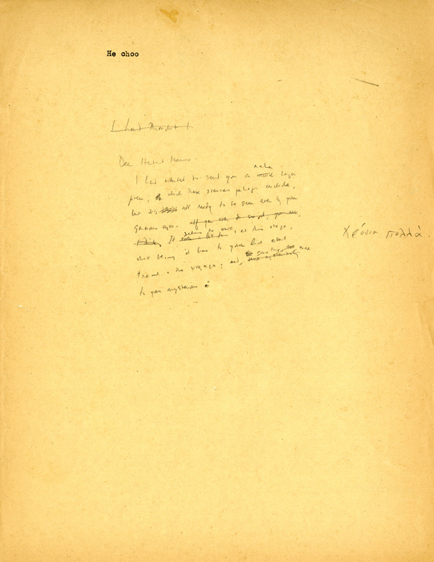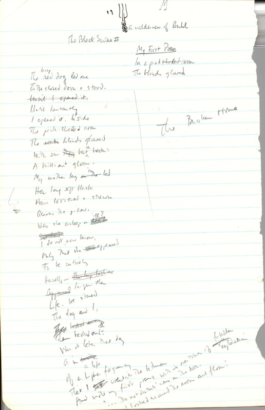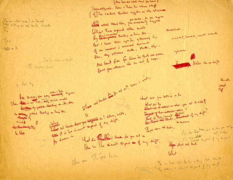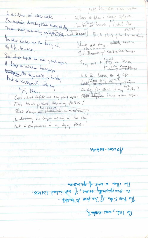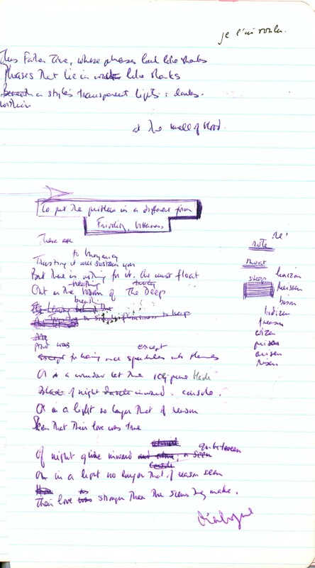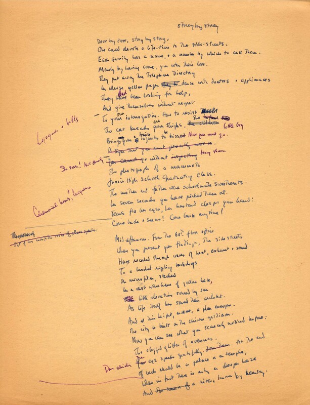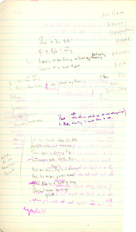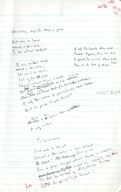 The concept of "love without an object" in Manuscripts 2 and 9 appears in many mystical traditions. For example, this line from a poem by Jalal ad-Din Muhammad Rumi, a Persian poet and Sufi master (b. 1207): “A love with no object is a true love." Manuscript 2 contains a note in the right margin: "1002nd Night." Manuscript 9 contains lines ("Lost friends . . . I bless you") that were worked into the "Love. Warmth." poem. Manuscript 10 contains a draft letter to Harold Moss about the publication of the poem in The New Yorker.