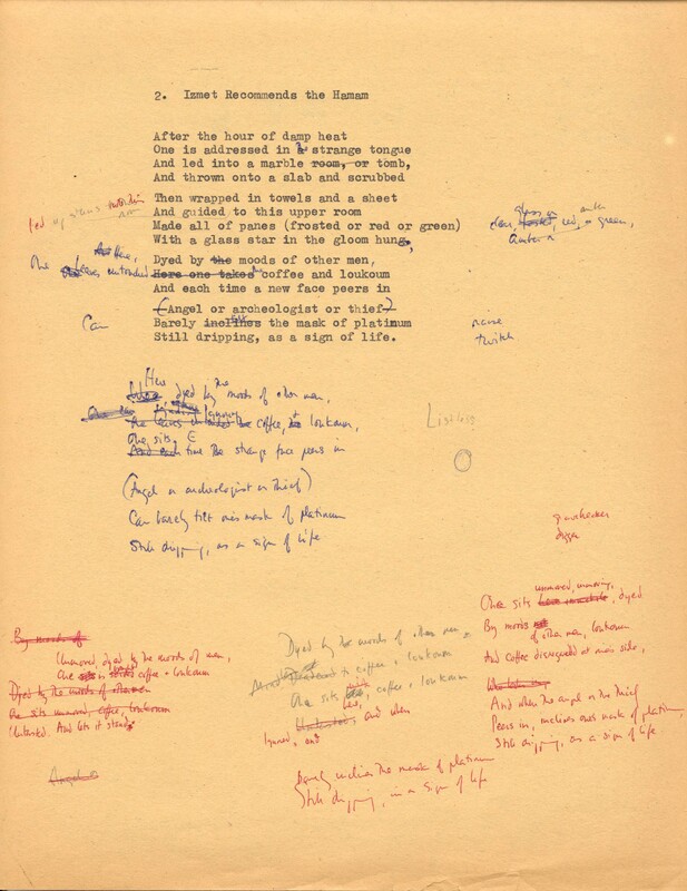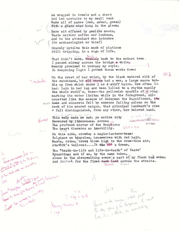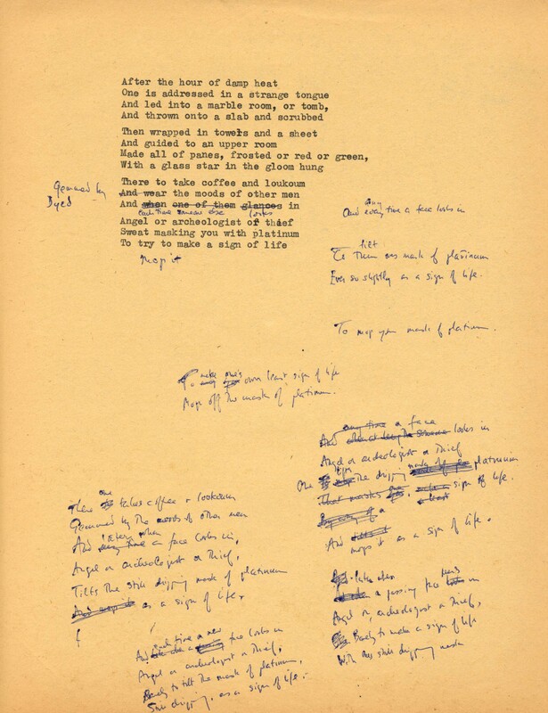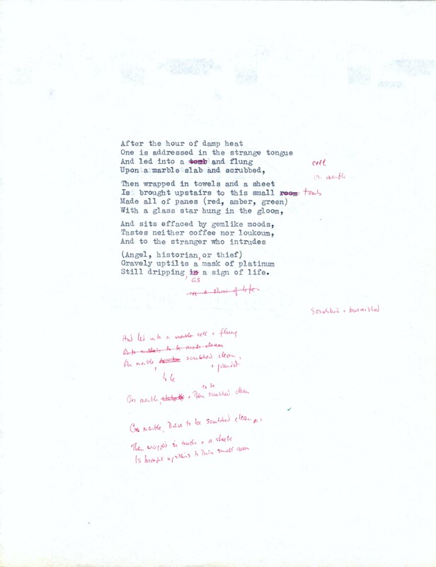The manuscripts again show Merrill working in the sonnet form. Manuscript 1 is dated "Sept 3-4-5, 1962." Manuscript 6 contains a draft of the prose passage about the grandmother's wen.