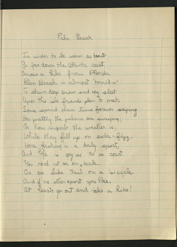 "Palm Beach" from Journal 73 [1936: Nov 9 - 1937: April 2]. Special Collections, Washington University Libraries. The journal is a record of his writings at Palm Beach Private School. In its table of contents, the poem is dated April 2, 1936.