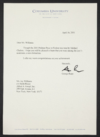George Rupp to Joy Williams Typed letter signed from President of the Pulitzer Prize Board -