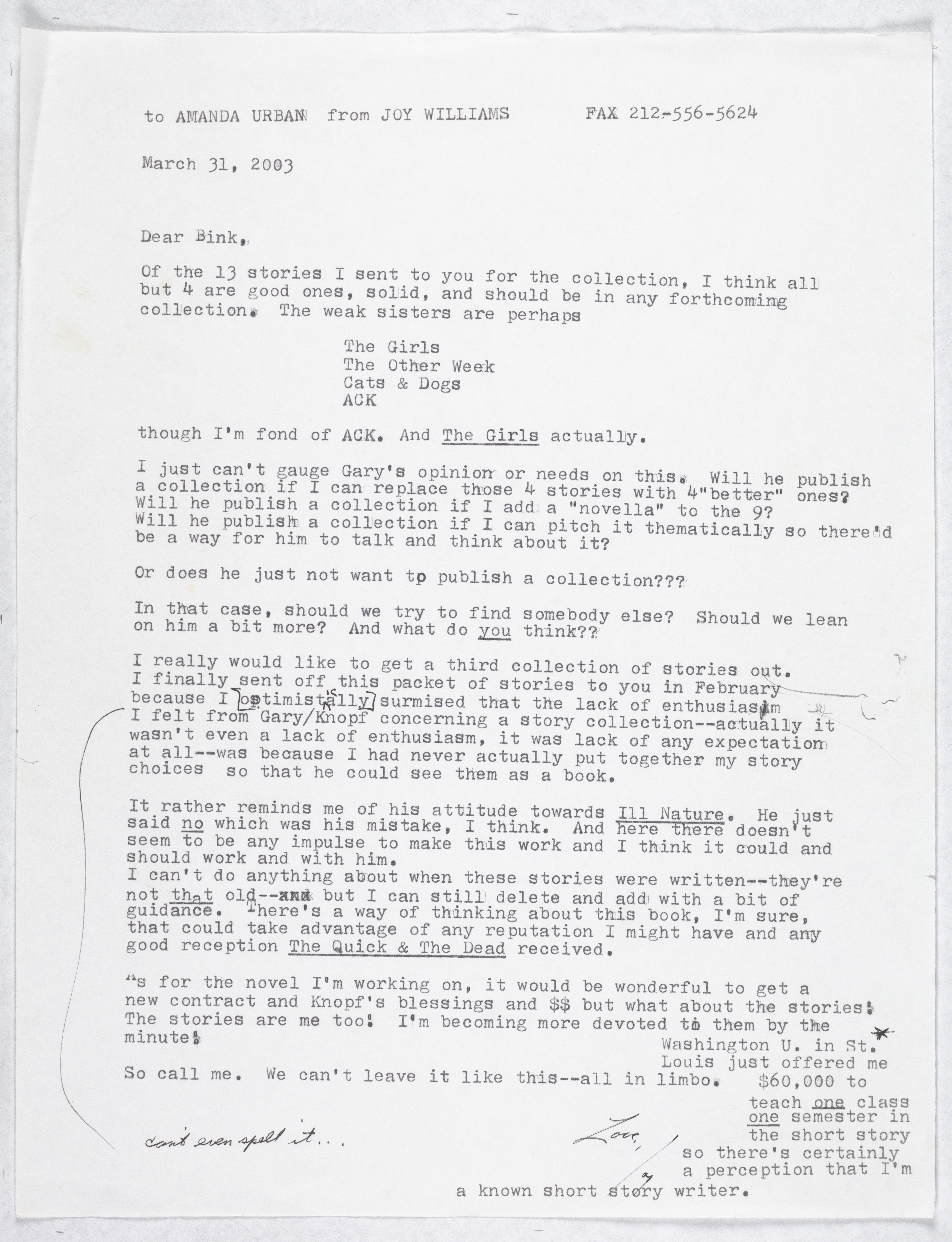 Williams, Joy. Letter. 2003. “Joy Williams to Amanda Urban”, 2003, Joy Williams: Honored Guest, accessed February 11, 2026, https://digitalexhibits.library.wustl.edu/s/joy-williams/item/1122