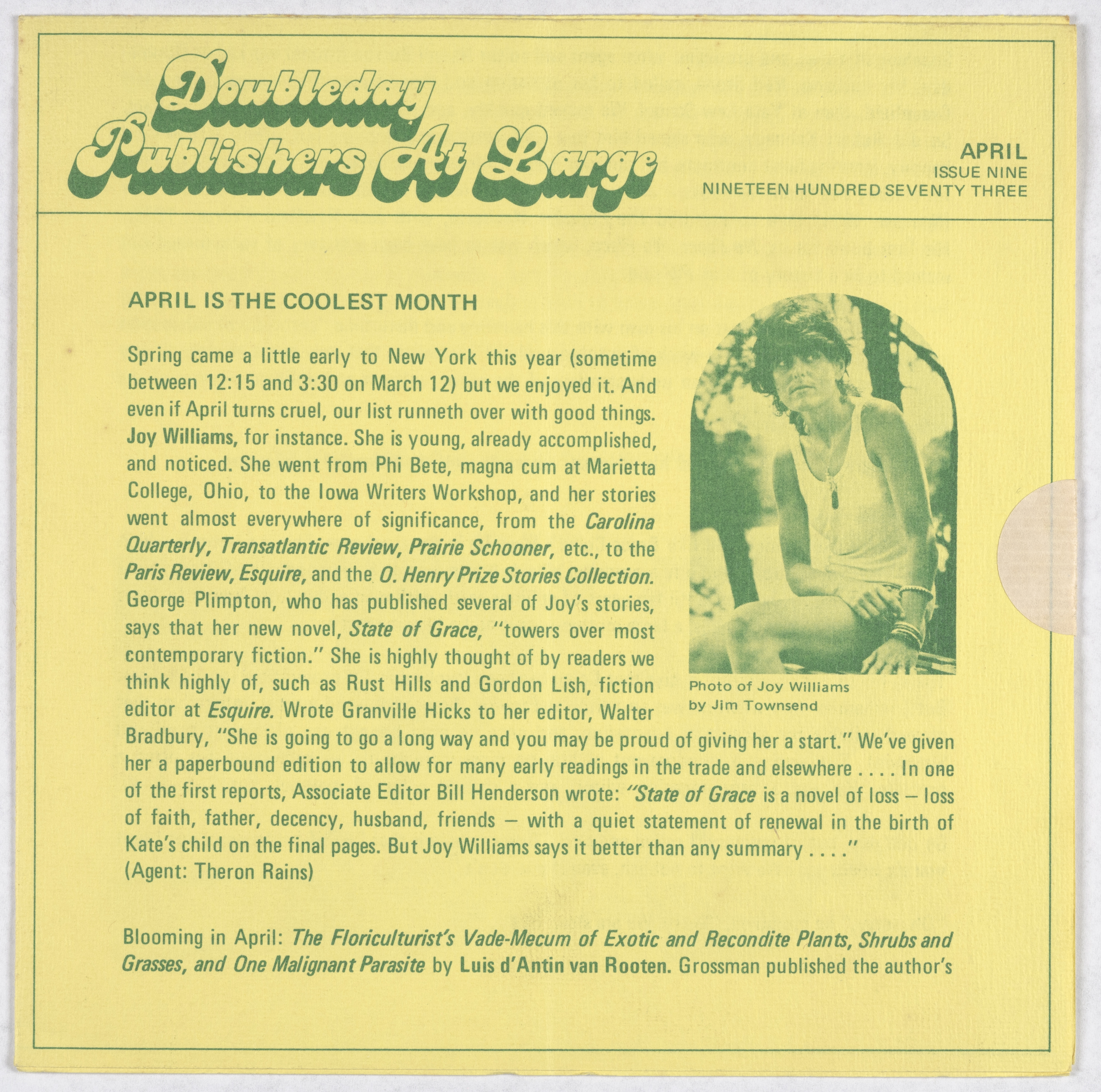 Doubleday. Letter. 1973. “‘Doubleday Publishers at Large’ Newsletter”, 1973, Joy Williams: Honored Guest, accessed February 11, 2026, https://digitalexhibits.library.wustl.edu/s/joy-williams/item/1135