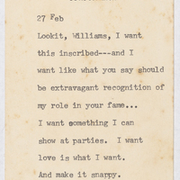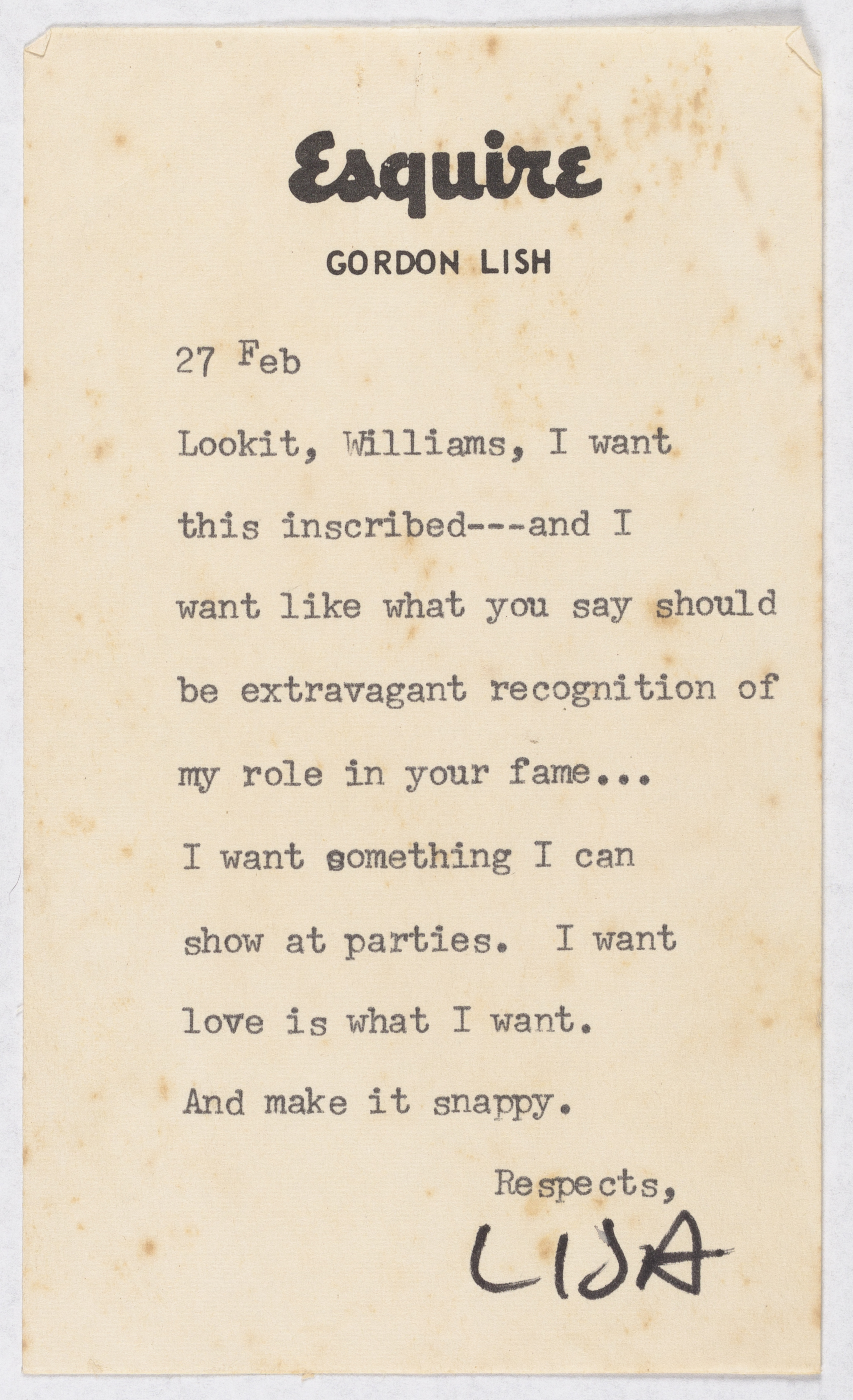 - This is an amusing note that was sent on the occasion of the publication of State of Grace. Lish published some of Williams’ early stories in Esquire, and has remained a friend, regularly sending her similarly jocular notes and letters.
