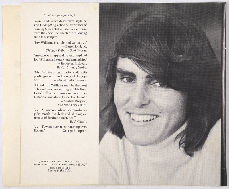 - Note the use of the Anatole Broyard quote on the back flap—bitter irony considering his role in dooming the book’s sales (see note for “New Joy Williams Novel”).