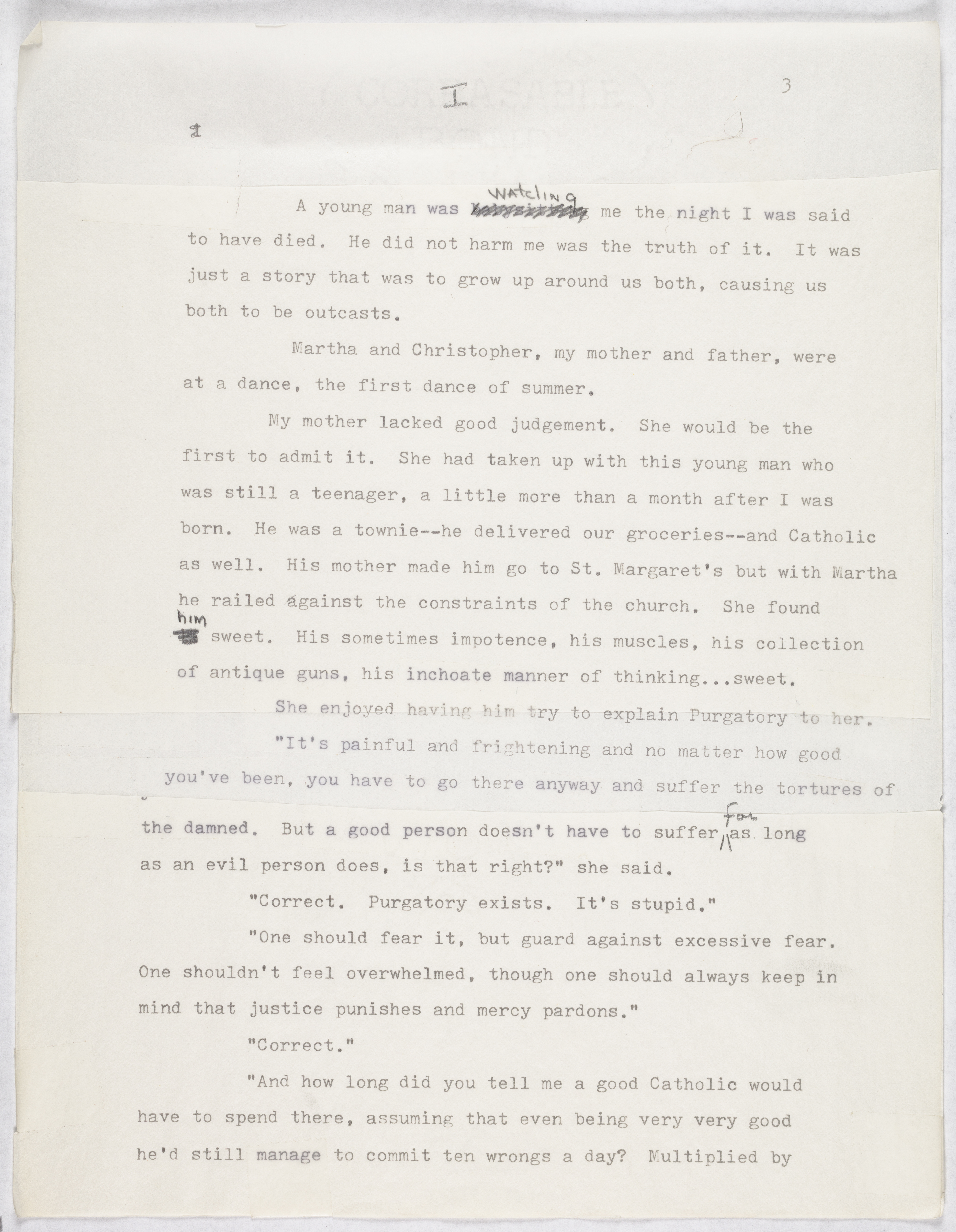 - First five pages of a heavily edited draft of Harrow with an earlier title.