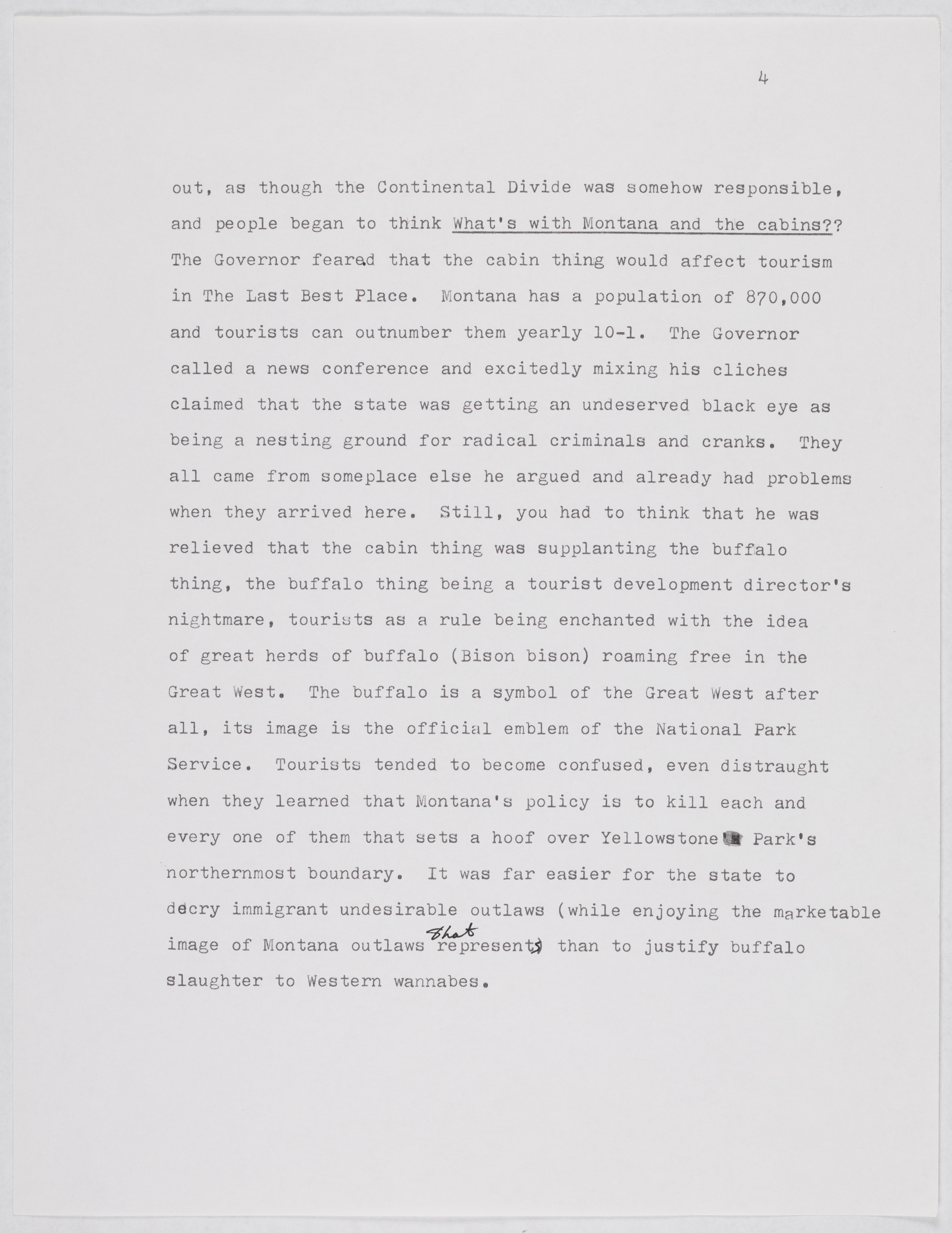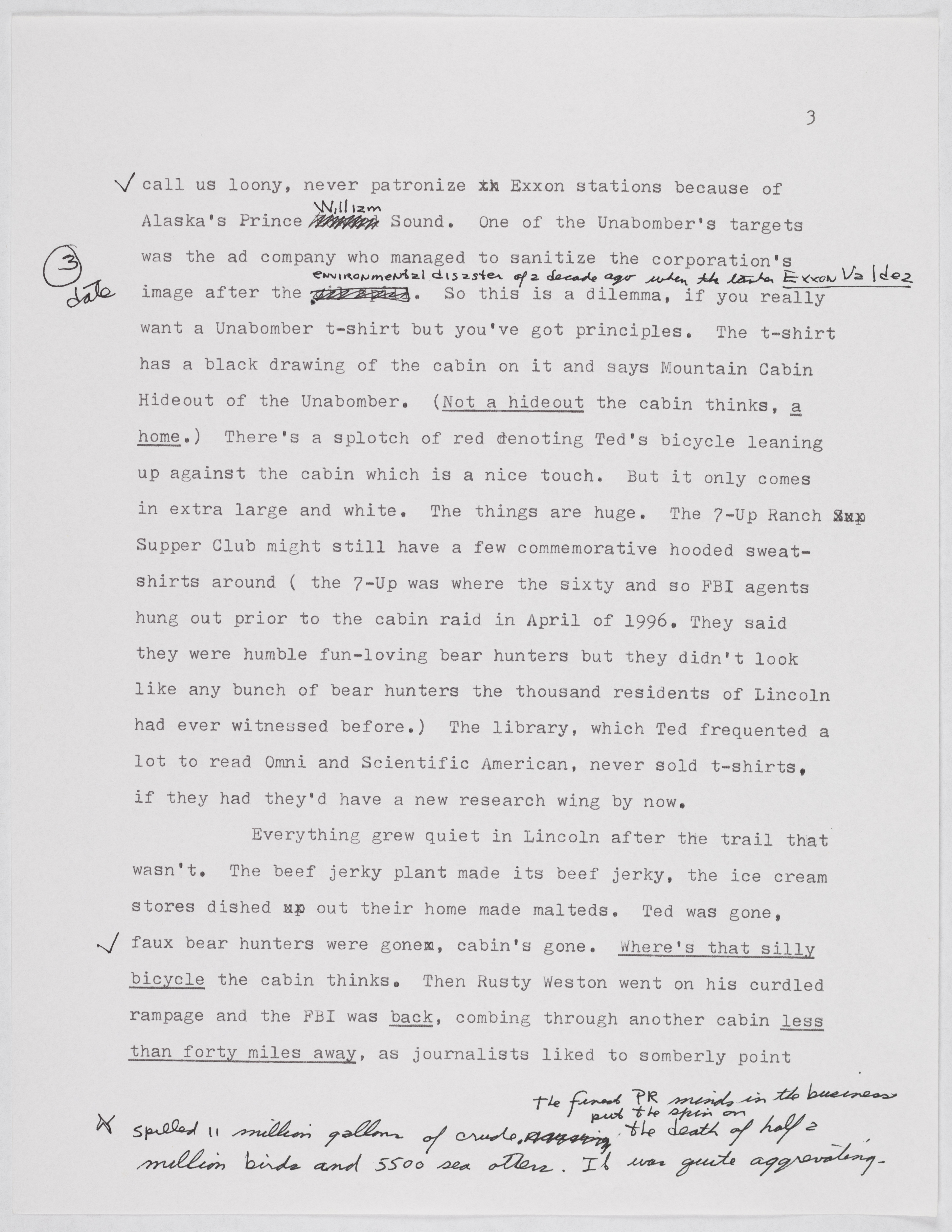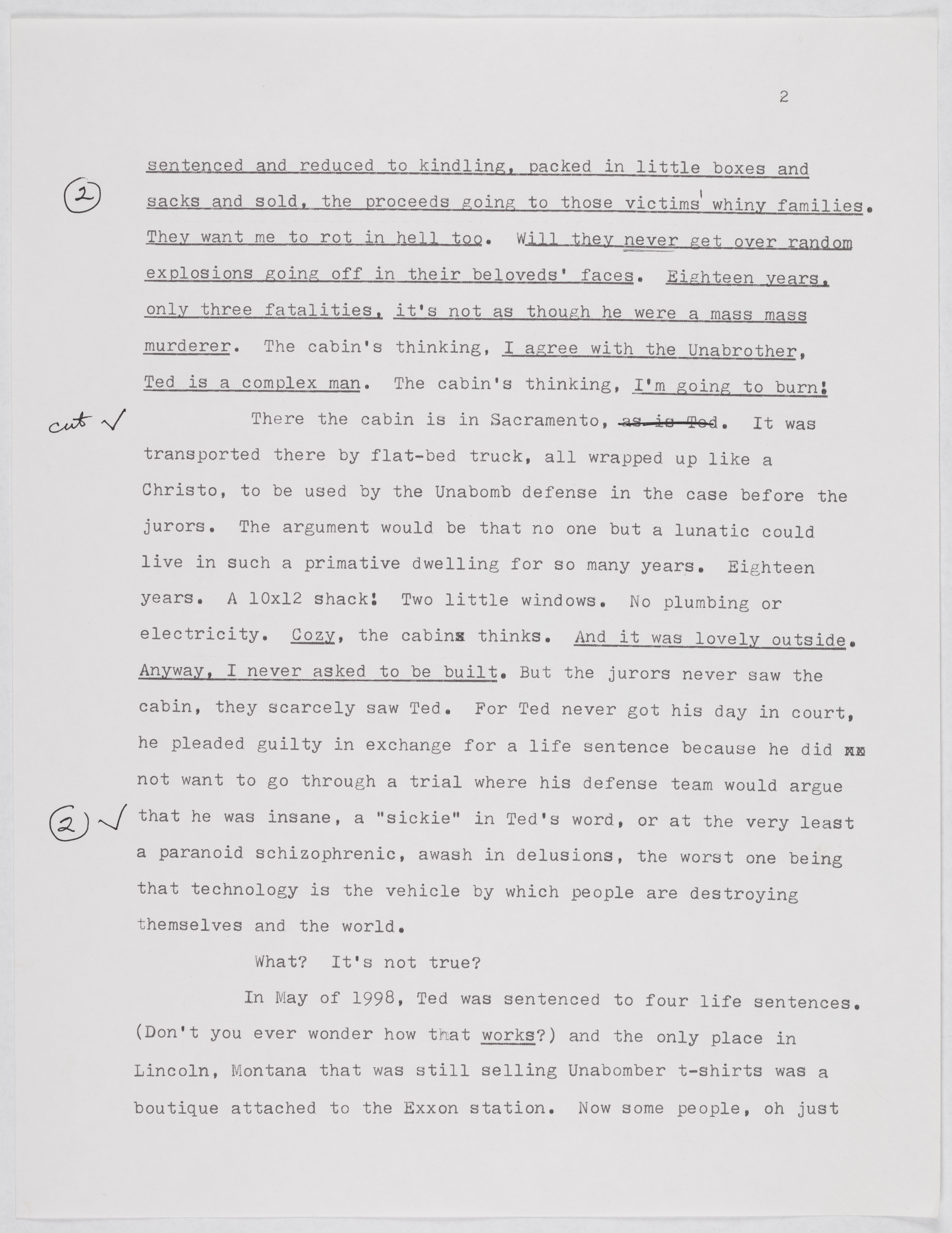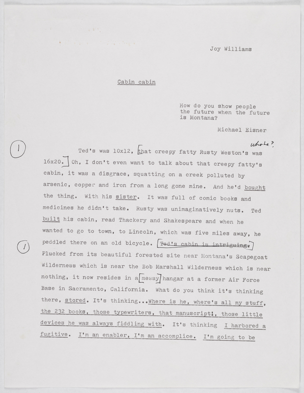 - In this intriguing essay, published in Joe in 1999, Williams anthropomorphizes the Montana cabin that Ted Kaczynski (aka The Unabomber) lived in and which was moved to California after his arrest for domestic terrorism.