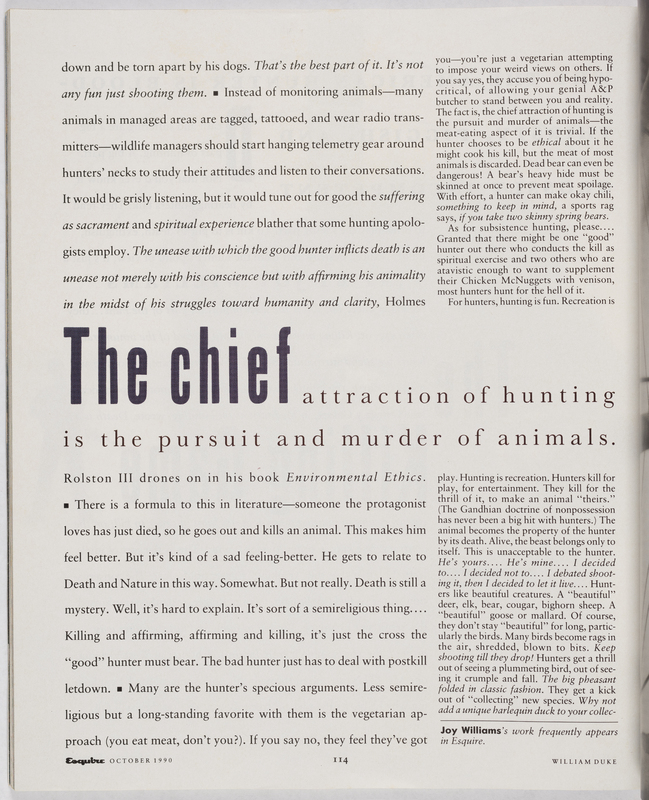 - In this biting essay, Williams takes on hunters with a vengeance (in a magazine for men, no less!) resulting in an influx of angry and supportive letters to Joy and the editors.