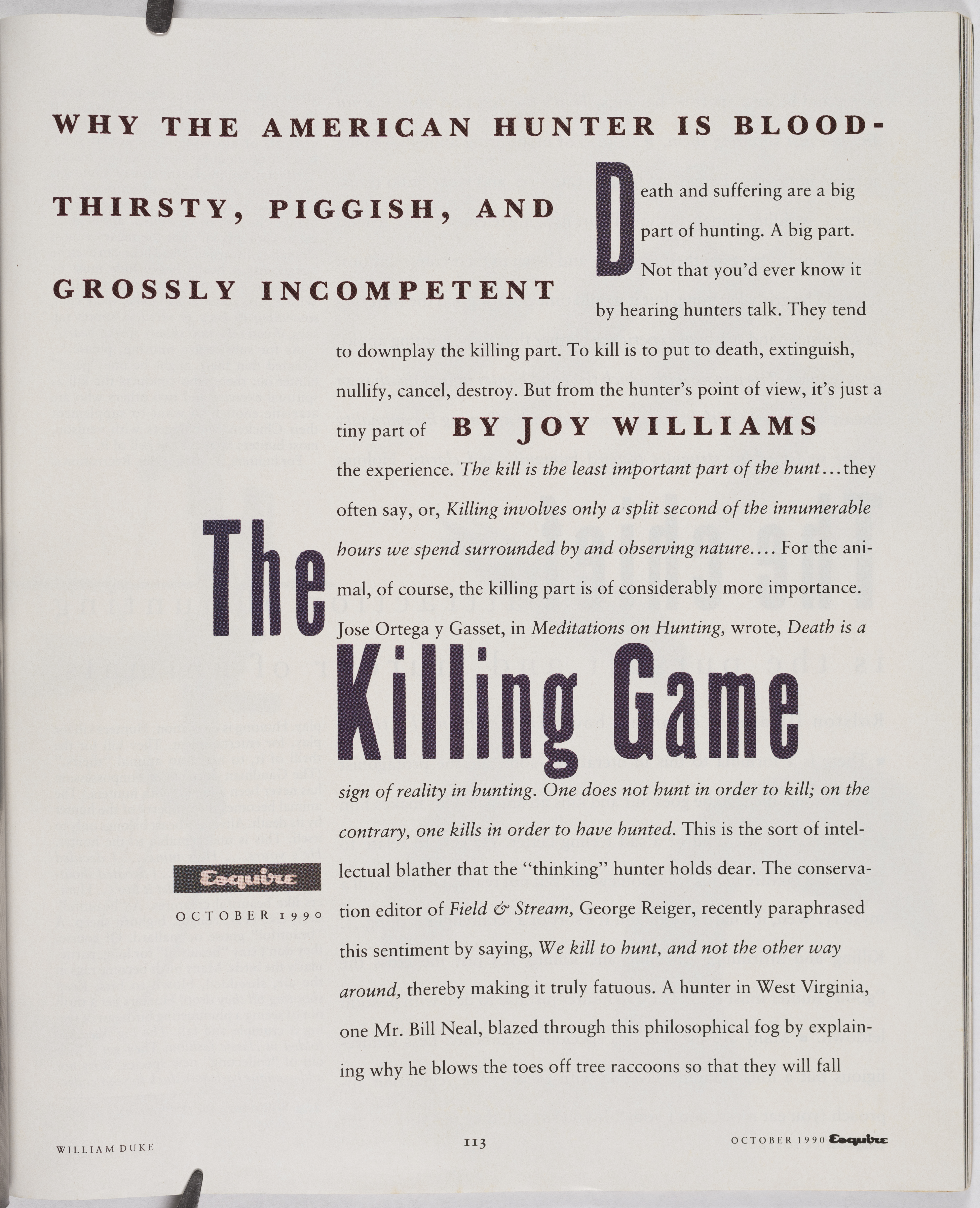Williams, Joy. 1990. “The Killing Game” and “The Sound and the Fury”. Larry A. Lahren Letter to Joy Williams. Esquire (New York, N.Y.) Volume 114, number 4, Joy Williams: Honored Guest, accessed February 11, 2026, https://digitalexhibits.library.wustl.edu/s/joy-williams/item/1166