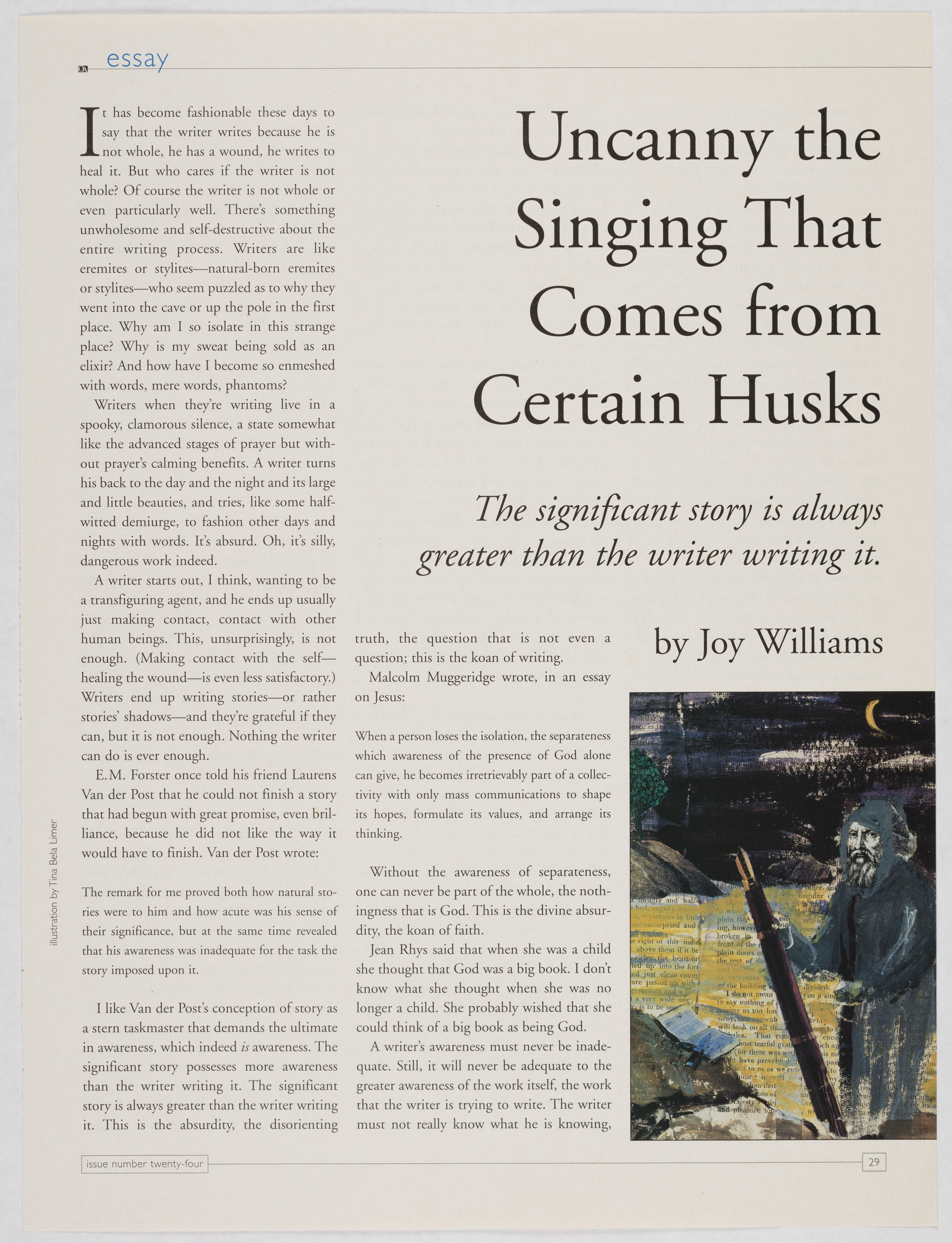 Williams, Joy. Letter. 1997. “‘Uncanny the Singing That Comes from Certain Husks’”, 1997, Joy Williams: Honored Guest, accessed February 11, 2026, https://digitalexhibits.library.wustl.edu/s/joy-williams/item/1300