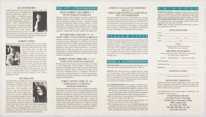 Key West Writers’ Workshop. 2000. Key West Writers’ Workshop. Key West Writers’ Workshop, Joy Williams: Honored Guest, accessed February 11, 2026, https://digitalexhibits.library.wustl.edu/s/joy-williams/item/1309