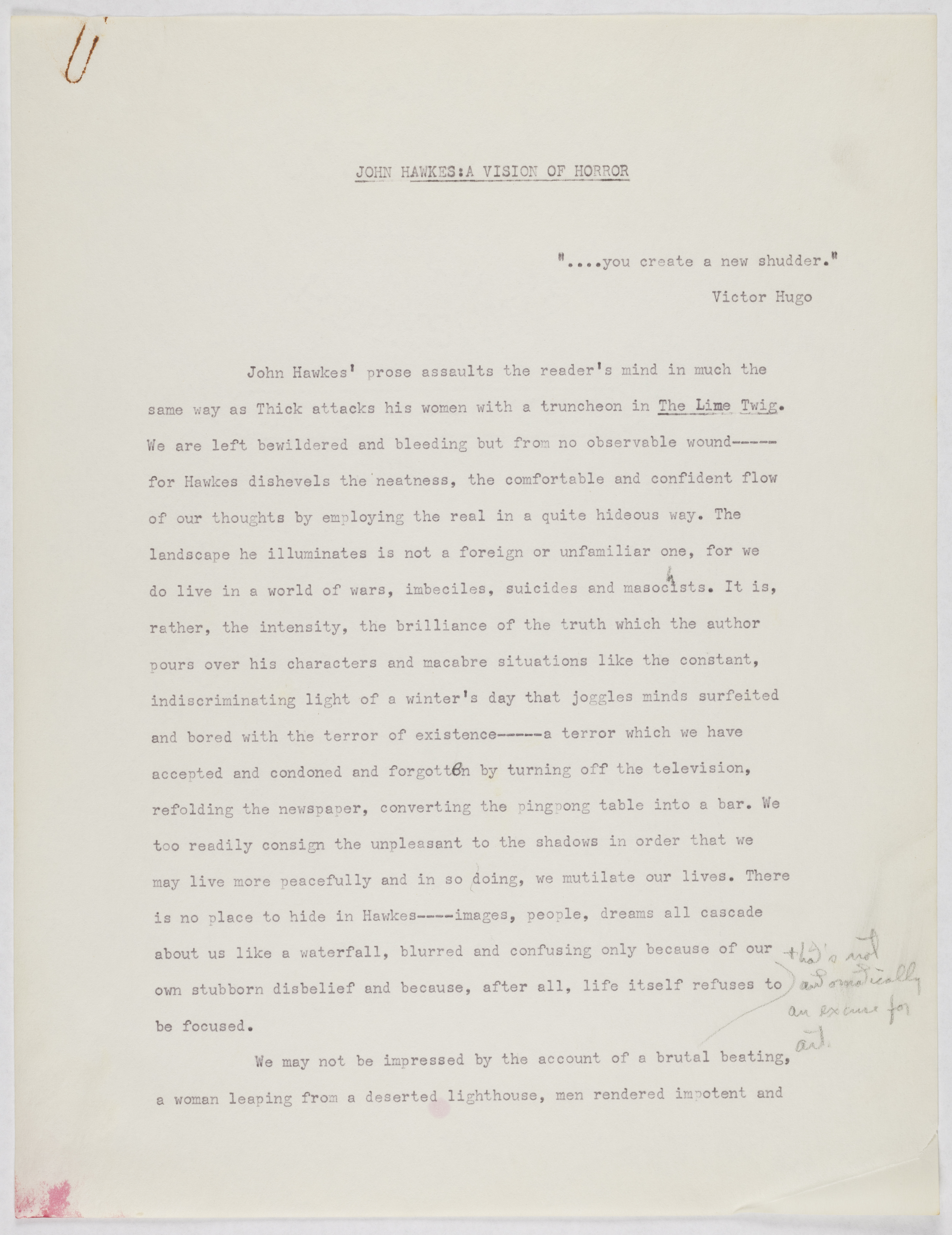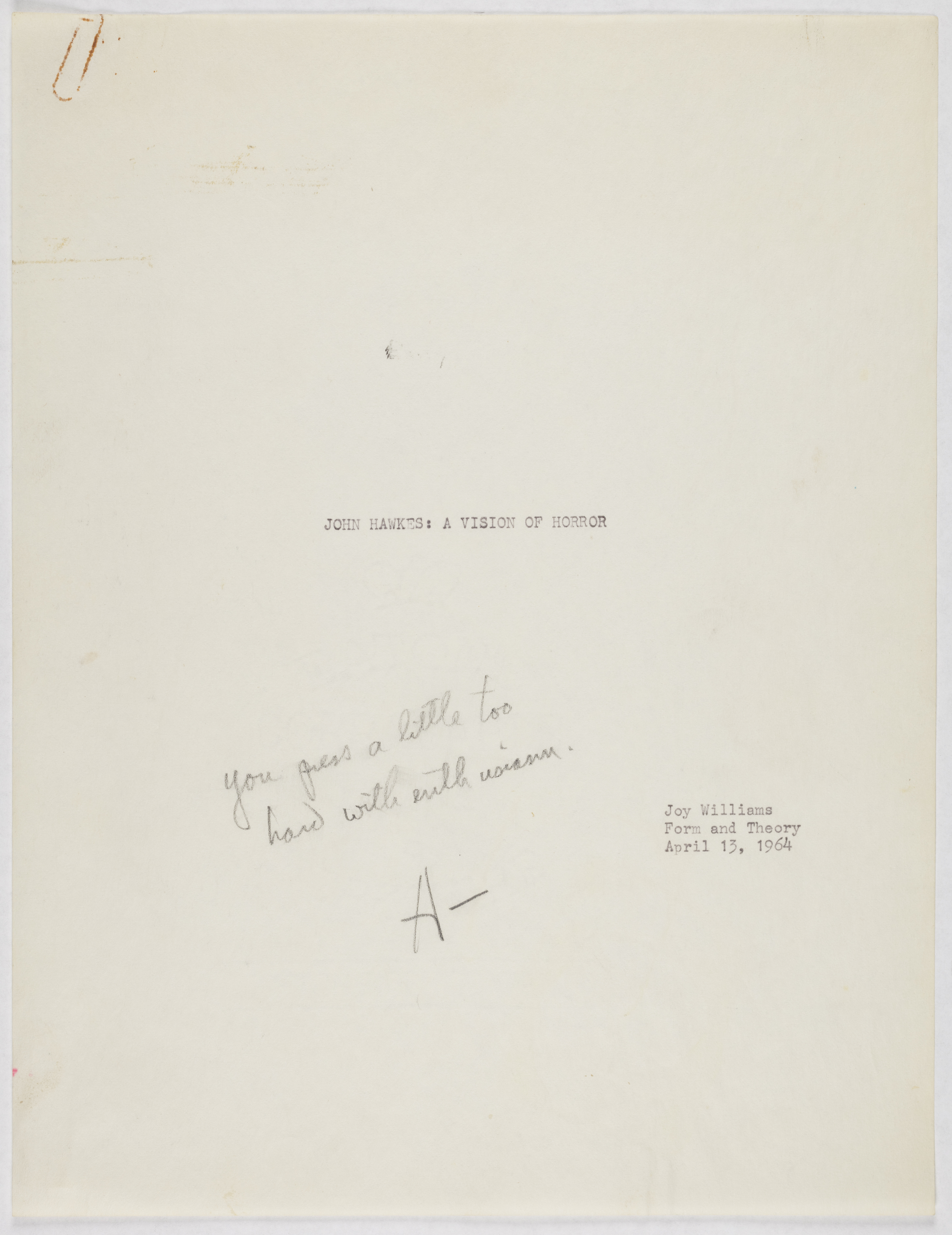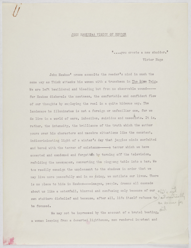 Williams, Joy. 1964. "John Hawkes: A Vision of Horror". Not published, Joy Williams: Honored Guest, accessed February 11, 2026, https://digitalexhibits.library.wustl.edu/s/joy-williams/item/906