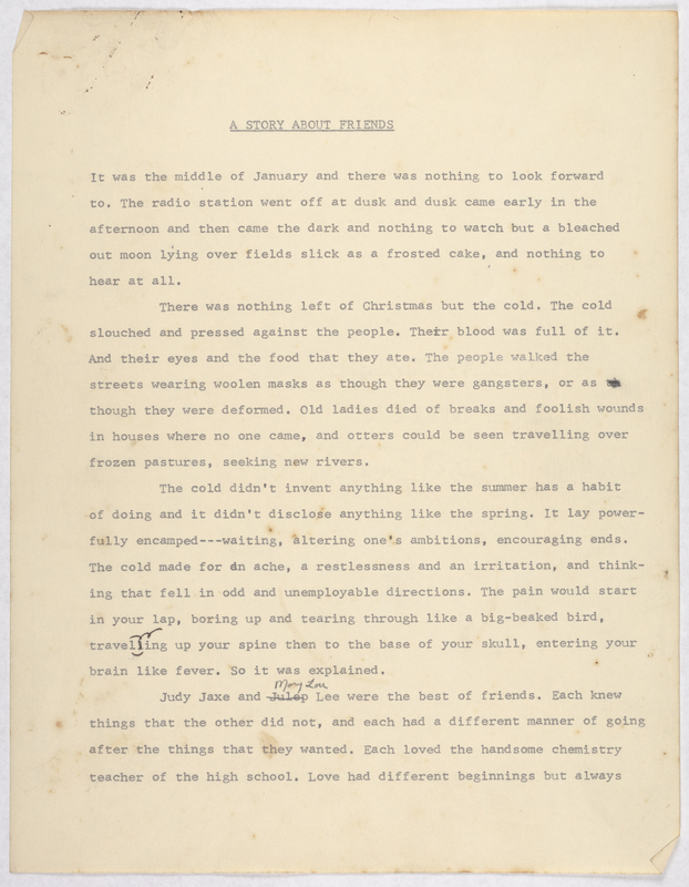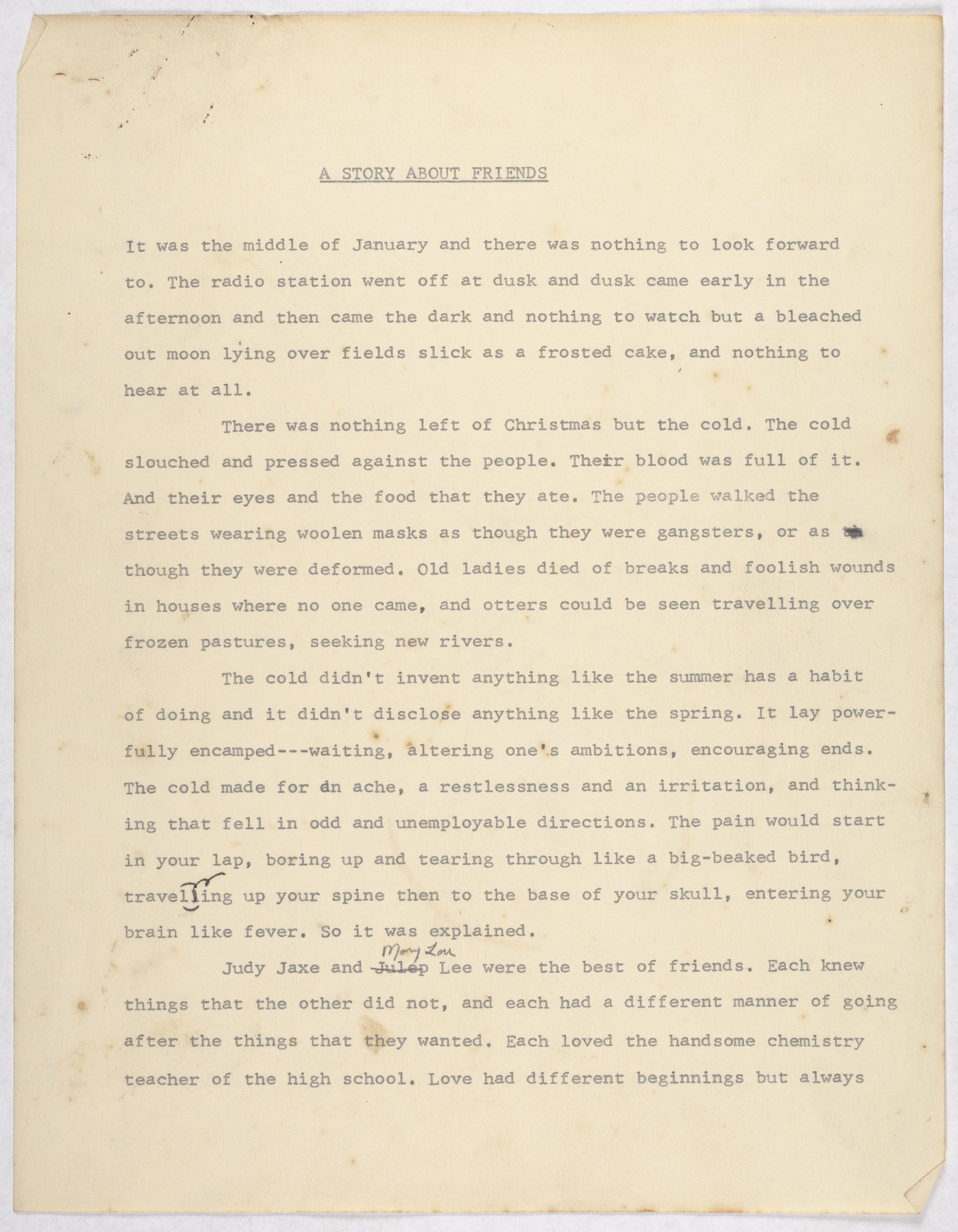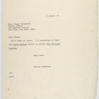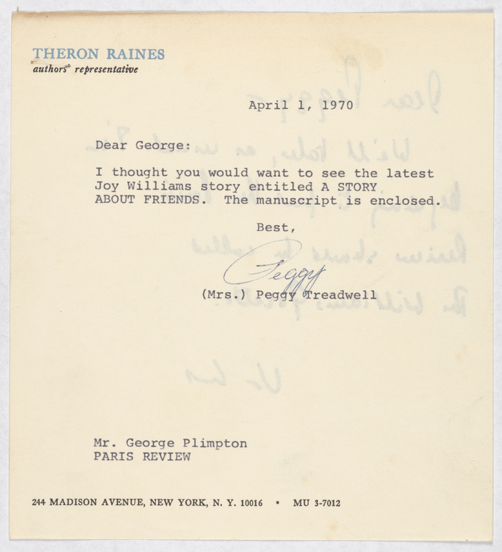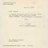 Williams, Joy, Plimpton, George, and Treadwell, Peggy. Letter. 1968. “‘A Story About Friends’ Typescript and Correspondence”, 1968, Joy Williams: Honored Guest, accessed February 11, 2026, https://digitalexhibits.library.wustl.edu/s/joy-williams/item/914