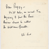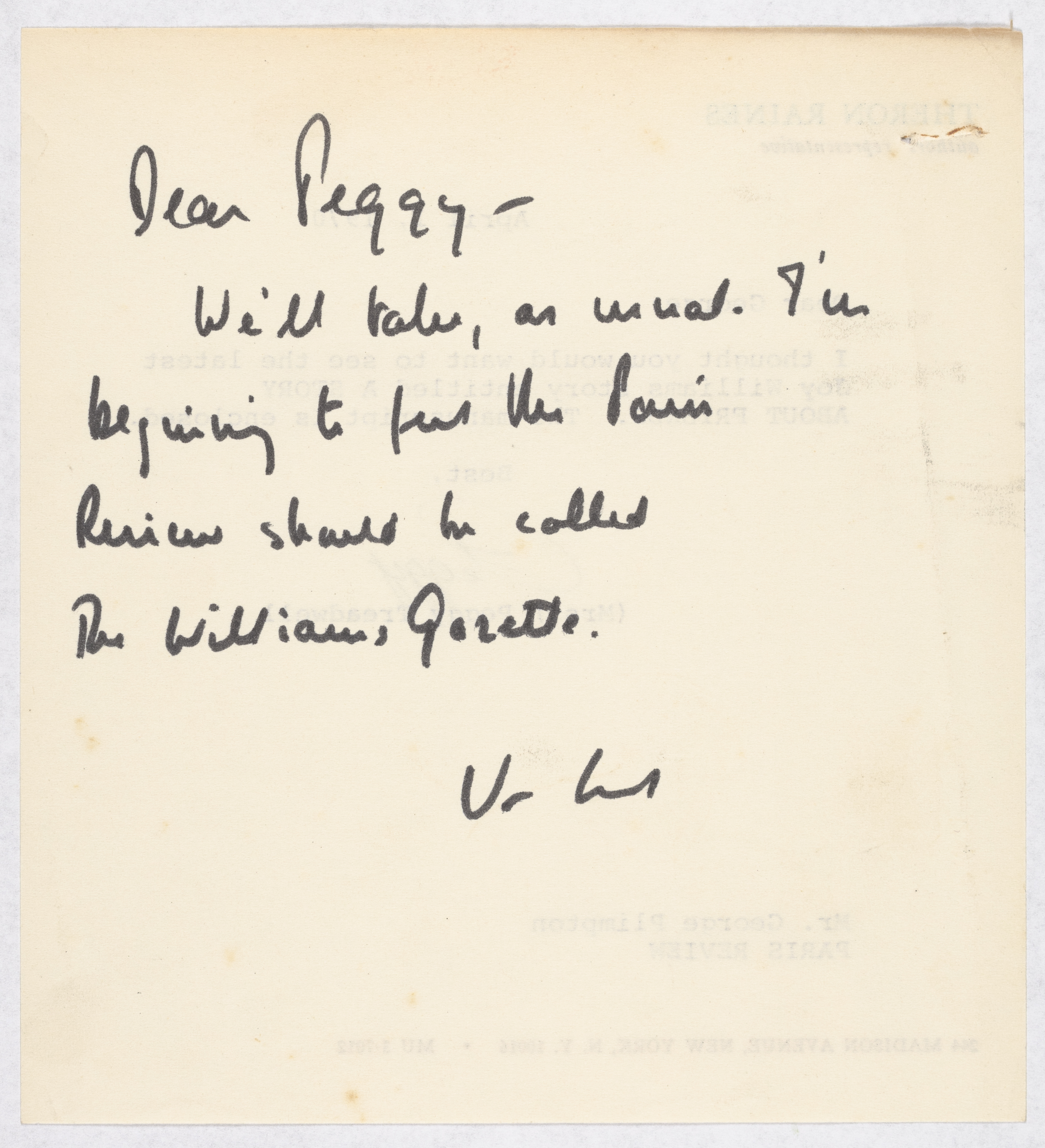 - Cover note from Peggy Treadwell, agent for Joy Williams, and holograph response on the verso from George Plimpton, publisher of The Paris Review, and a typescript transcription of his note.
