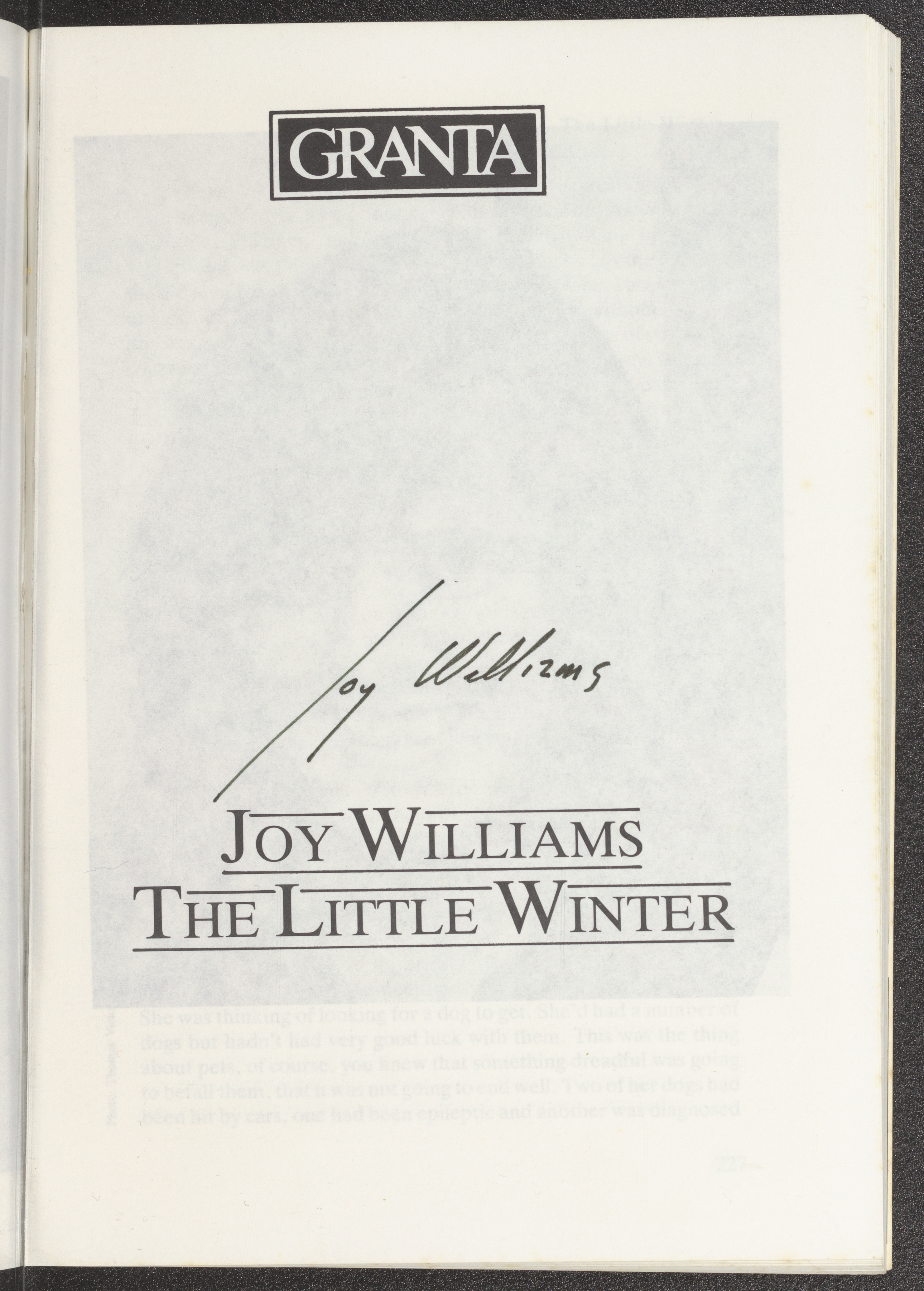 Williams, Joy. 1988. "The Little Winter" by Joy Williams. "The Little Winter" Holograph Note and Typescript. Granta (Autumn 1989), Joy Williams: Honored Guest, accessed February 11, 2026, https://digitalexhibits.library.wustl.edu/s/joy-williams/item/916