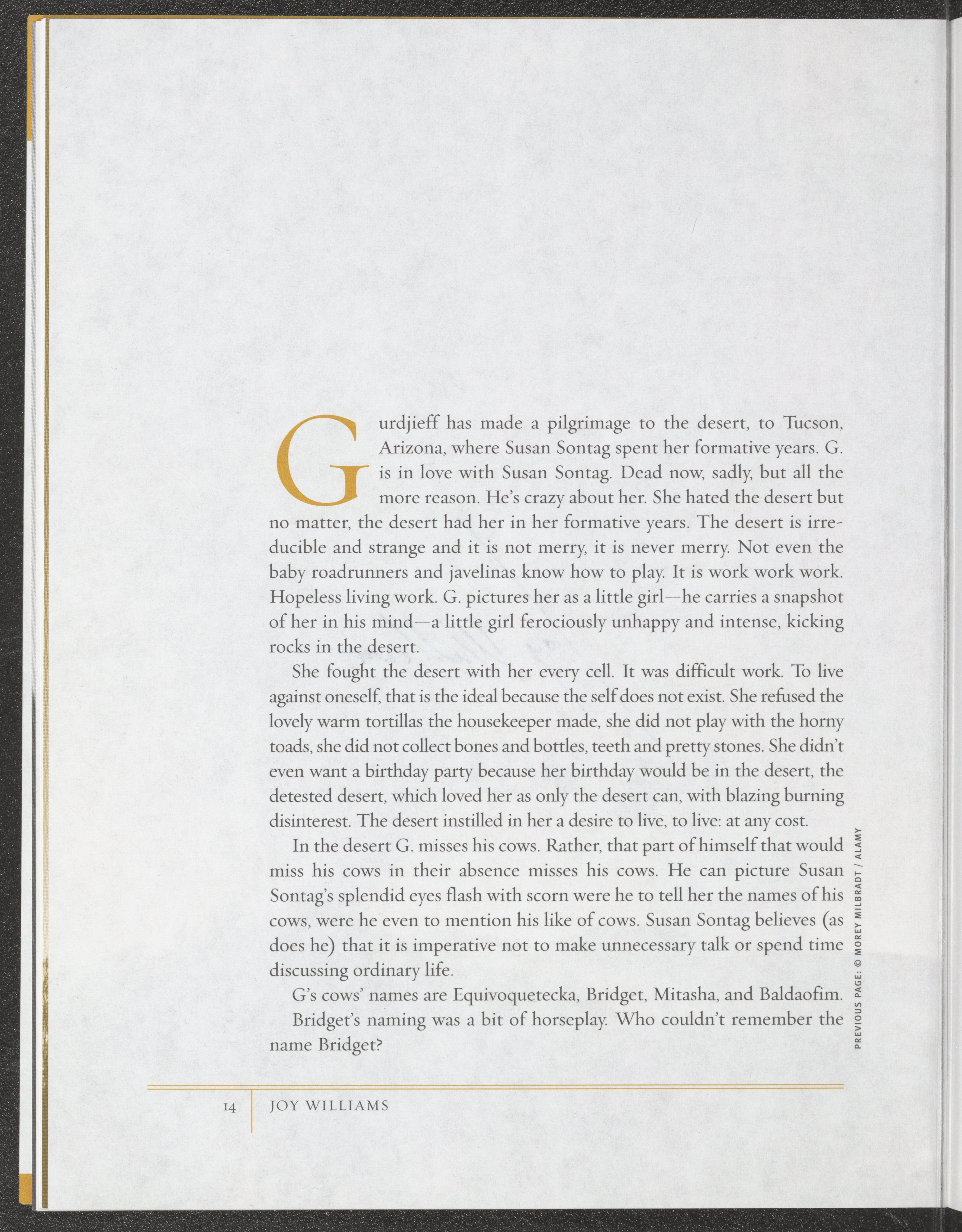 - The titular characters in this unusual story are the Russian mystic George Gurdjieff and American essayist Susan Sontag, and the setting is Williams’ adopted hometown, Tucson, AZ.