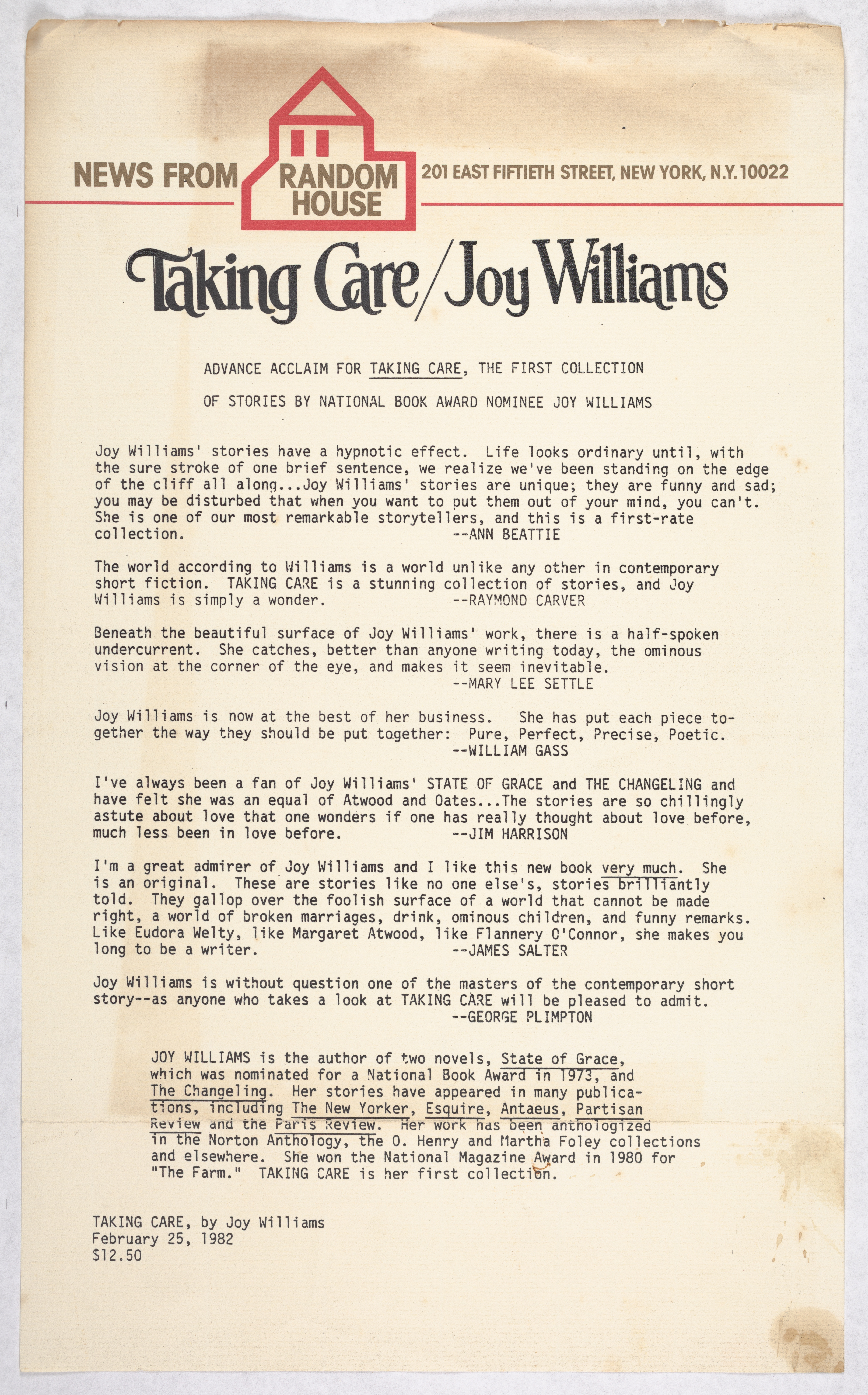 Random House. Letter. 2000. “News from Random House”, 2000, Joy Williams: Honored Guest, accessed February 11, 2026, https://digitalexhibits.library.wustl.edu/s/joy-williams/item/921