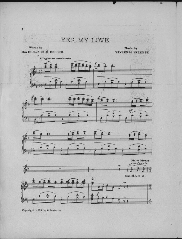 Yes, my love : song / [words by Miss Eleanor M. Record ; music by Vincenzo Valente].
