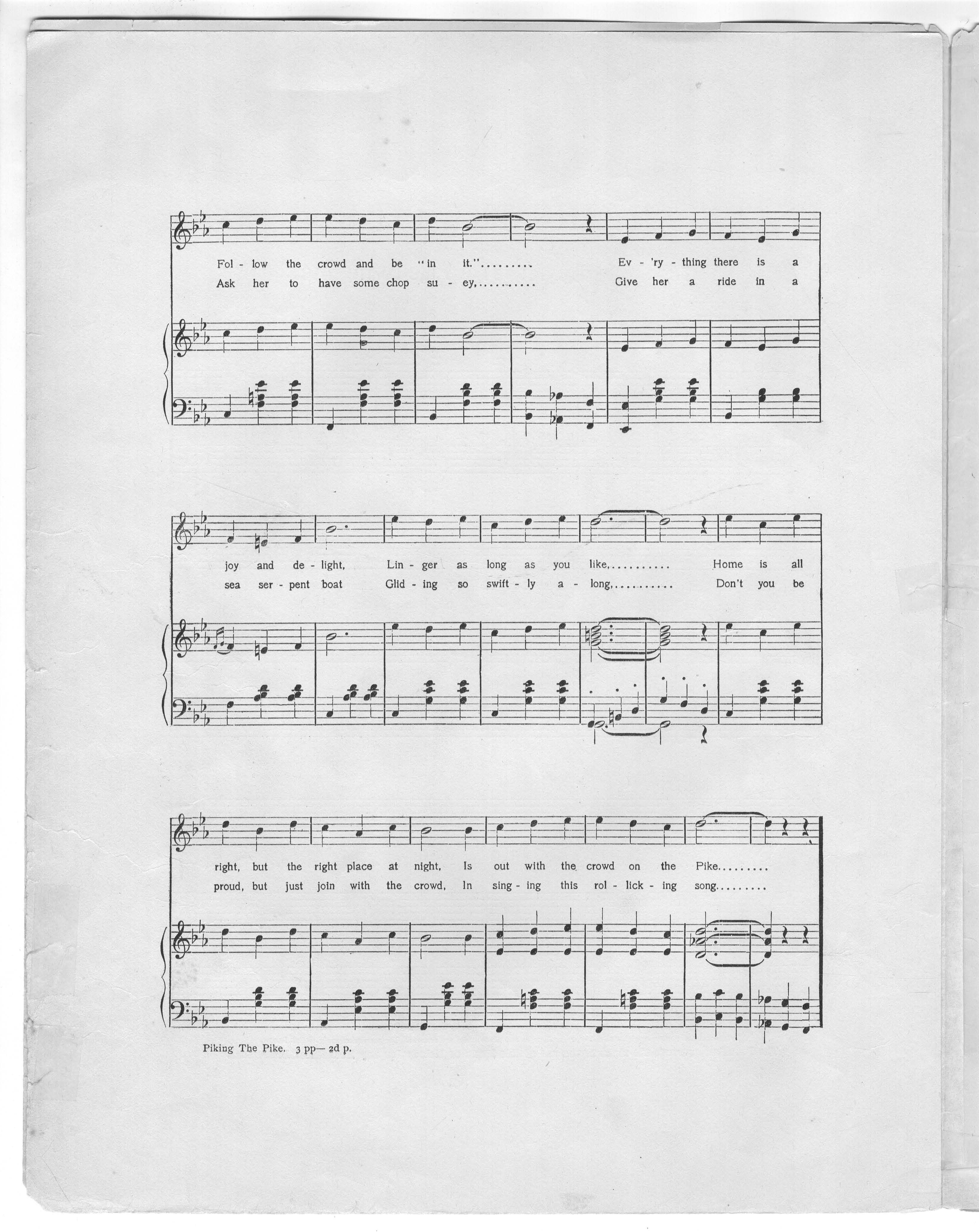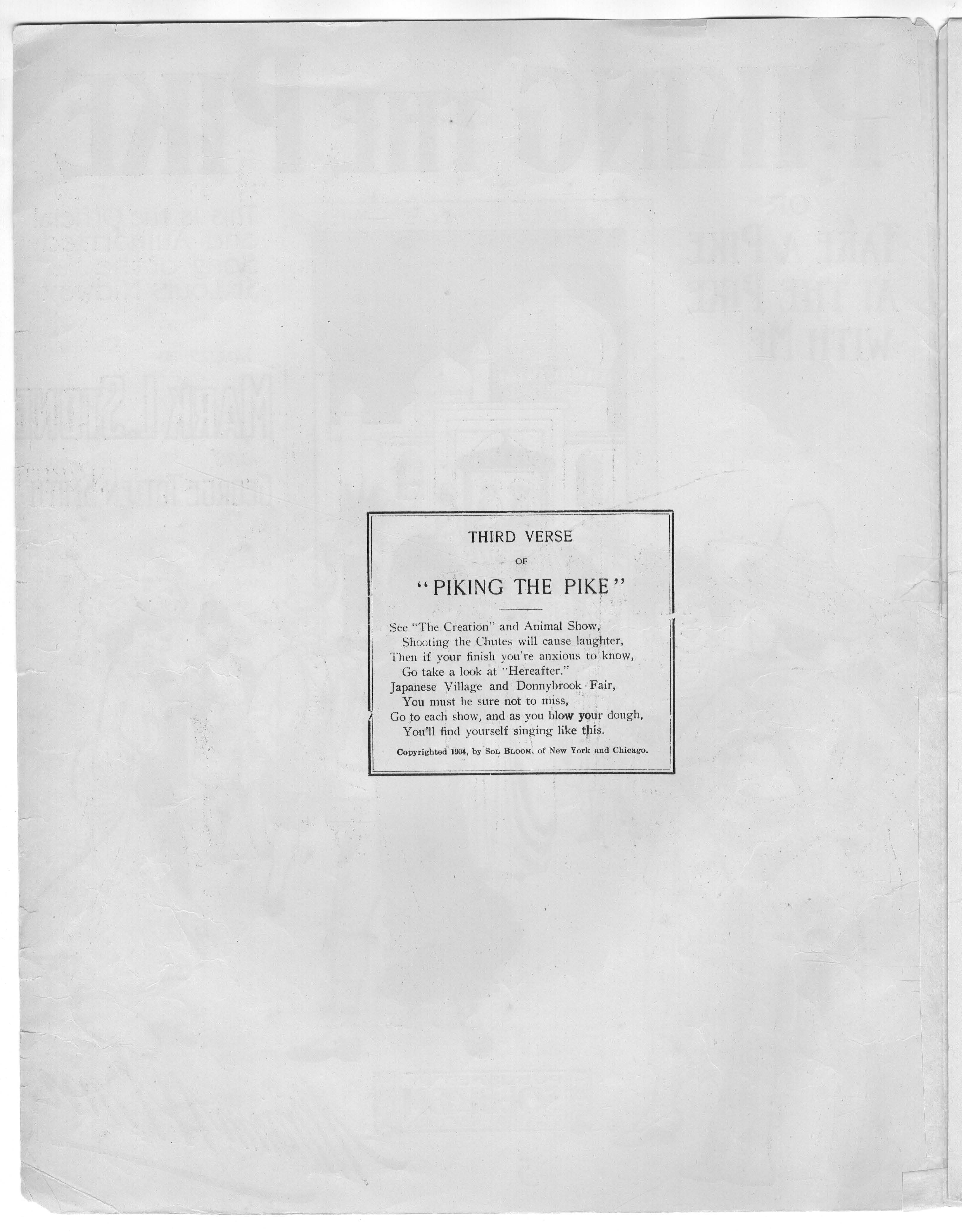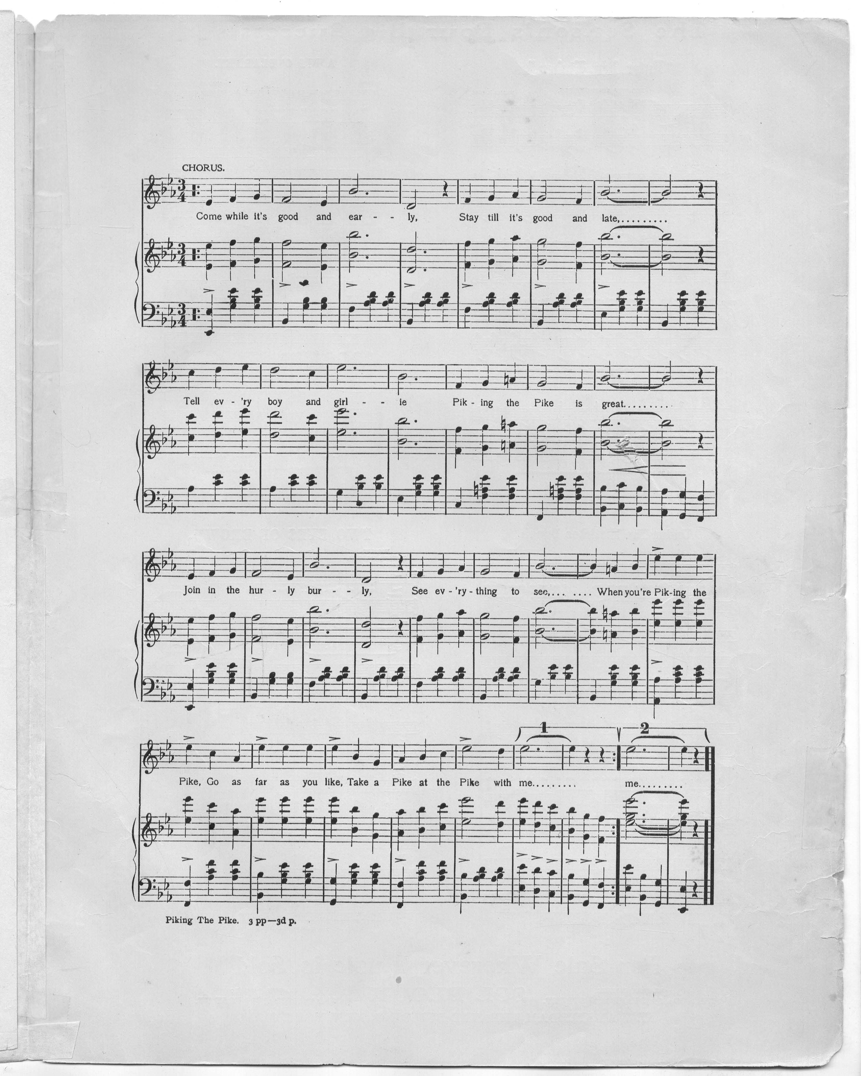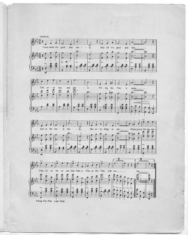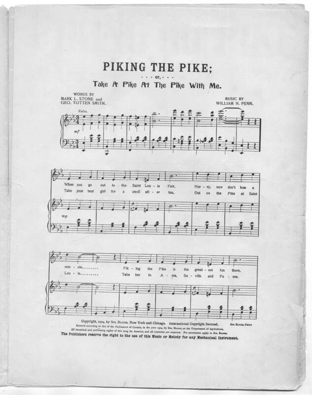 Penn, William H. 2000. “Piking the Pike, Or, Take a Pike at the Pike With Me Words by Mark L. Stone and George Totten Smith; Music by William H. Penn”. New York : Sol Bloom, Class, Race, and Sheet Music at the Louisiana Purchase Exposition, accessed February 12, 2026, https://digitalexhibits.library.wustl.edu/s/lpemusic/item/17111