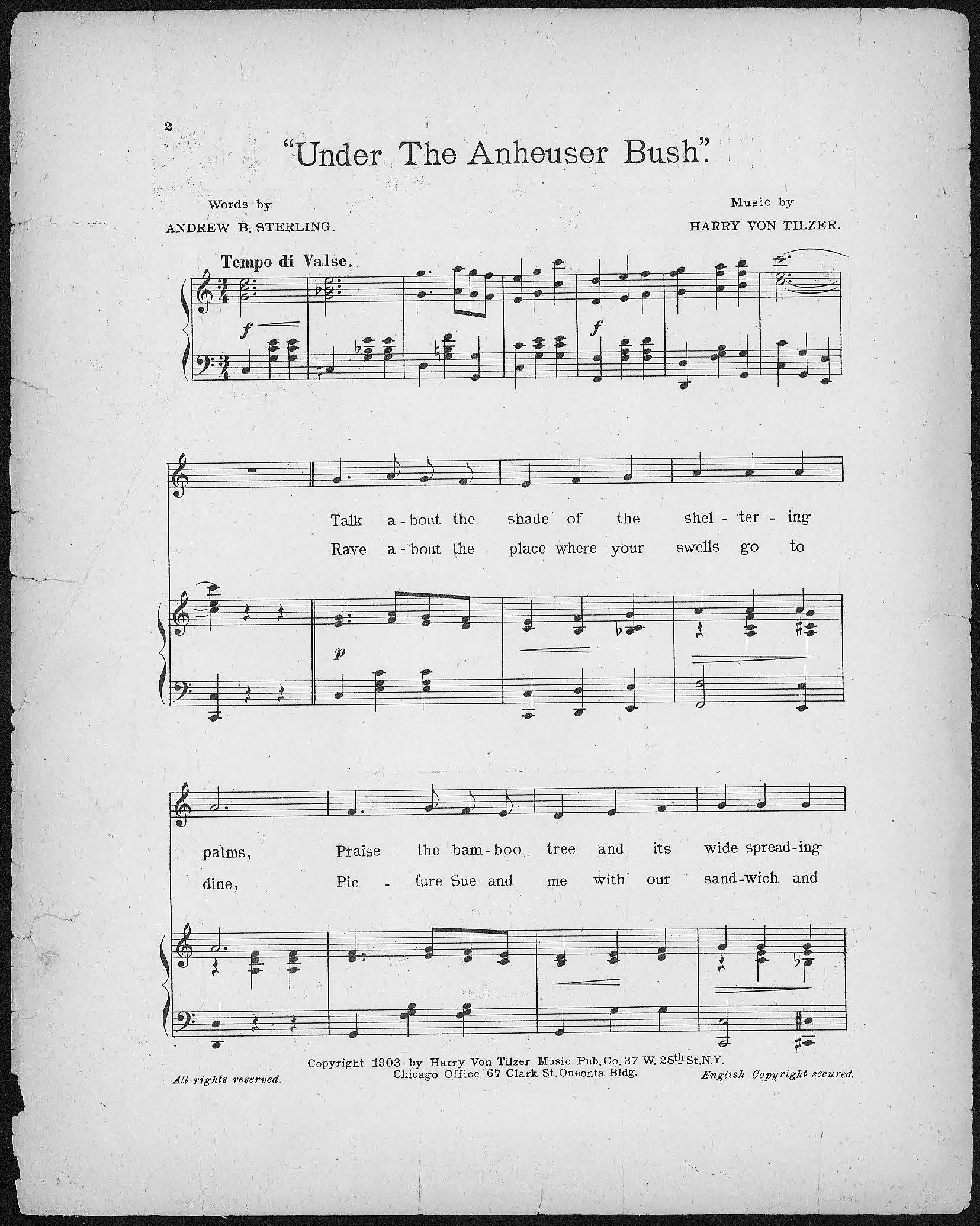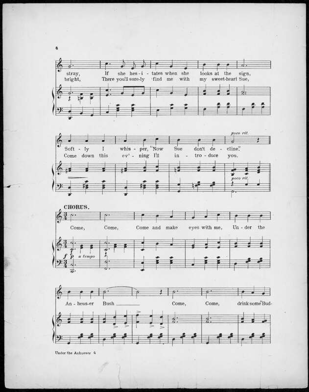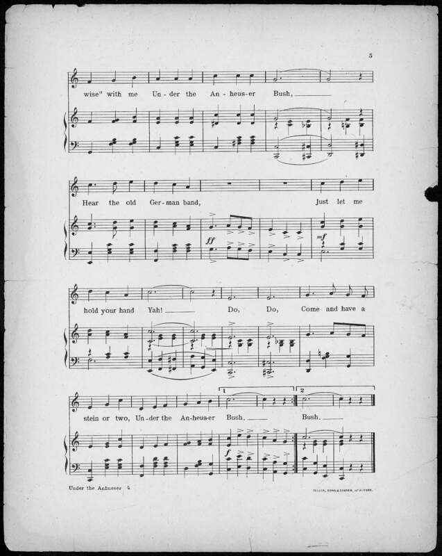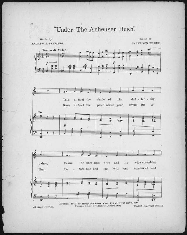 Von Tilzer, Harry, 1872-1946. 2000. Under the Anheuser Bush Music by Harry Von Tilzer ; Words by Andrew B. Sterling.. New York (37 W. 28th St.) : Harry Von Tilzer Music Publishing Co, Class, Race, and Sheet Music at the Louisiana Purchase Exposition, accessed February 11, 2026, https://digitalexhibits.library.wustl.edu/s/lpemusic/item/35488