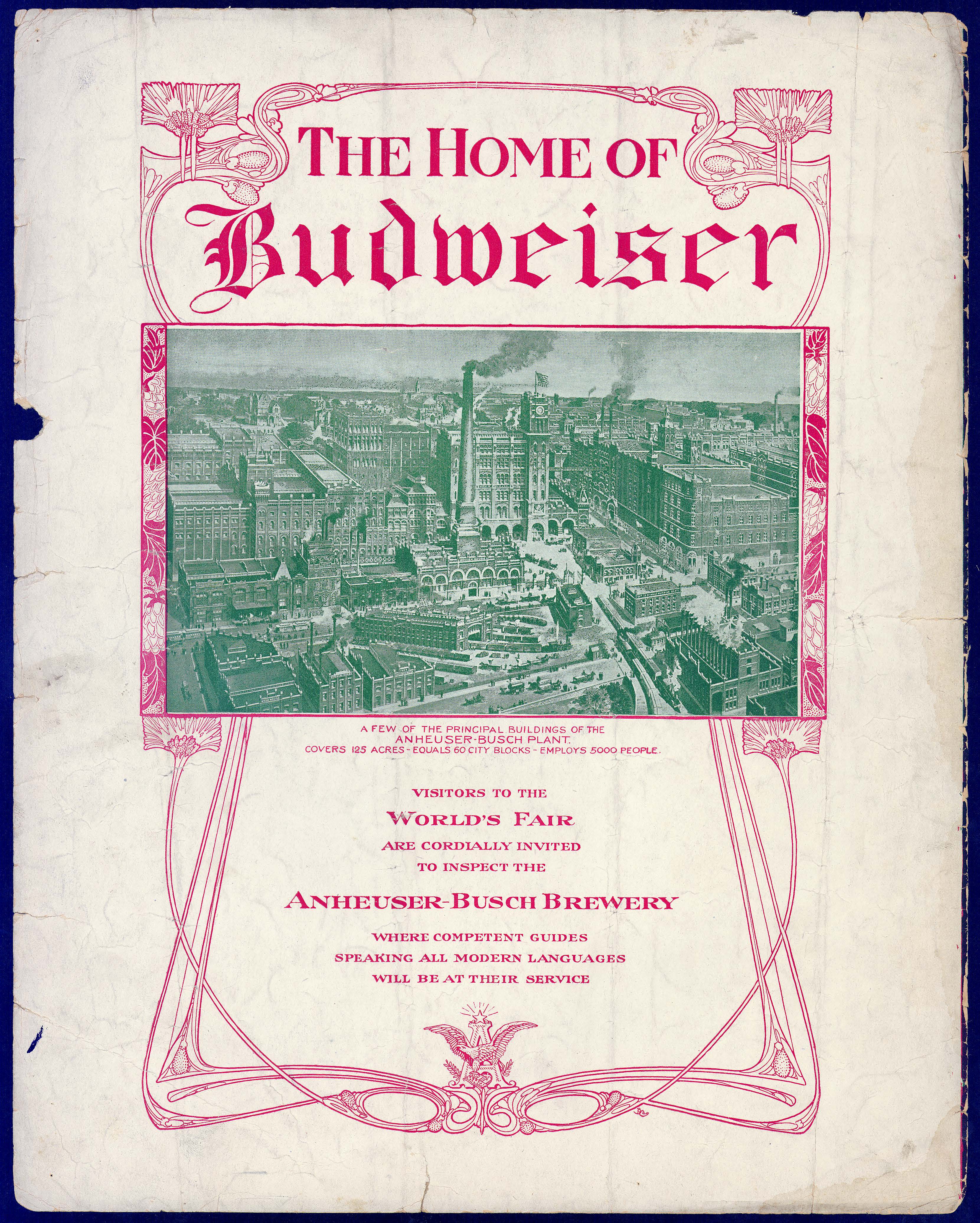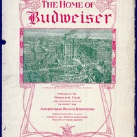 - Illustration on p. [6] shows an aerial view of the principal buildings of the Anheuser-Busch plant, "The Home of Budweiser," with an invitation for visitors to the World's Fair to tour the facility.