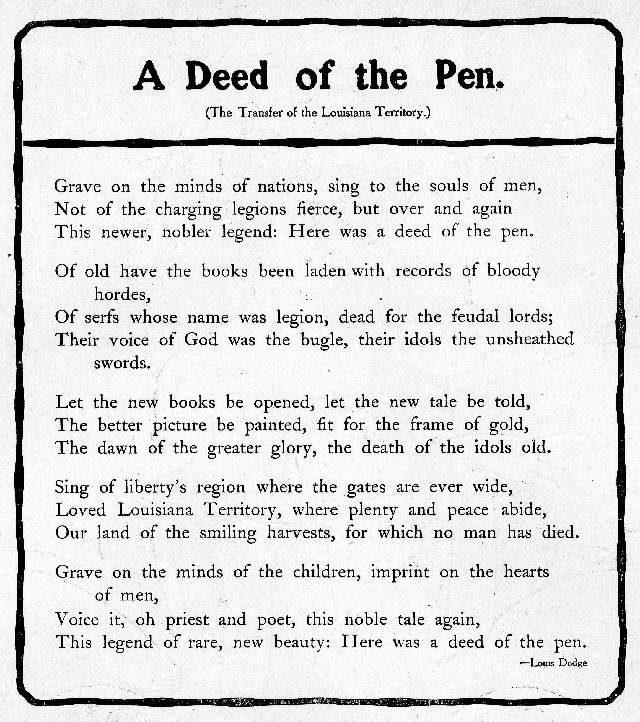 Dodge, Louis. 2000. “[Poetry - -Deed of the Pen]”. Empire Pub. Co, Class, Race, and Sheet Music at the Louisiana Purchase Exposition, accessed February 12, 2026, https://digitalexhibits.library.wustl.edu/s/lpemusic/item/35492