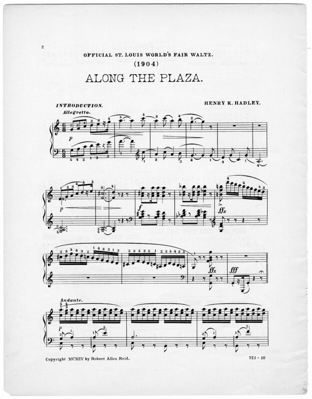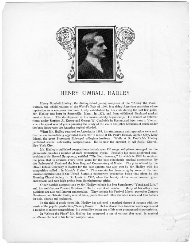 Hadley, Henry Kimball, 1871-1937. 2000. Along the Plaza : Waltzes By Henry K. Hadley.. St. Louis, U.S.A. : Thiebes-Stierlin Music Co, Class, Race, and Sheet Music at the Louisiana Purchase Exposition, accessed February 11, 2026, https://digitalexhibits.library.wustl.edu/s/lpemusic/item/3566