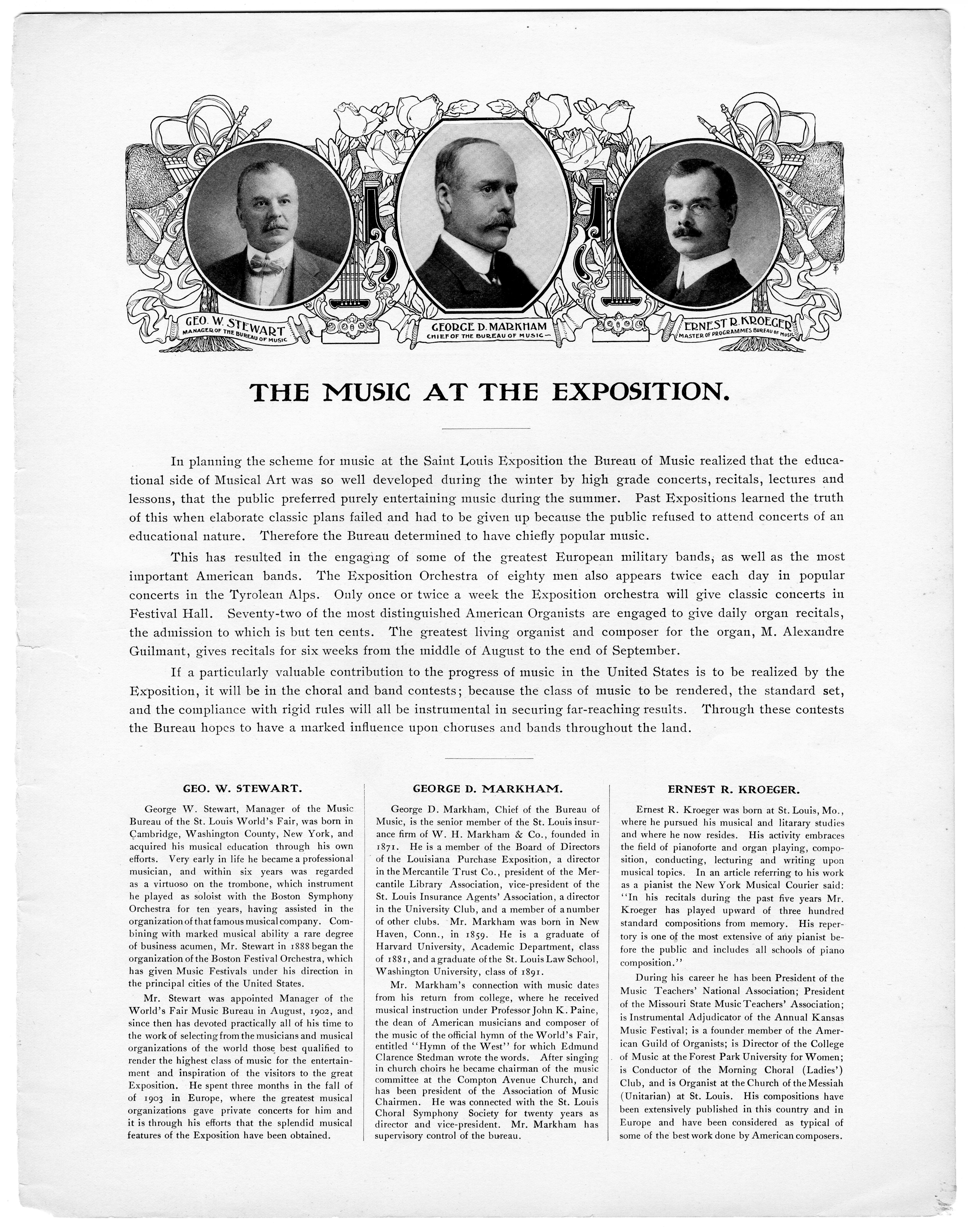 - "The music at the Exposition" (description of musical program of the Fair, with portraits and biographical sketches of Geo. W. Stewart, George D. Markham, and Ernest R. Kroeger): p. [13].