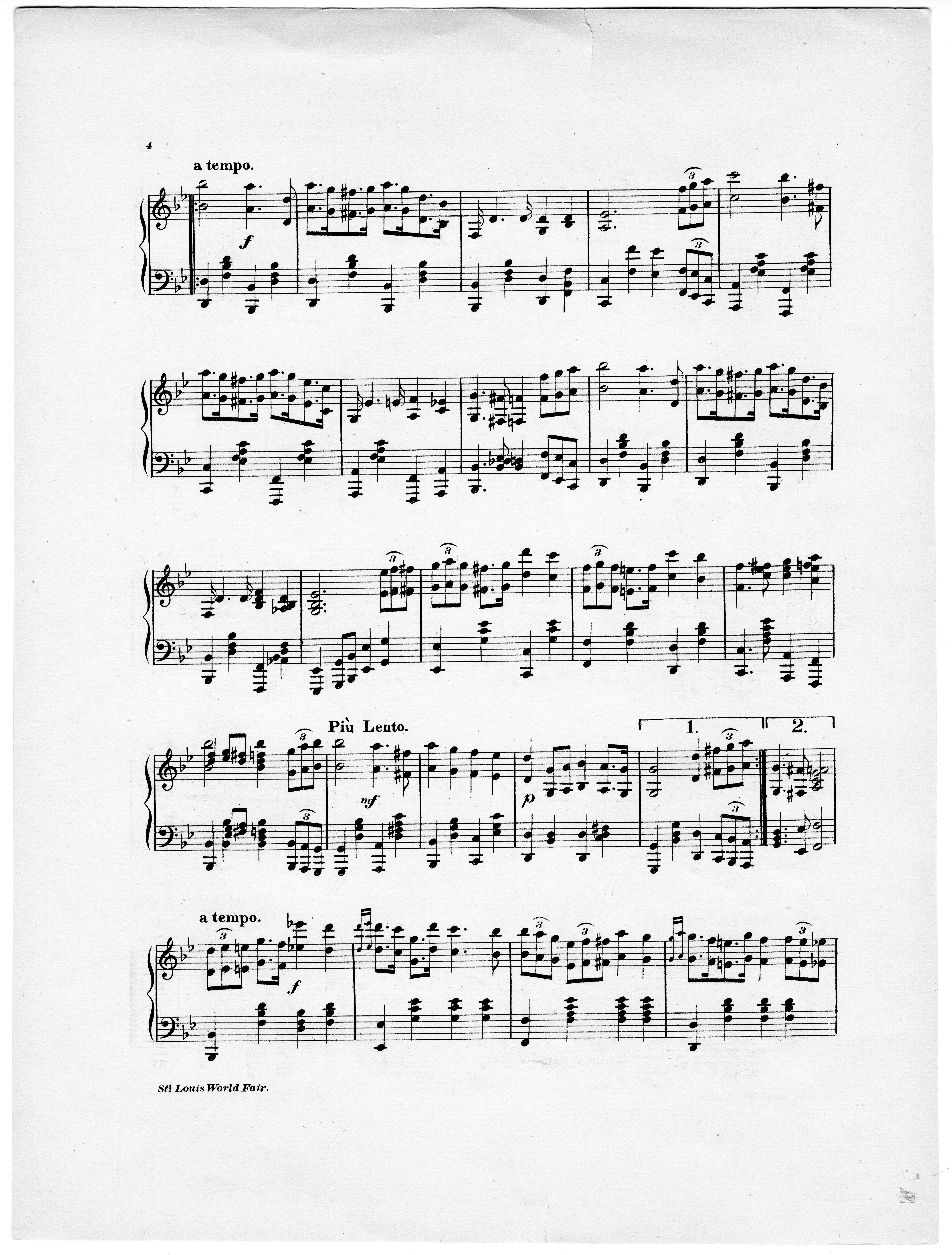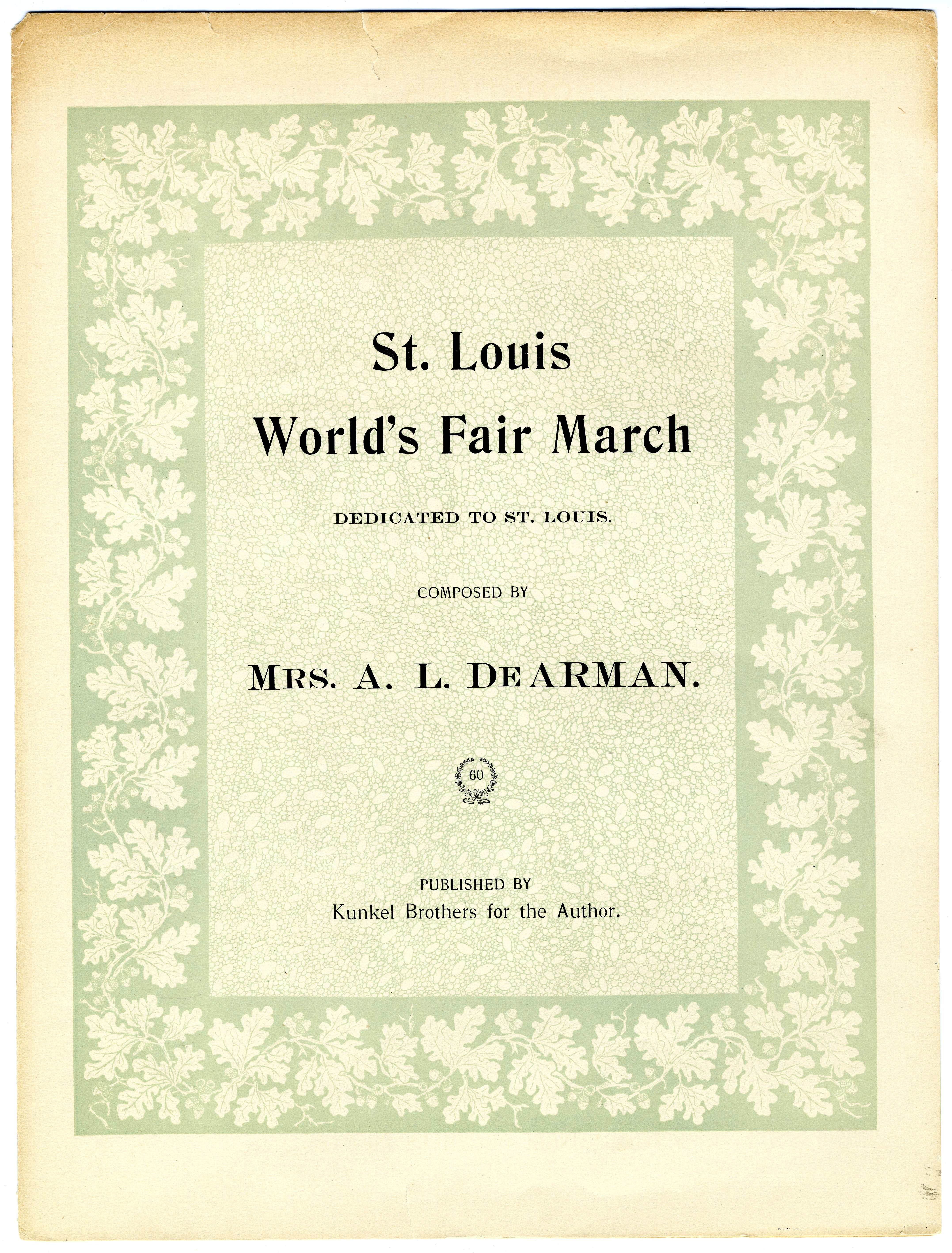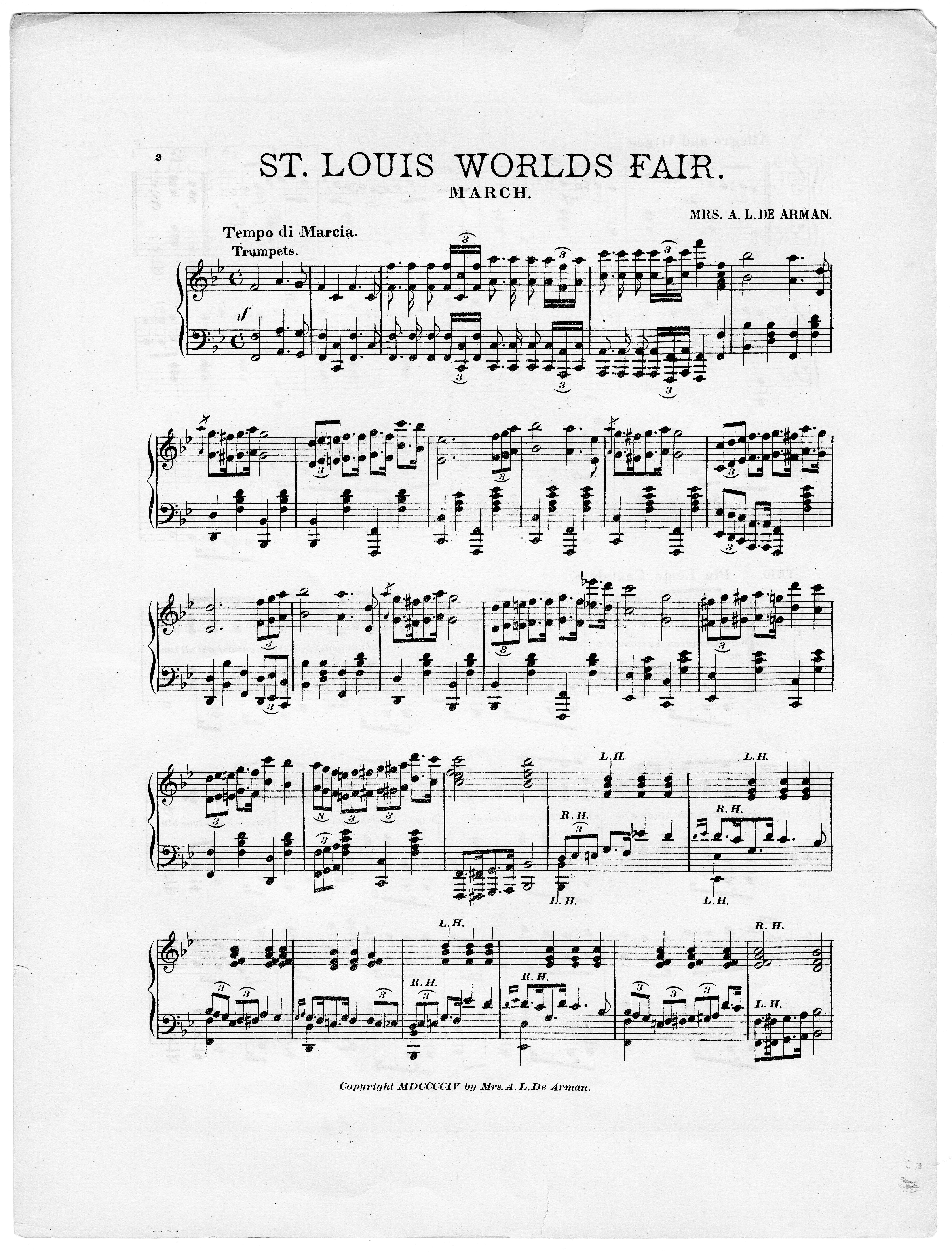 De Arman, A. L., Mrs. 2000. “St. Louis World’s Fair March Composed by Mrs. A. L. De Arman”. [St. Louis, Mo.]: published by Kunkel Brothers for the author, Class, Race, and Sheet Music at the Louisiana Purchase Exposition, accessed February 12, 2026, https://digitalexhibits.library.wustl.edu/s/lpemusic/item/3570
