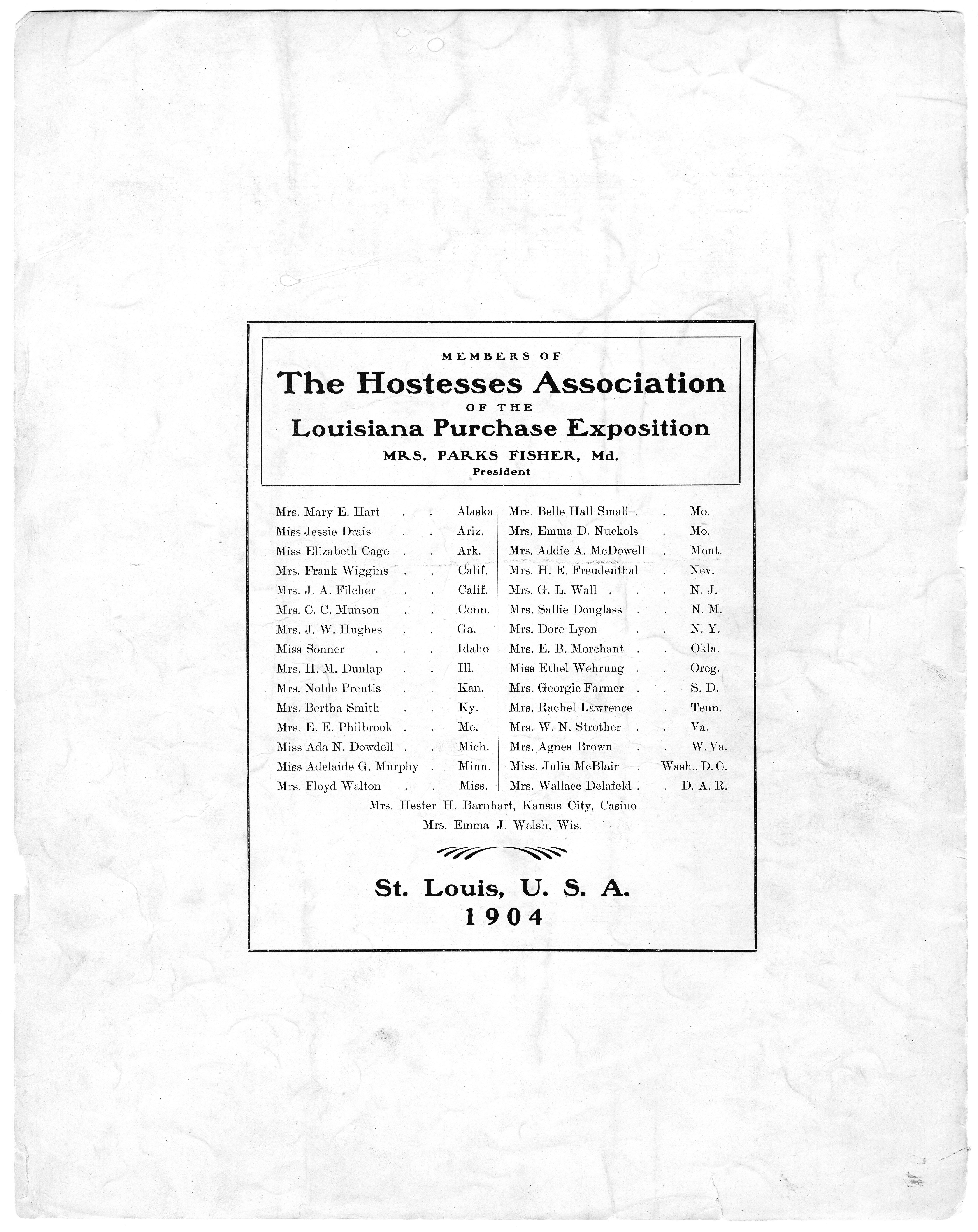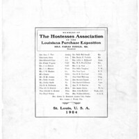- "Members of the Hostesses Association of the Louisiana Purchase Exposition, Mrs. Parks Fisher, Md., President": p. [8].