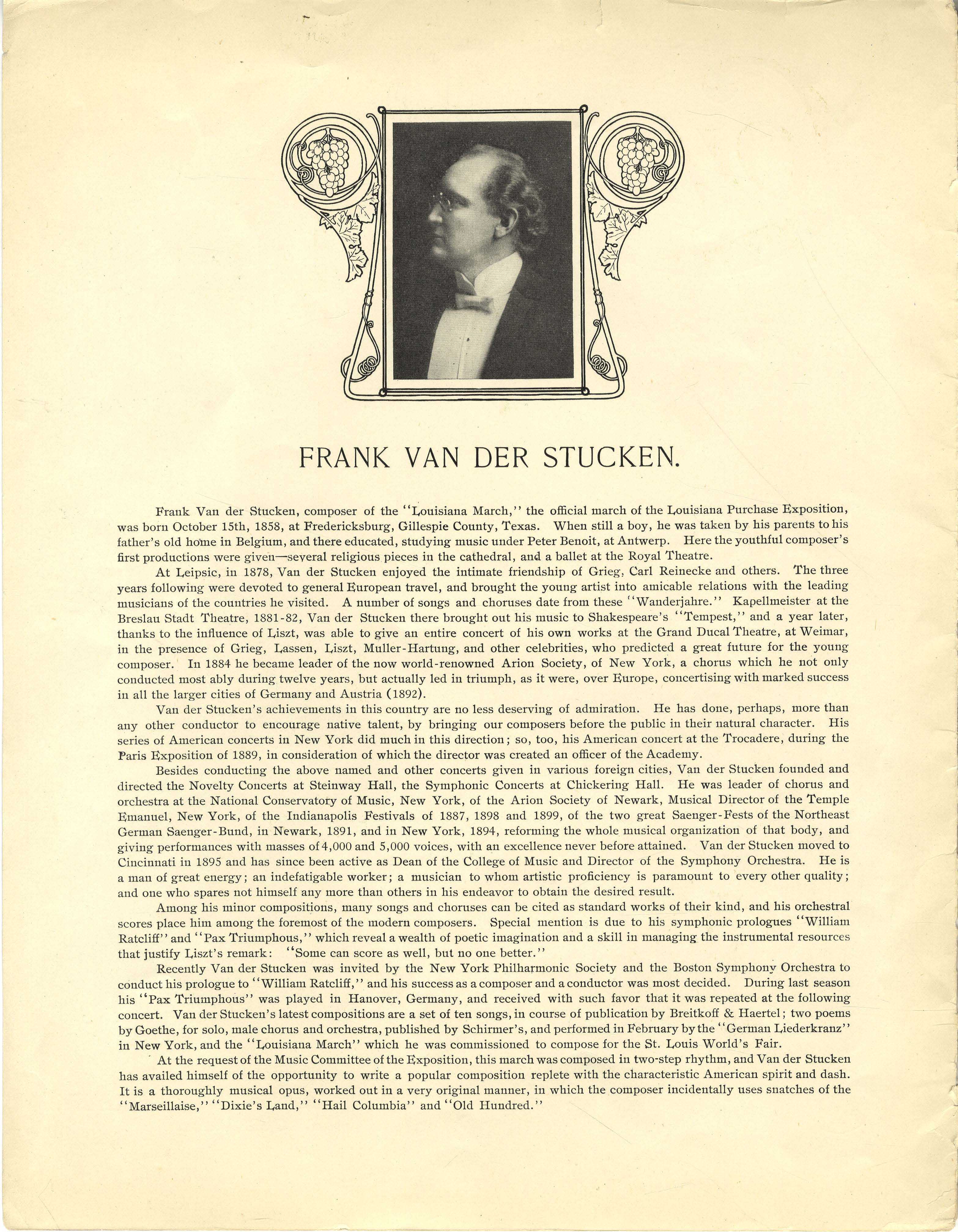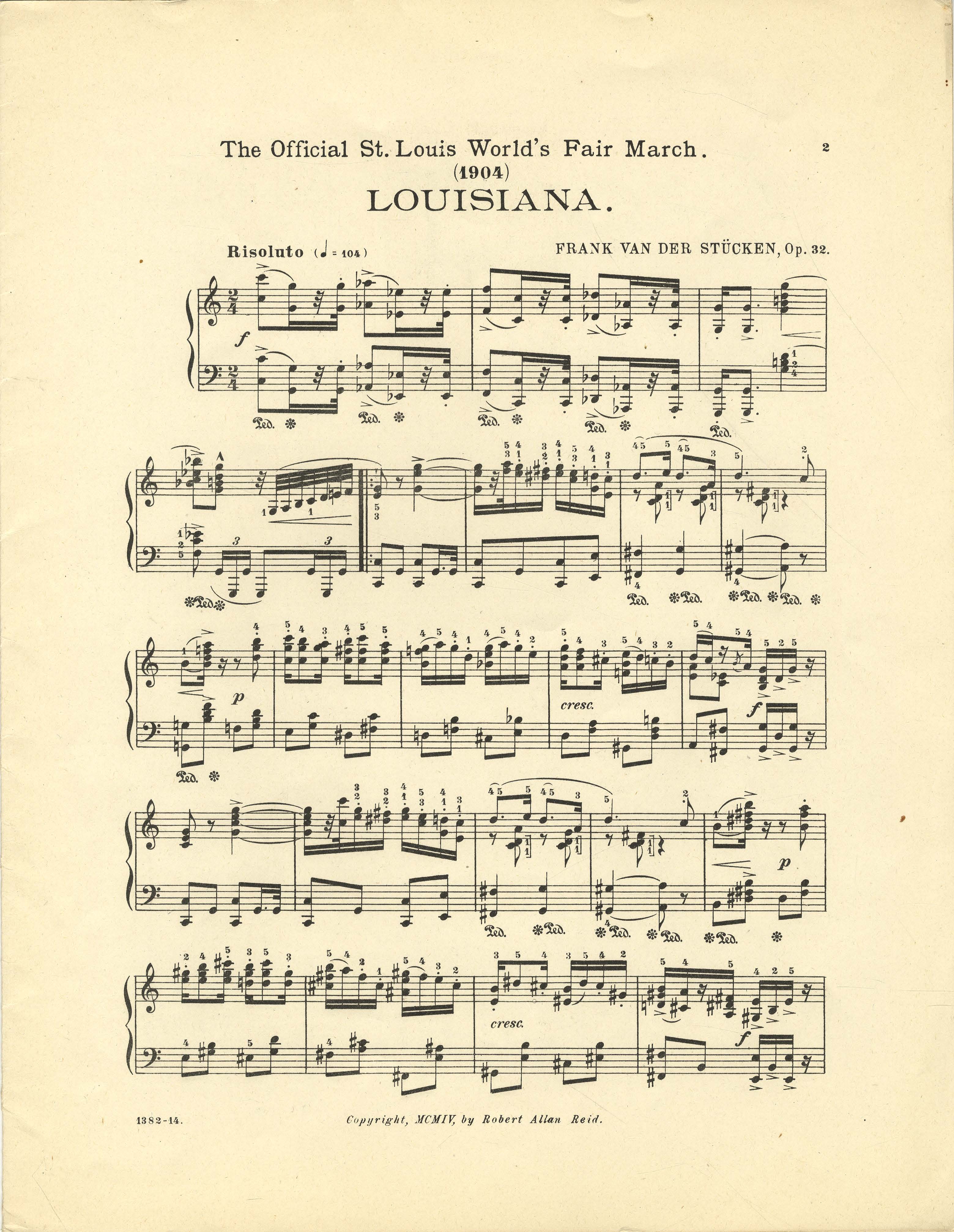 Van der Stucken, Frank V., 1858-1929. 2000. “Louisiana March By Frank Van Der Stücken”. St. Louis, U.S.A. : Thiebes-Stierlin Music Company, Class, Race, and Sheet Music at the Louisiana Purchase Exposition, accessed February 12, 2026, https://digitalexhibits.library.wustl.edu/s/lpemusic/item/3573