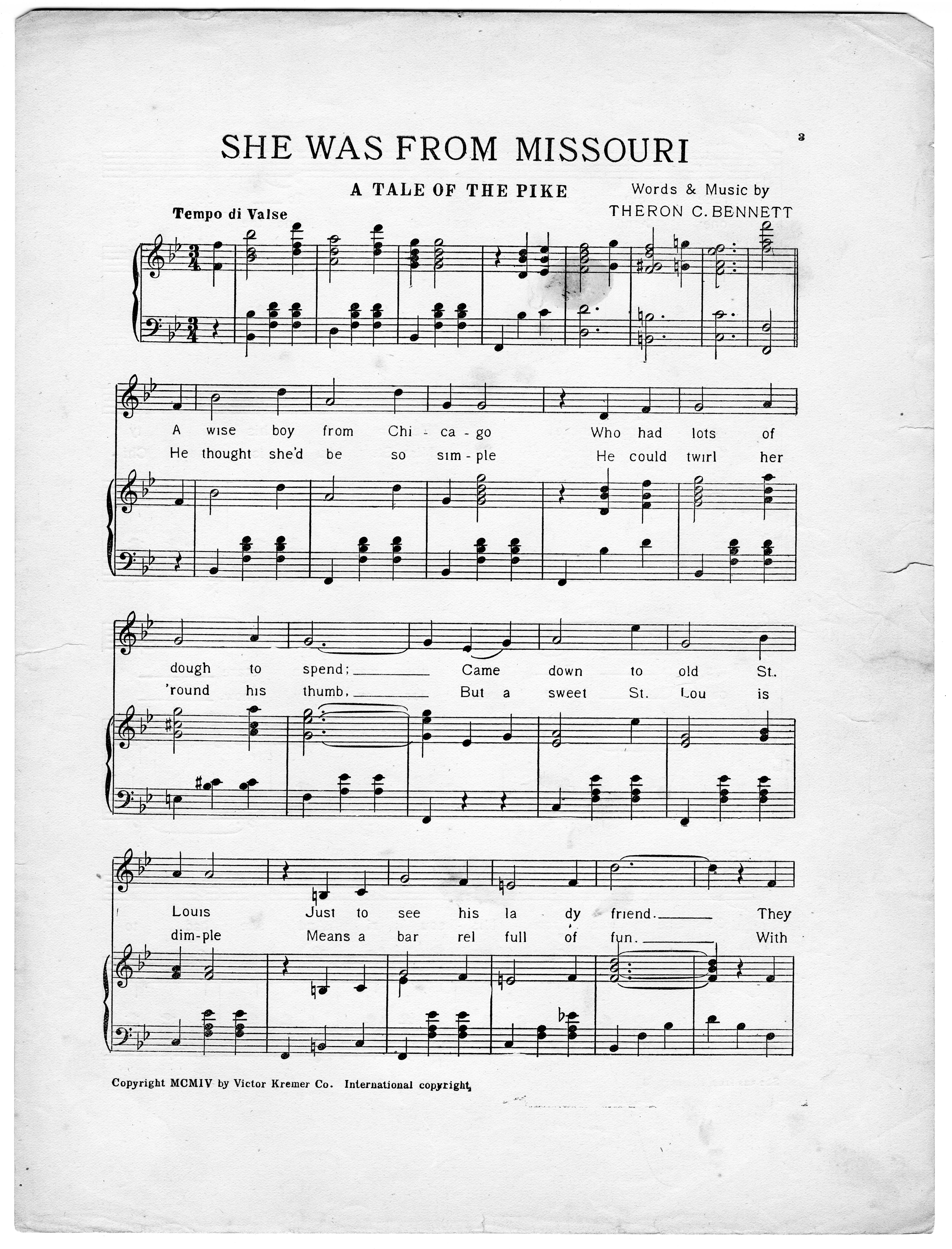 Bennett, Theron C., 1879-1937. 2000. “She Was from Missouri : a Tale of the Pike Words and Music by Theron C. Bennett”. Chicago, Ill. : Victor Kremer Co, Class, Race, and Sheet Music at the Louisiana Purchase Exposition, accessed March 5, 2026, https://digitalexhibits.library.wustl.edu/s/lpemusic/item/3585