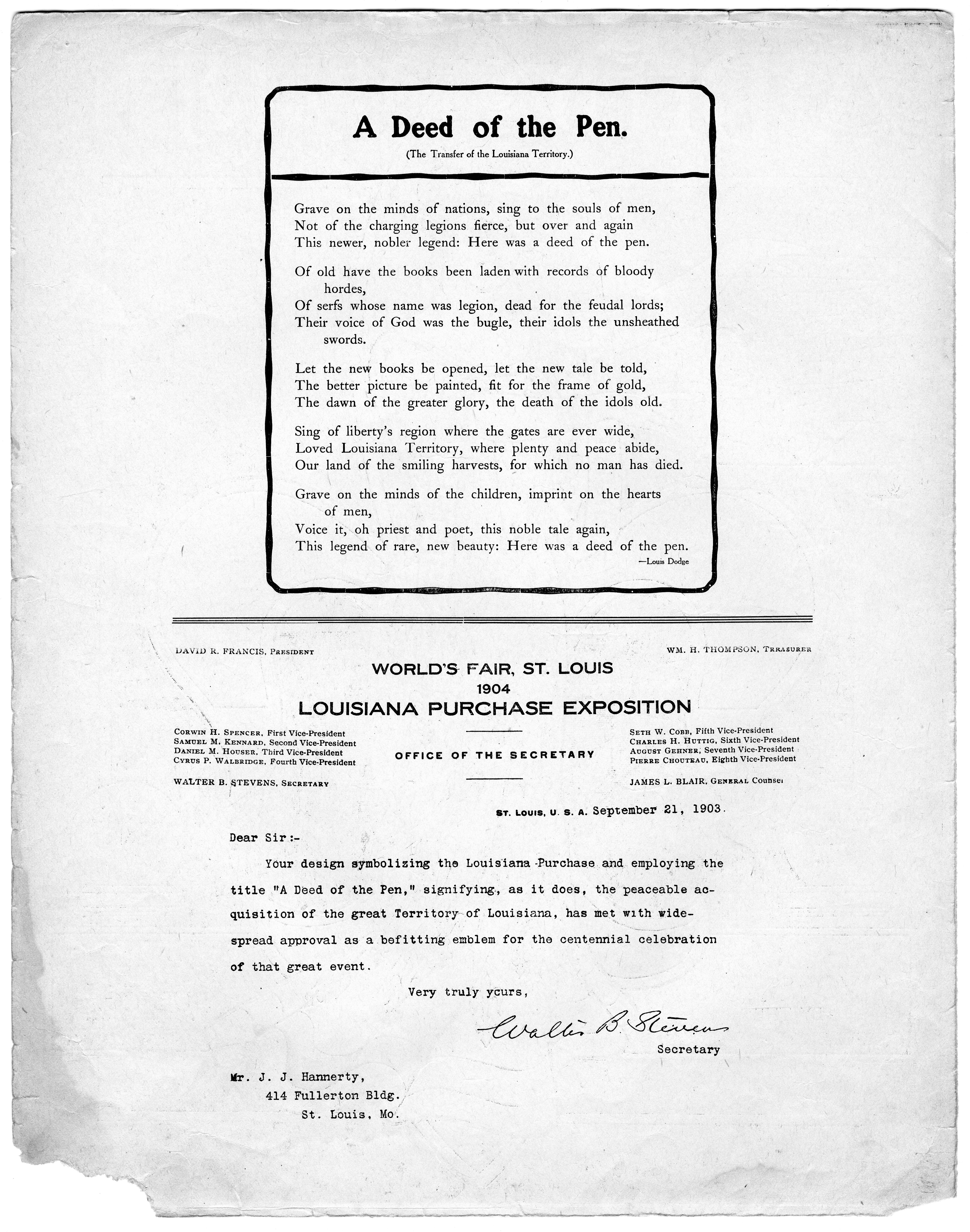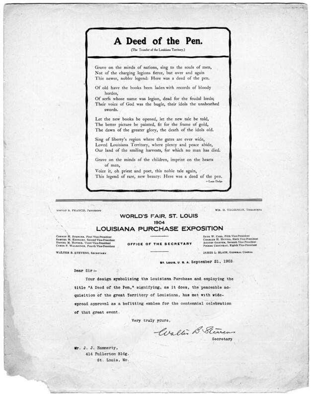- P. (2) contains the poem "A deed of the pen (the transfer of the Louisiana Territory)" by Louis Dodge, as well as a letter from Walter B. Stevens, Secretary of the Louisiana Purchase Exposition, commenting on the appropriateness of the title and illustration for the fair.