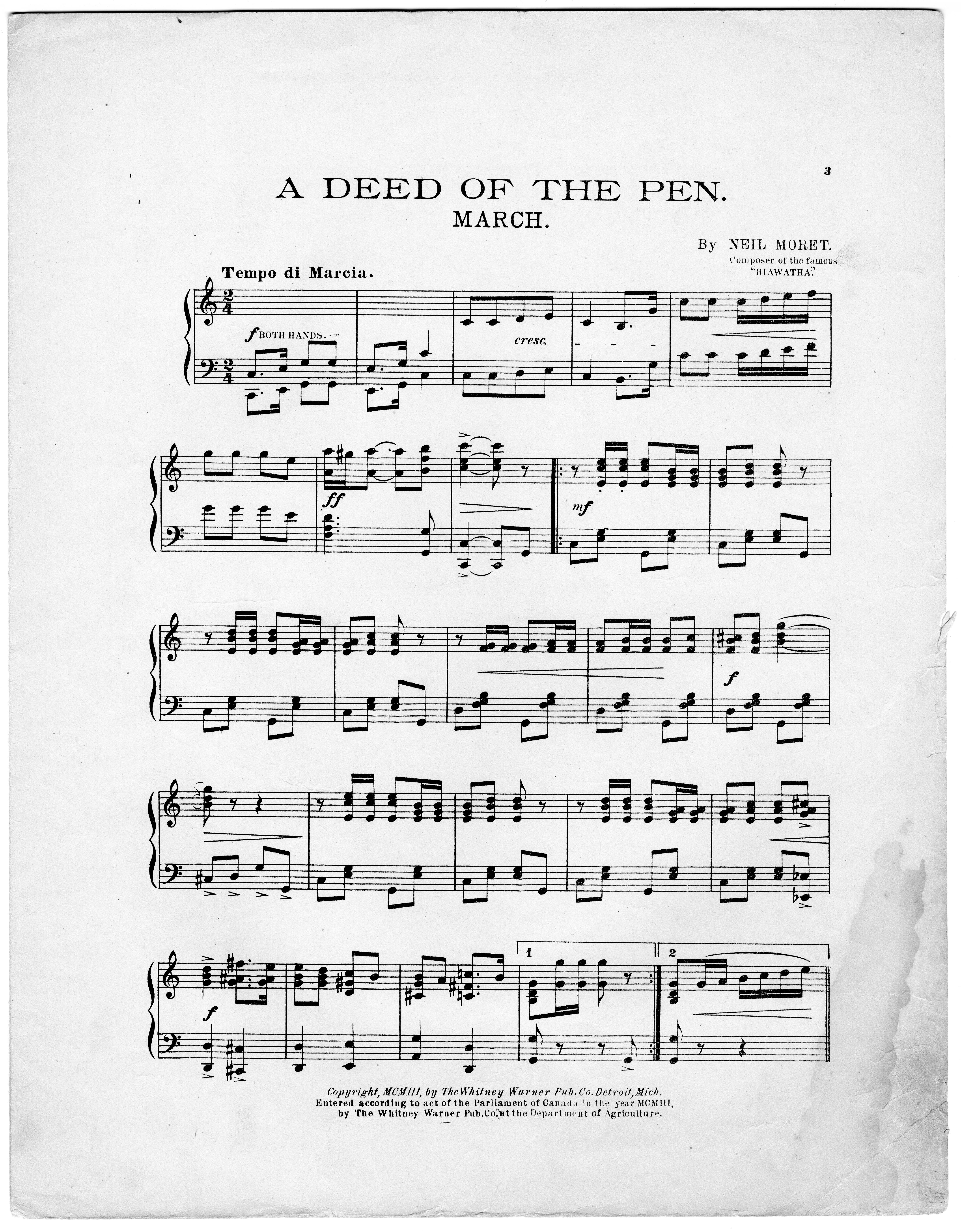 Morét, Neil, 1878-1943. 2000. “A Deed of the Pen : March- Two-Step By the Composer of ‘Hiawatha’”. Detroit : Whitney-Warner Pub-Co, Class, Race, and Sheet Music at the Louisiana Purchase Exposition, accessed February 11, 2026, https://digitalexhibits.library.wustl.edu/s/lpemusic/item/3588