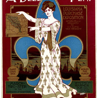 - T.p. ill.: burgundy border; drawing of a woman in a long, white, medieval inspired gown with a gold fleur-de-lis pattern and a gold hem, holding a map of the Louisiana Territory in her right hand, and pointing to it with her left; behind her is a blue fleur-de-lis, and behind that are outlines of the tops of buildings, with banners and trumpeters atop the buildings; on either side of the woman are gold, round finials with the words "Saint Louis 1904" on one, and "World's Fair March" on the other.