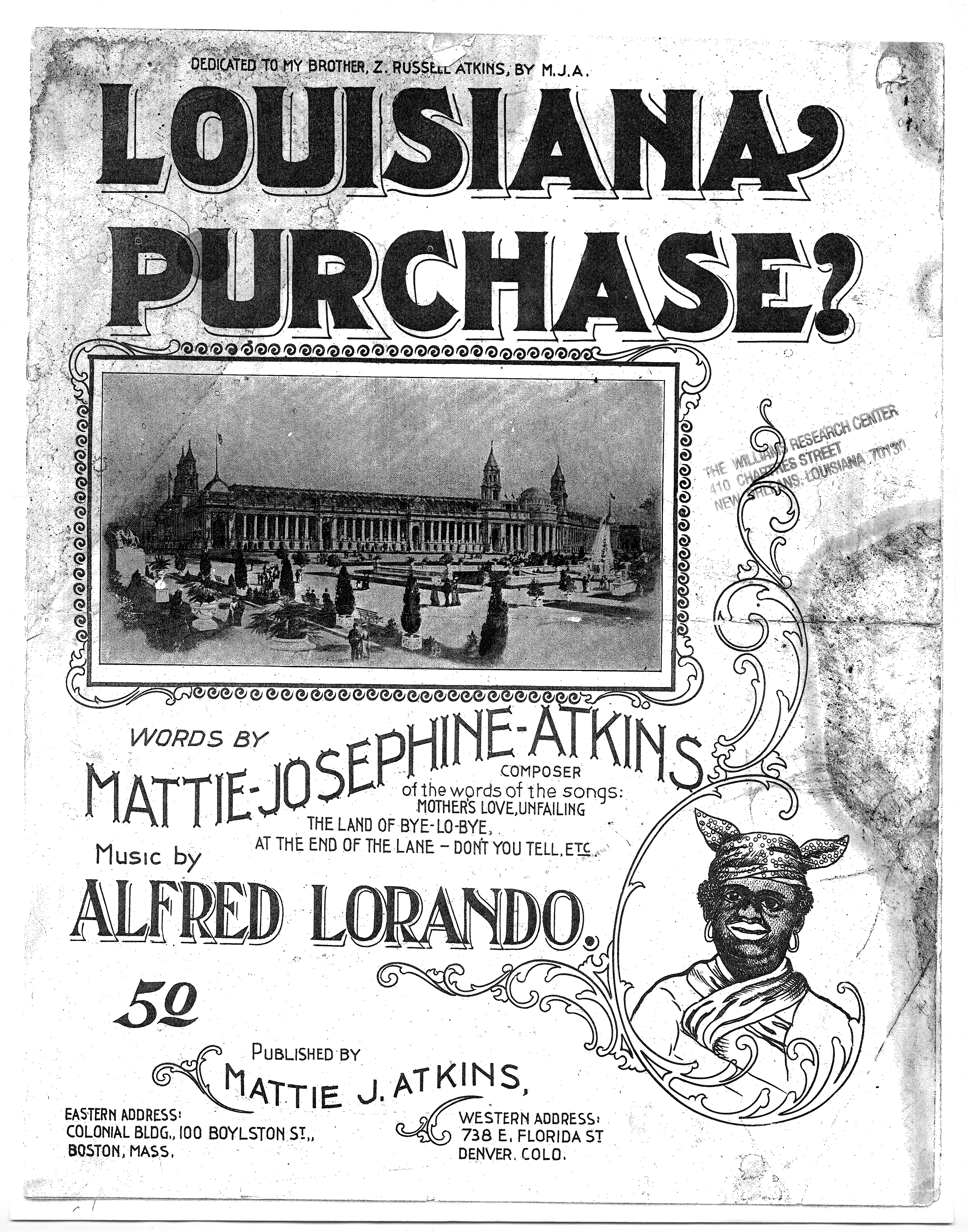 Lorando, Alfred. 2000. “Louisiana Purchase? Words by Mattie Josephine Atkins ; Music by Alfred Lorando”. Boston (Colonial Bldg., 100 Boylston St.), Mass. : published by Mattie J. Atkins, Class, Race, and Sheet Music at the Louisiana Purchase Exposition, accessed February 12, 2026, https://digitalexhibits.library.wustl.edu/s/lpemusic/item/3593