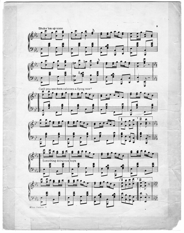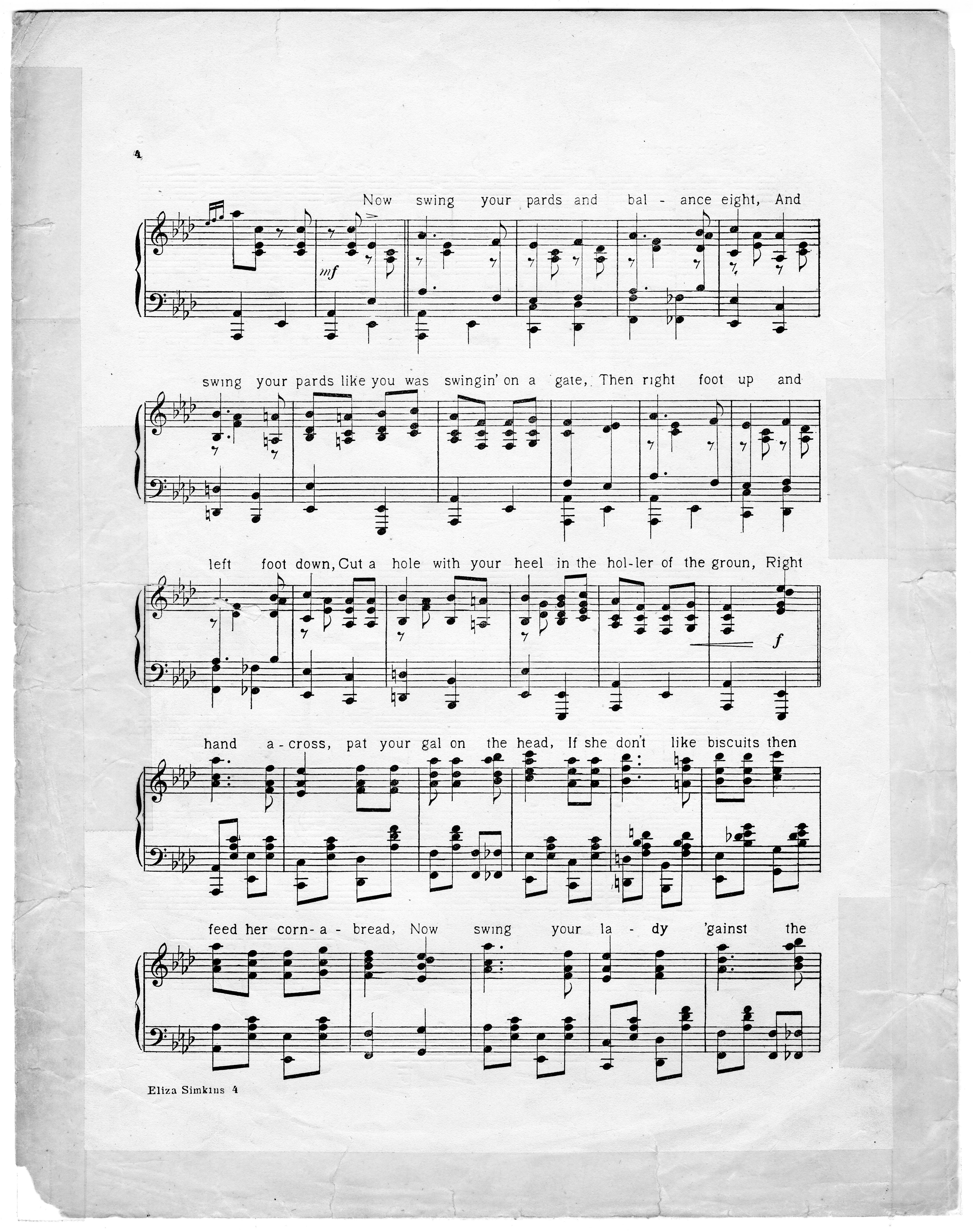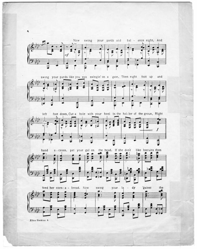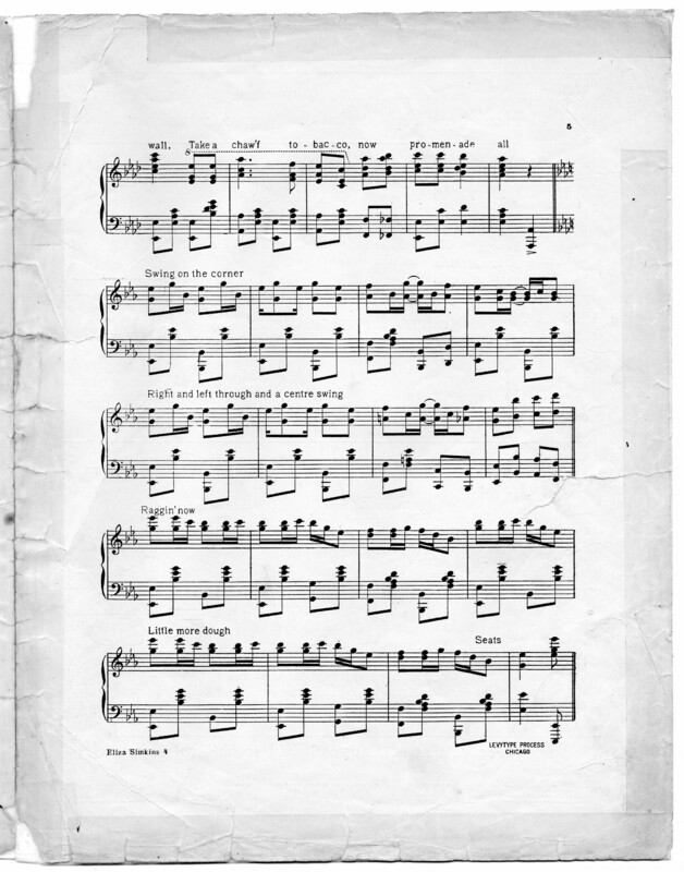- Pp. 4-5 have dance instructions for a caller: "Now swing your pards and balance eight, and swing your pards like you was swingin' on a gate, then right foot up and left foot down, cut a hole with your heel in the holler of the groun, right hand across, pat your gal on the head, if she don't like biscuits then feed her corn-a-bread, now swing your lady 'gainst the wall, take a chaw'f tobacco, now promenade all."