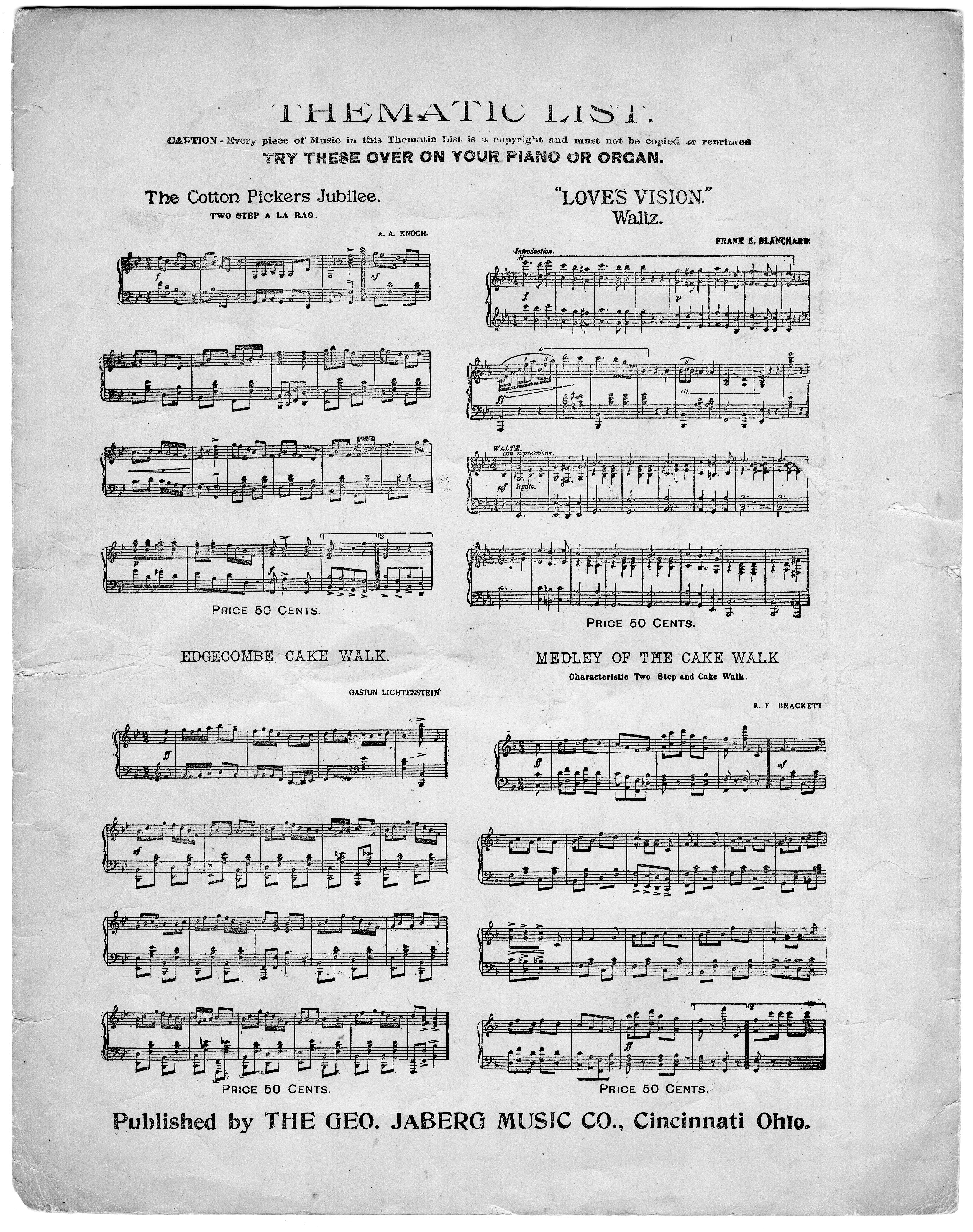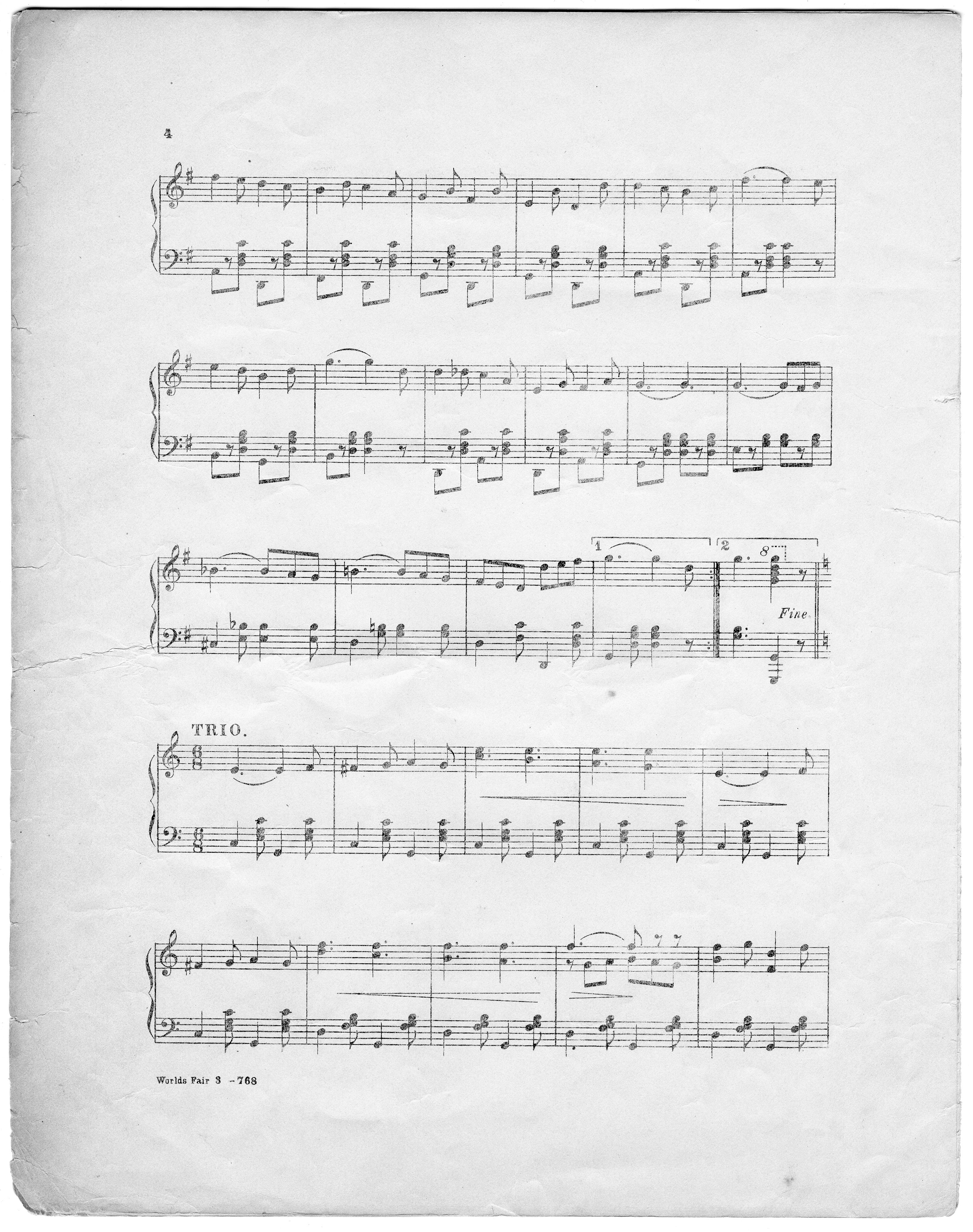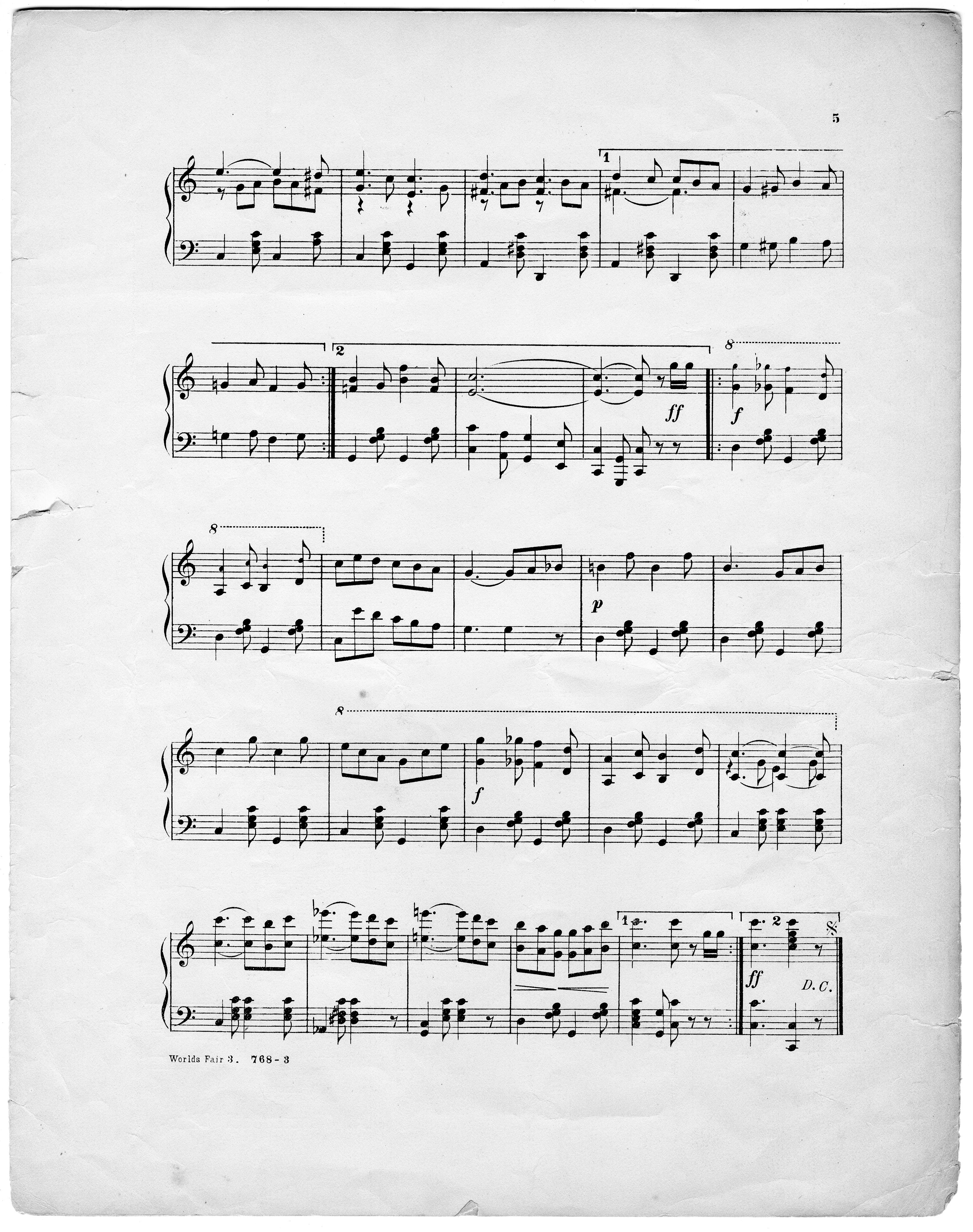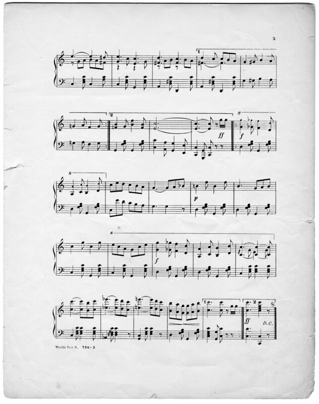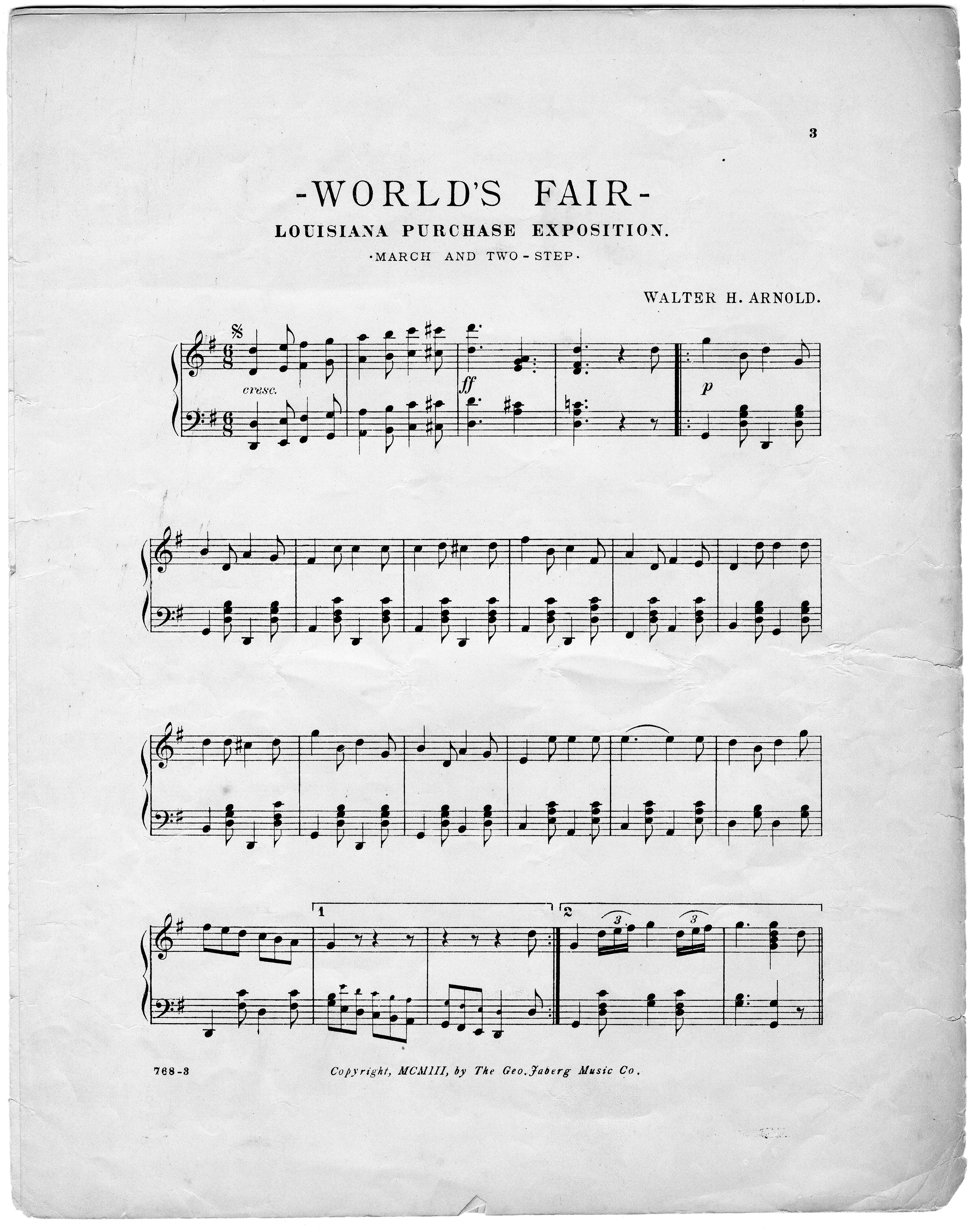 Arnold, Walter H. 2000. “World’s Fair (Louisiana Purchase Exposition) : March & Two-Step For Piano by Walter H. Arnold”. Cincinnati, Ohio : published by The Geo. Jaberg Music Co, Class, Race, and Sheet Music at the Louisiana Purchase Exposition, accessed February 12, 2026, https://digitalexhibits.library.wustl.edu/s/lpemusic/item/3599
