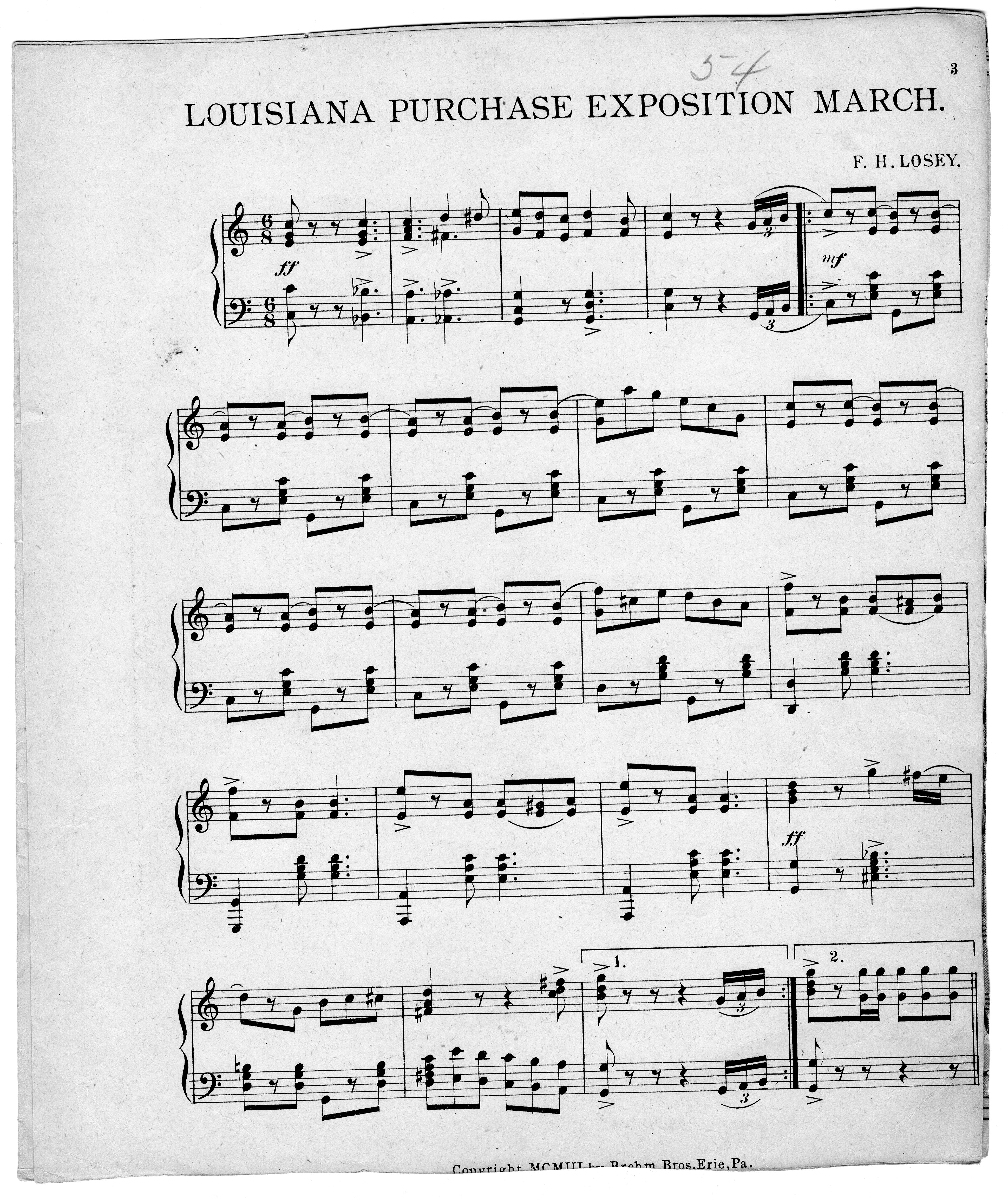 Losey, F. H. 2000. “Louisiana Purchase Exposition : March Composed by F.H. Losey”. Erie, Pa. : published by Brehm Bros, Class, Race, and Sheet Music at the Louisiana Purchase Exposition, accessed February 12, 2026, https://digitalexhibits.library.wustl.edu/s/lpemusic/item/3600