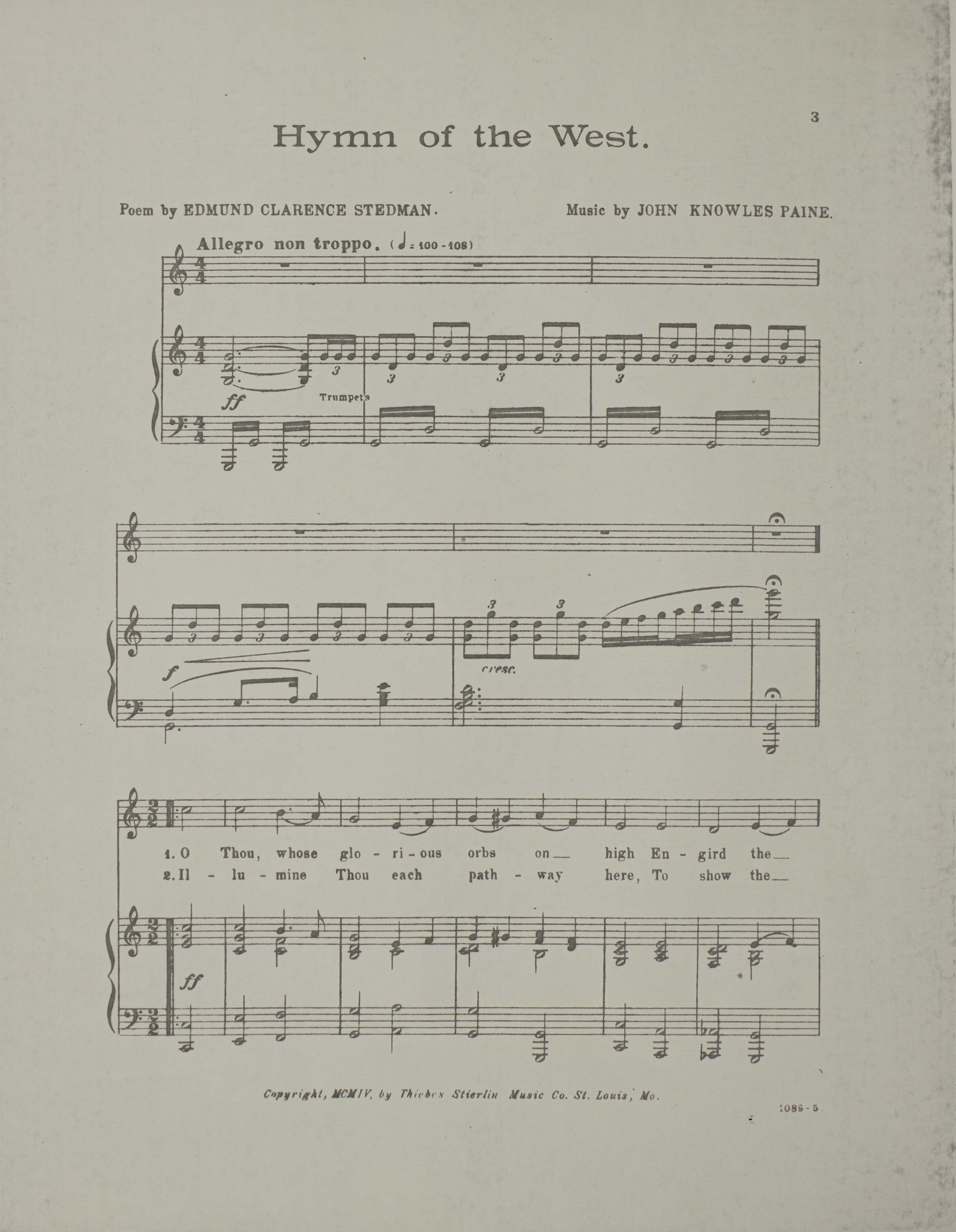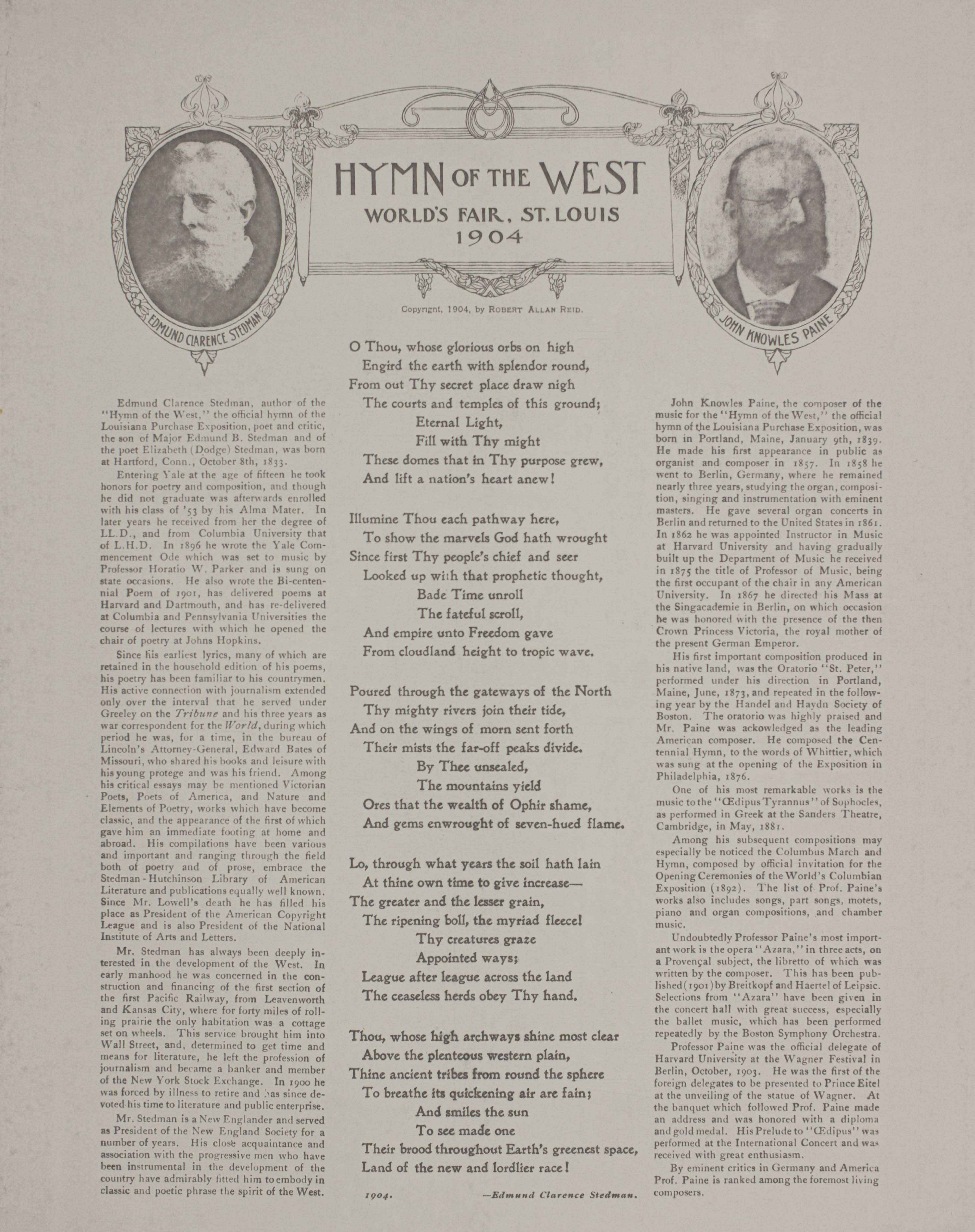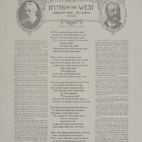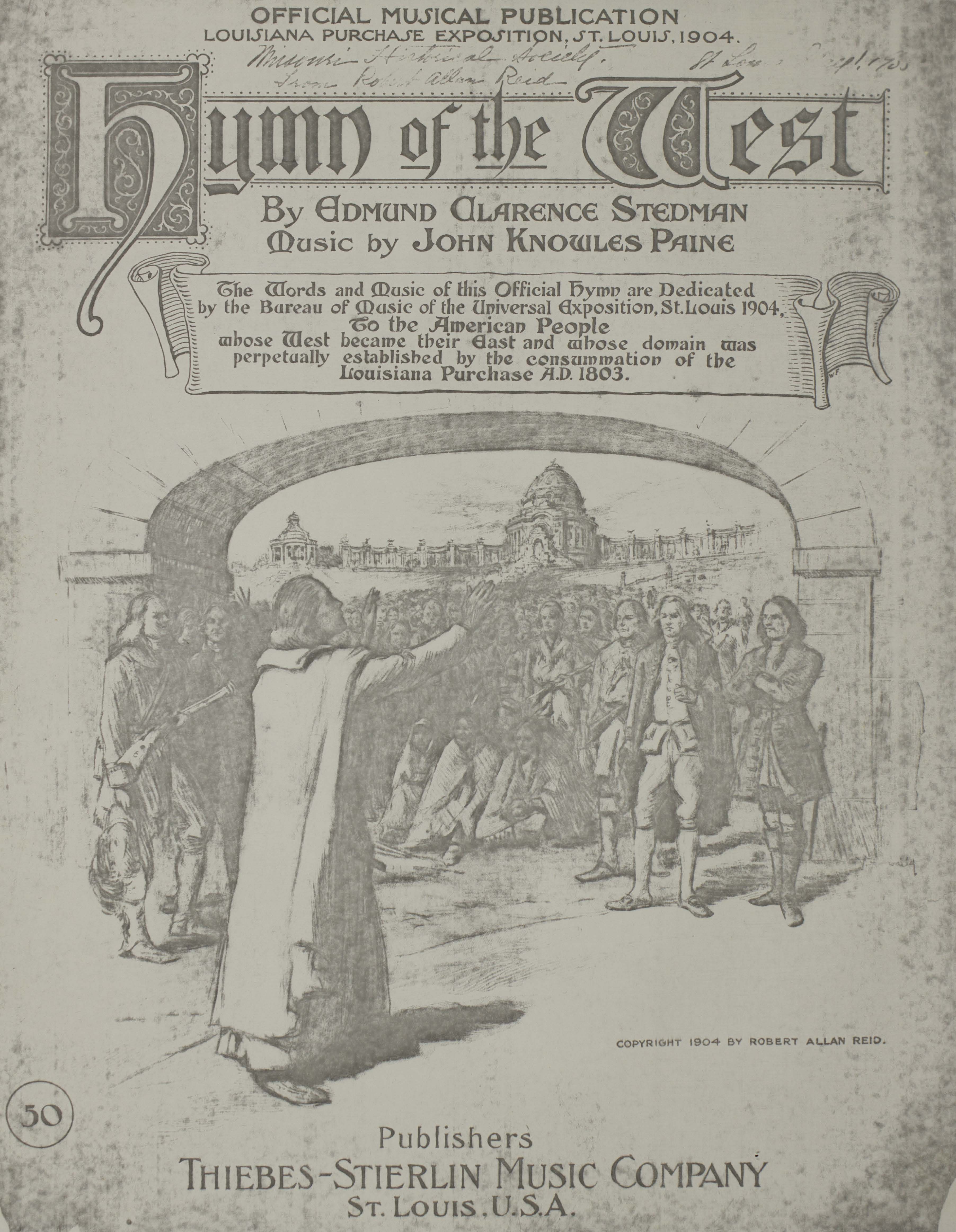 Paine, John Knowles, 1839-1906. 2000. “Hymn of the West by Edmund Clarence Stedman ; Music by John Knowles Paine”. St. Louis, Mo. : Thiebes-Stierlin Music Co, Class, Race, and Sheet Music at the Louisiana Purchase Exposition, accessed February 11, 2026, https://digitalexhibits.library.wustl.edu/s/lpemusic/item/37750