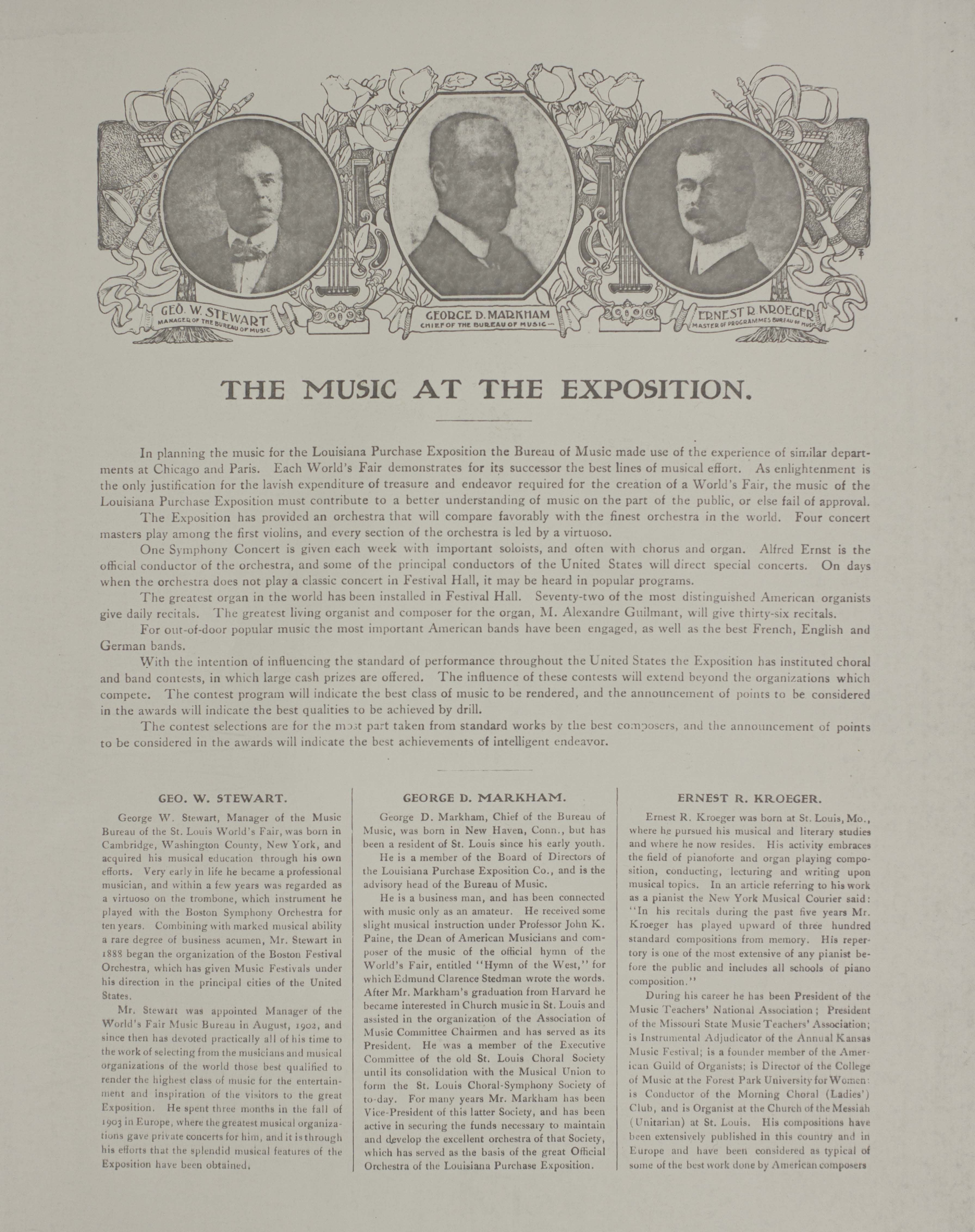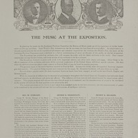 - "The music at the Exposition" (including portraits and biographical sketches of Geo. W. Stewart, George D. Markham, and Ernest R. Kroeger): p. [8]
