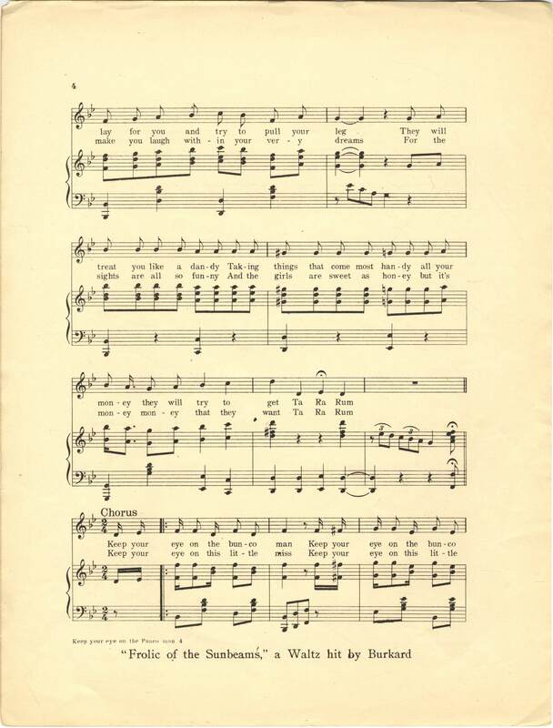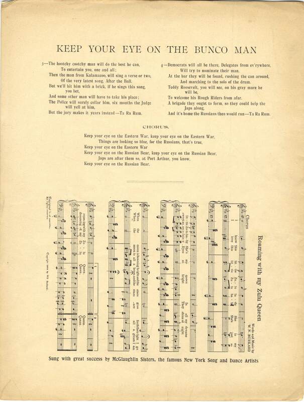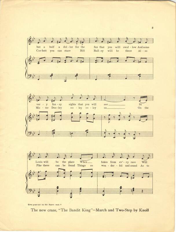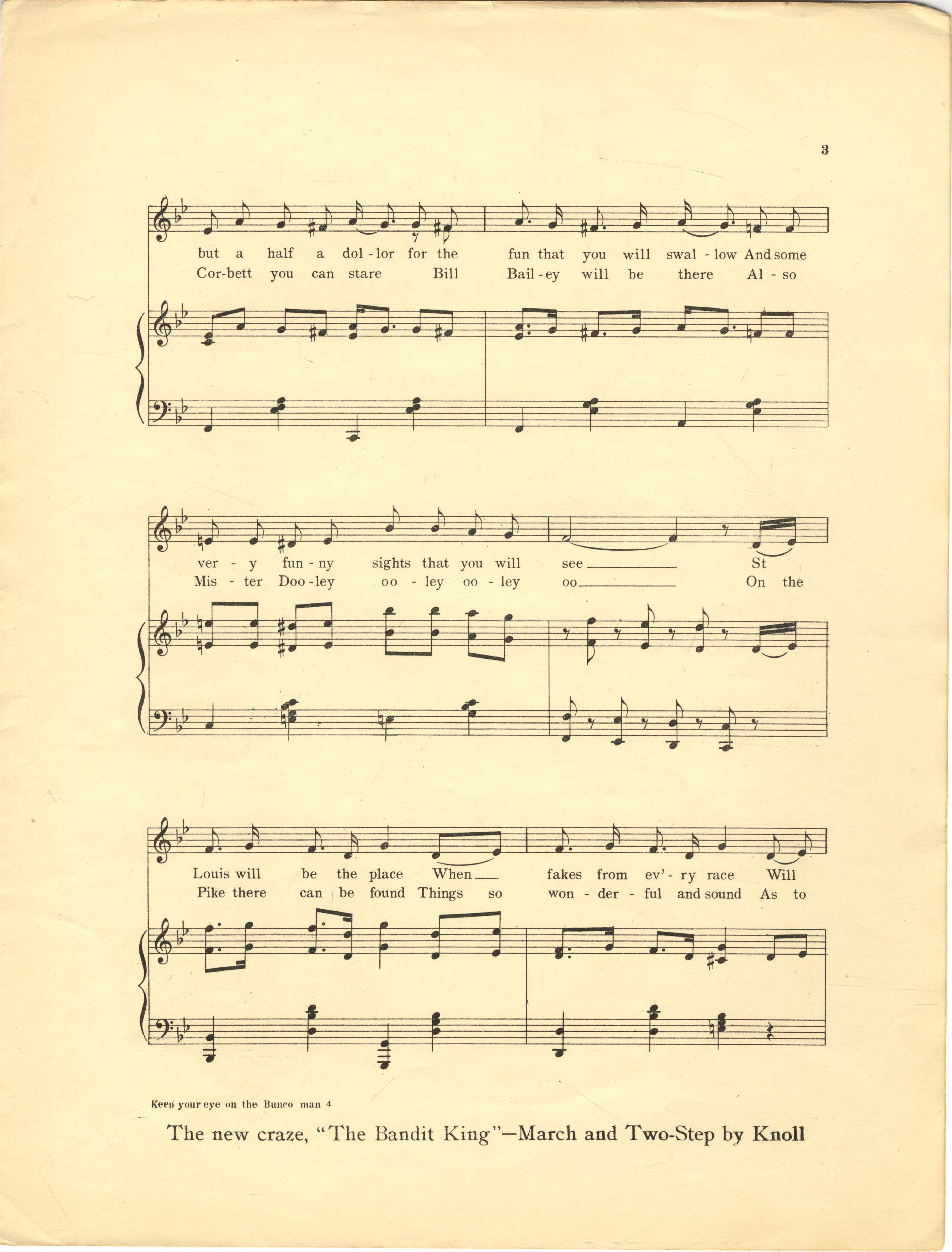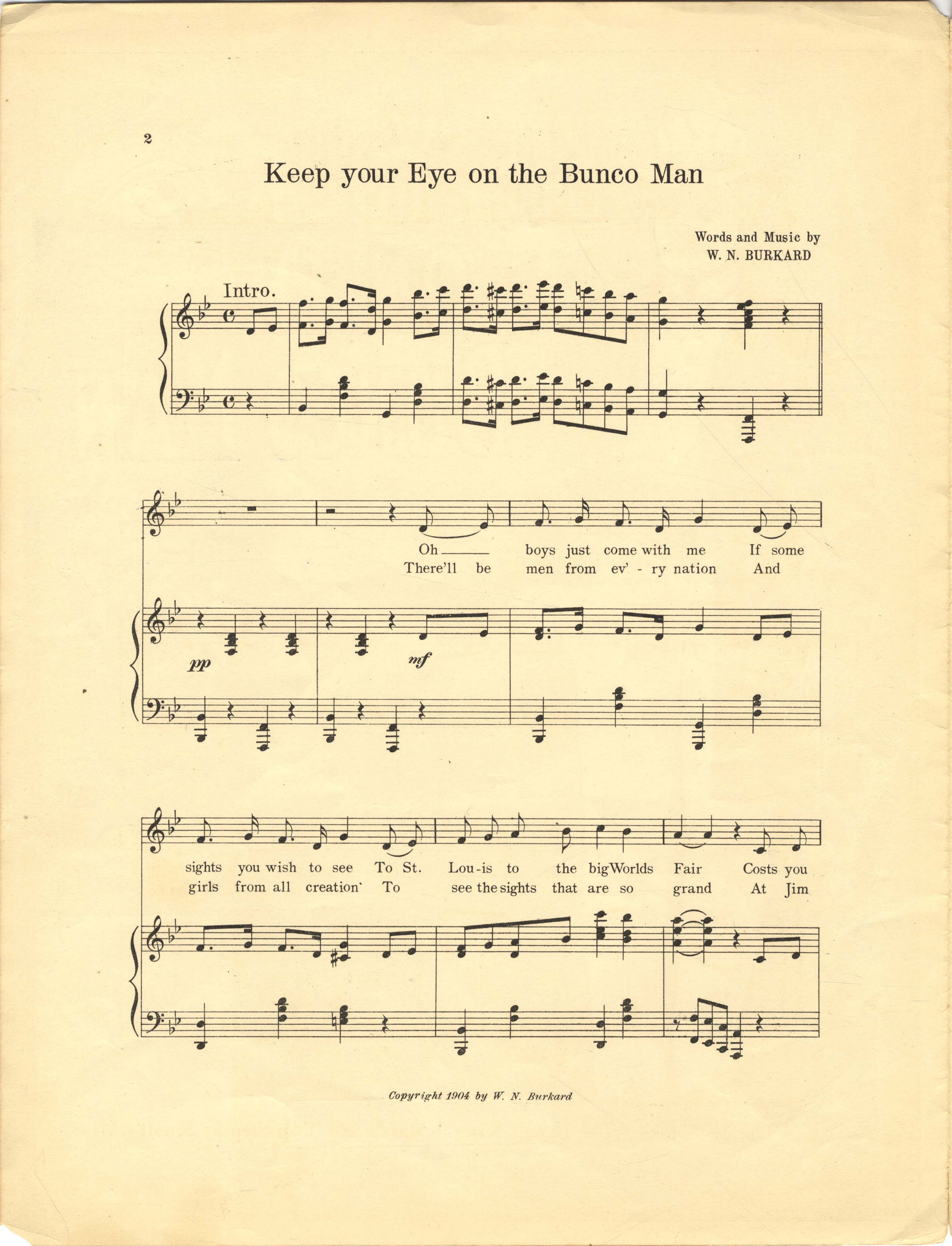 Burkard, Wm. N. 2000. “Keep Your Eye on the Bunco Man : the St. Louis World’s Fair March Song Words and Music by Wm. N. Burkard”. Chicago, Ills. : W. N. Burkard & Co, Class, Race, and Sheet Music at the Louisiana Purchase Exposition, accessed February 11, 2026, https://digitalexhibits.library.wustl.edu/s/lpemusic/item/42942