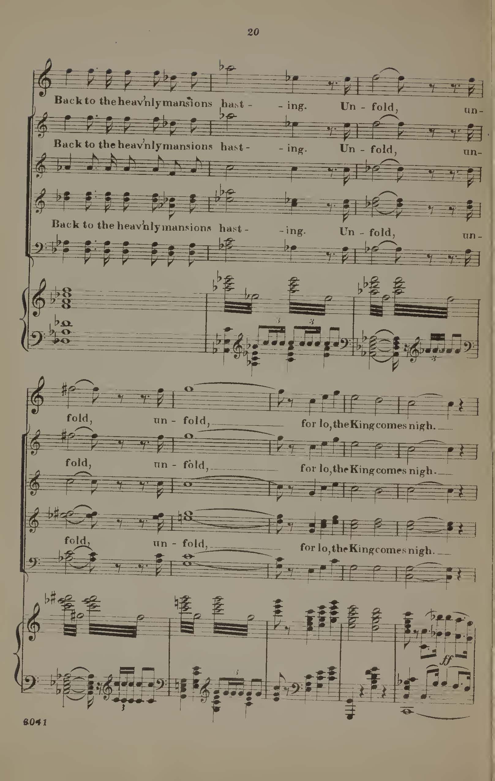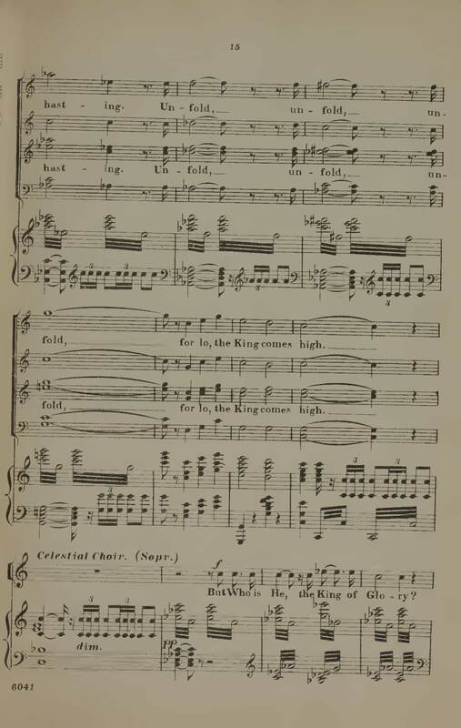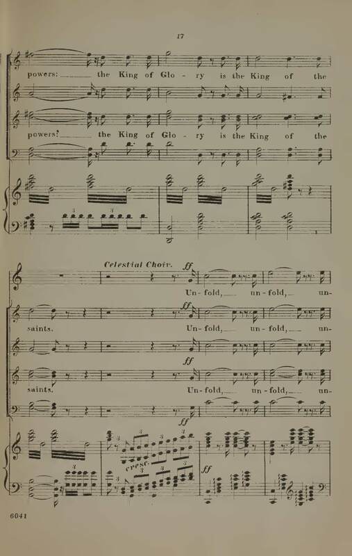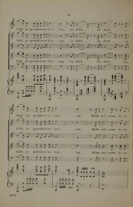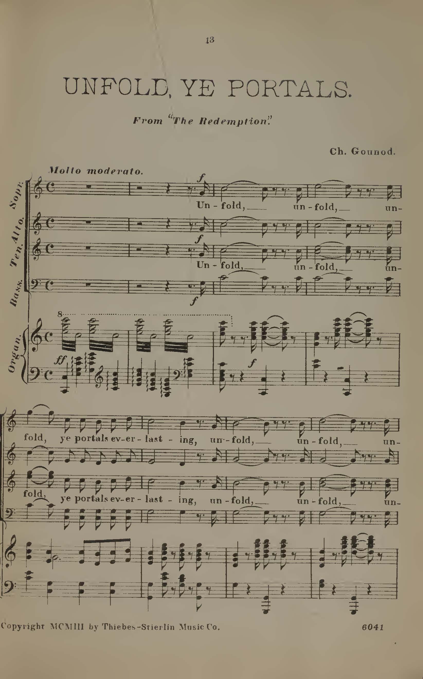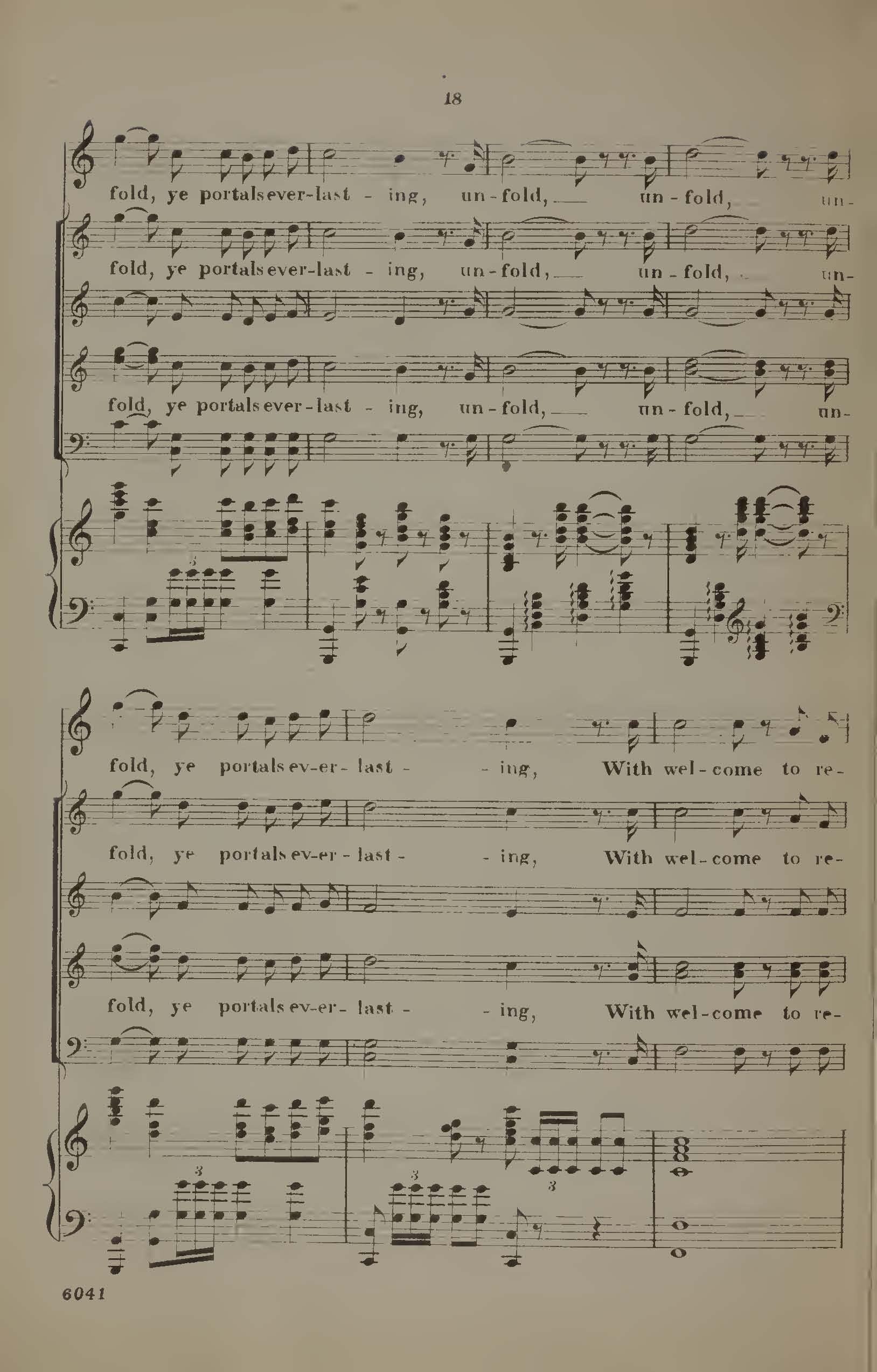 - For mixed chorus (SATB) with piano accompaniment, or (in Unfold, ye portals) mixed chorus (SSATB) with organ accompaniment.