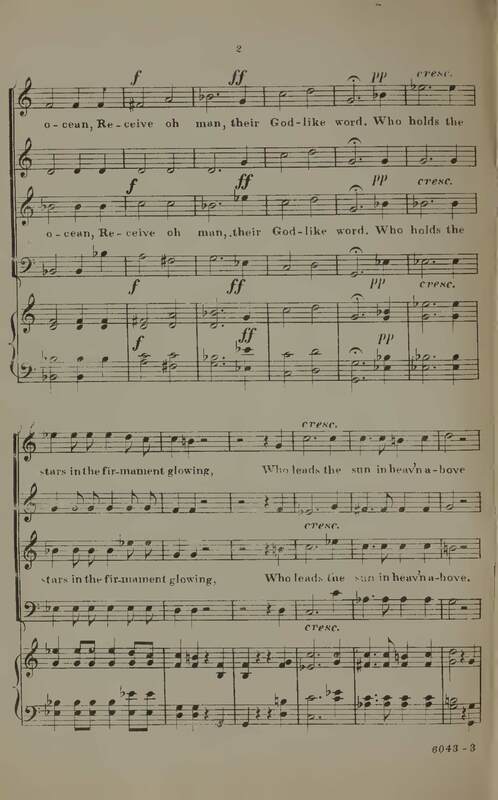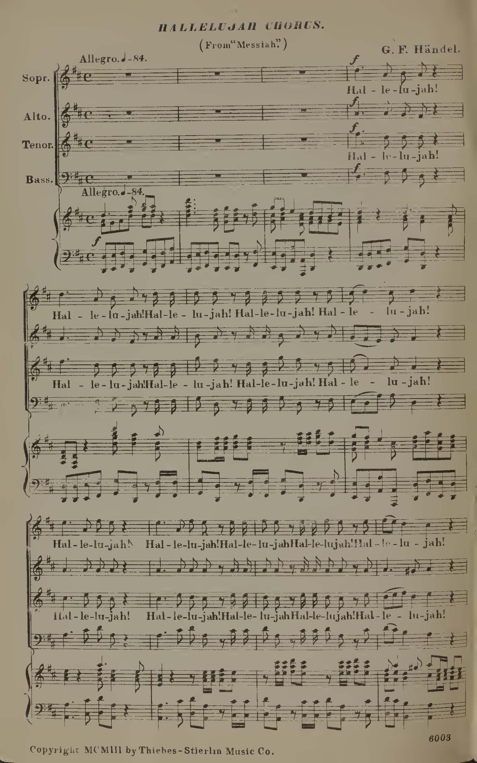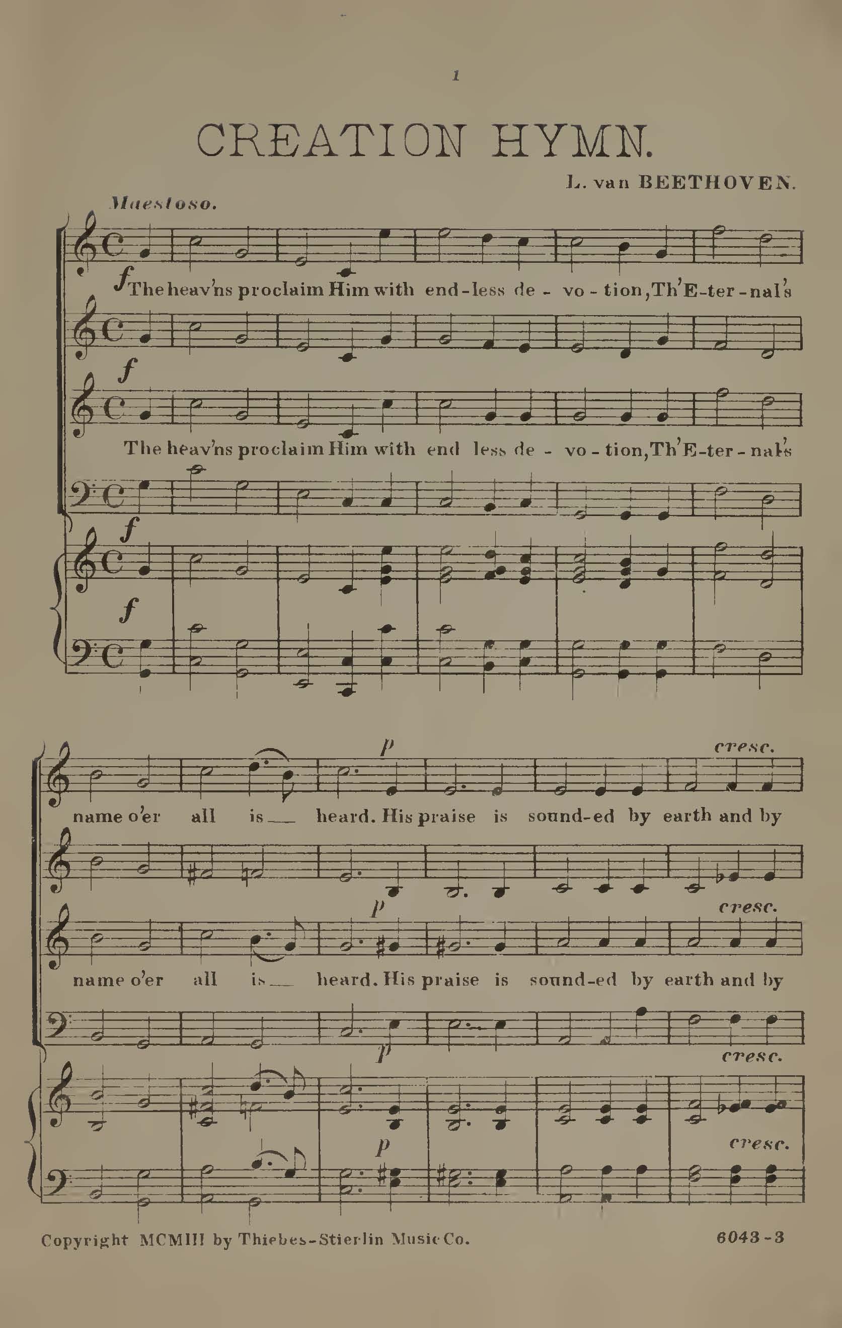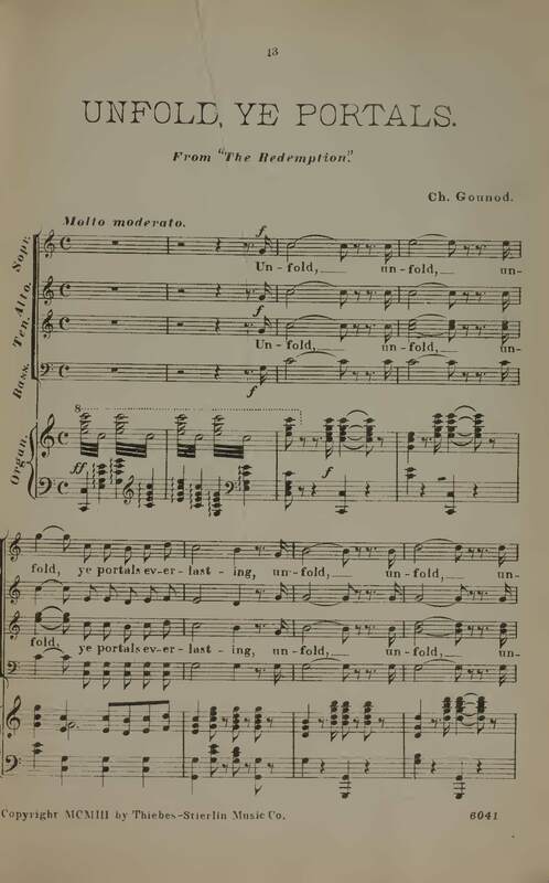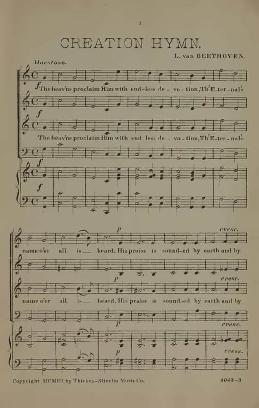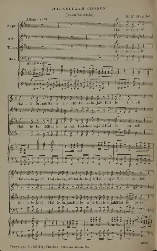- Creation hymn / L. van Beethoven -- Hallelujah chorus : from "Messiah" / G.F. Händel -- Unfold, ye portals : from "The redemption" / Ch. Gounod -- America / words by S.F. Smith.