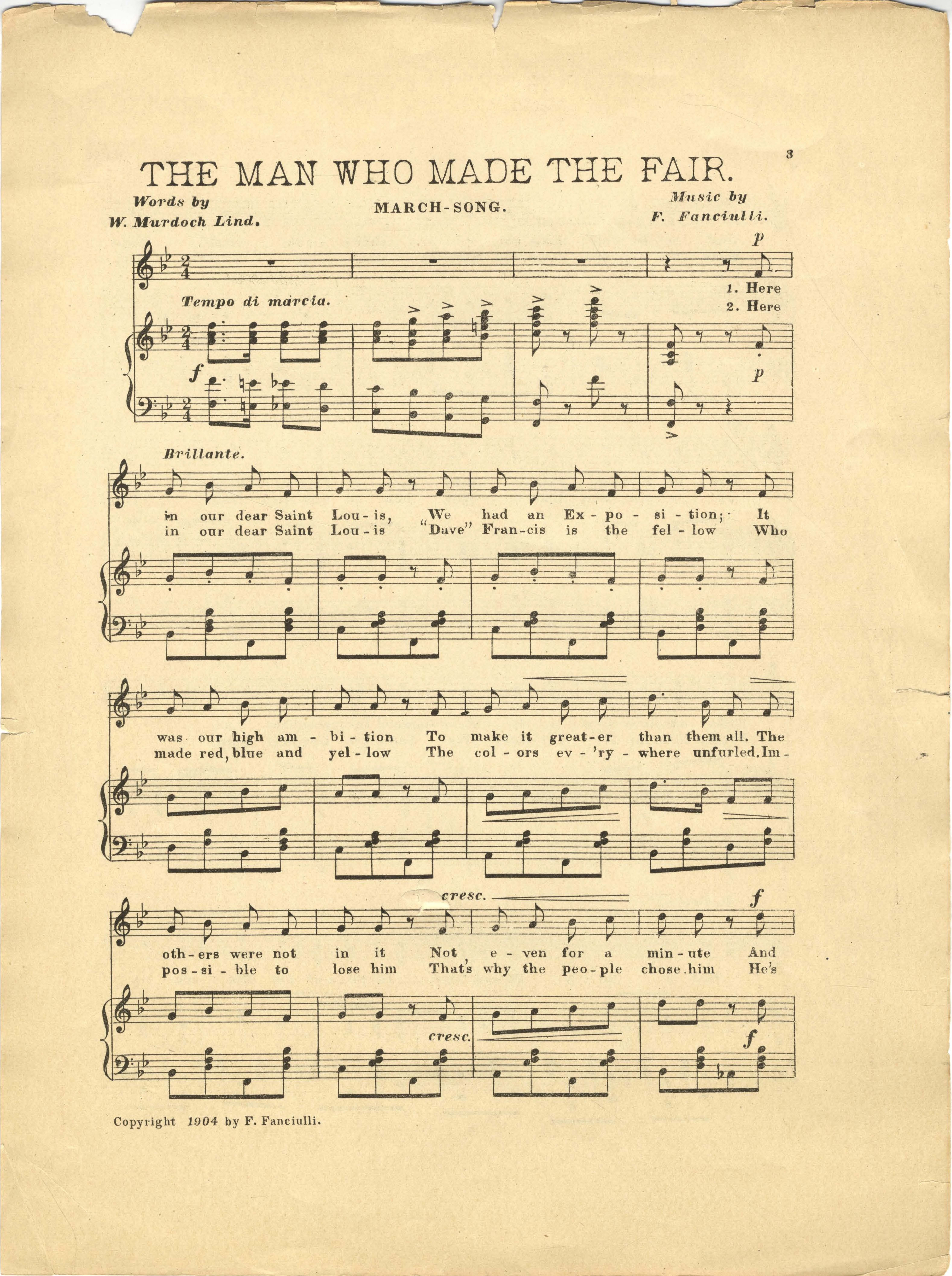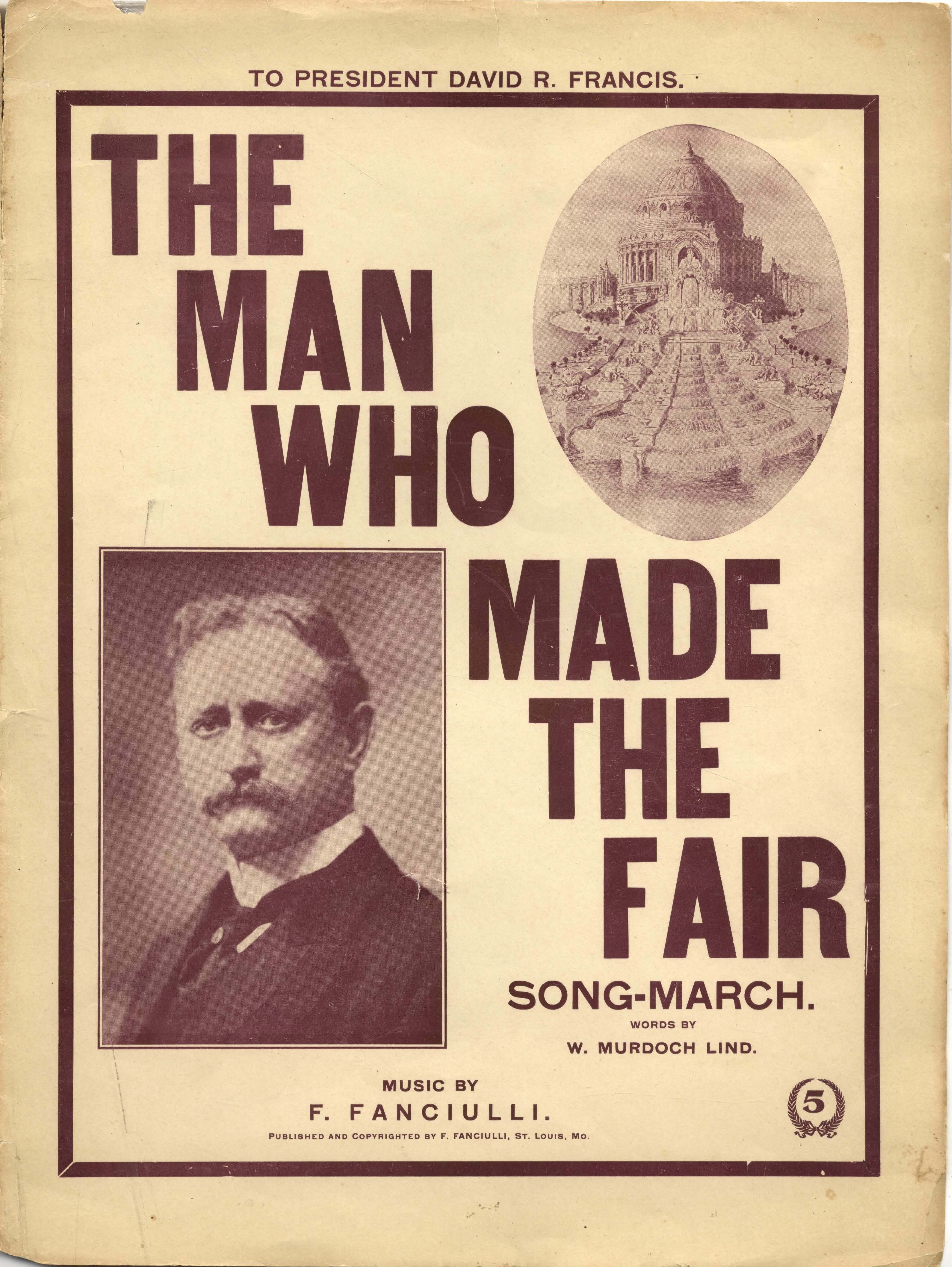 Fanciulli, F. (Francesco), 1853-1915. 2000. “The Man Who Made the Fair : Song-March Music by F. Fanciullli ; Words by W. Murdoch Lind”. St. Louis, Mo. : published by F. Fanciulli, Class, Race, and Sheet Music at the Louisiana Purchase Exposition, accessed February 11, 2026, https://digitalexhibits.library.wustl.edu/s/lpemusic/item/43139