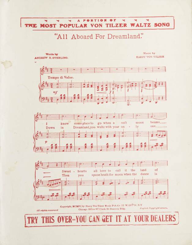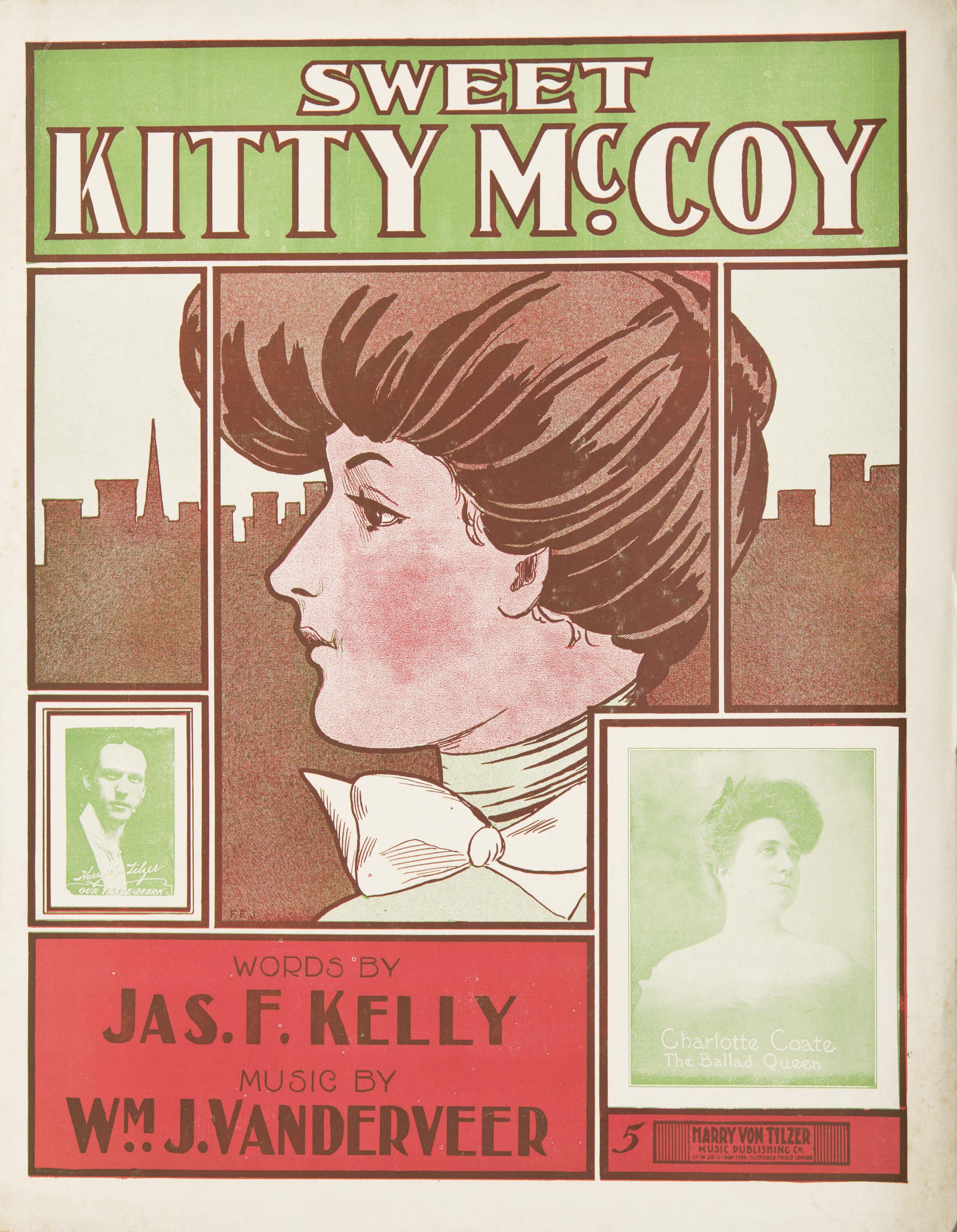 - T.p. ill.: three-color lithograph of young woman's head in profile against a city skyline; signed: F.E.J.; inset head shots of Harry von Tilzer and Charlotte Coate, "The Ballad Queen."