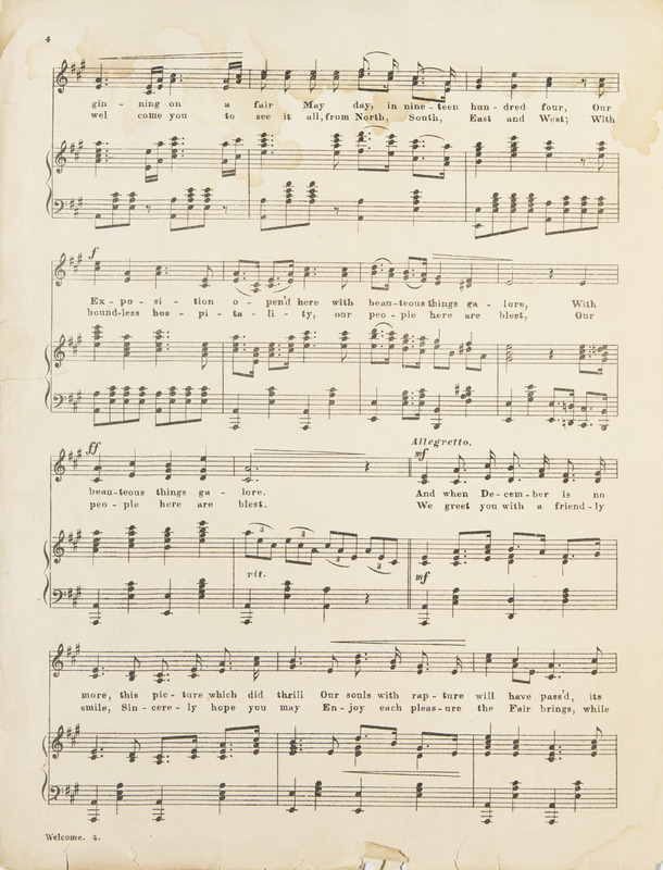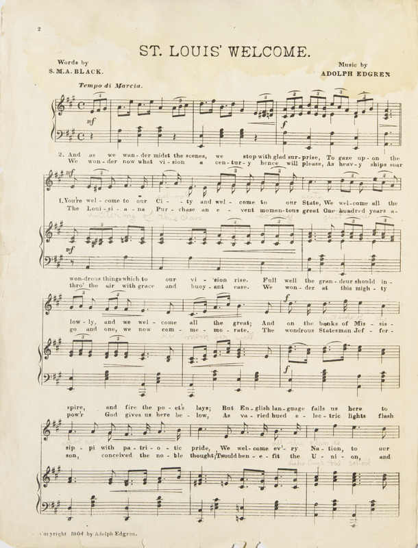 Edgren, Adolph. 2000. “St. Louis’ Welcome : March-Song for Solo or Duet Music by Adolph Edgren ; Words by Sallie M.A. Black”. St. Louis, Mo. : published by Adolph Edgren, Class, Race, and Sheet Music at the Louisiana Purchase Exposition, accessed February 11, 2026, https://digitalexhibits.library.wustl.edu/s/lpemusic/item/43459