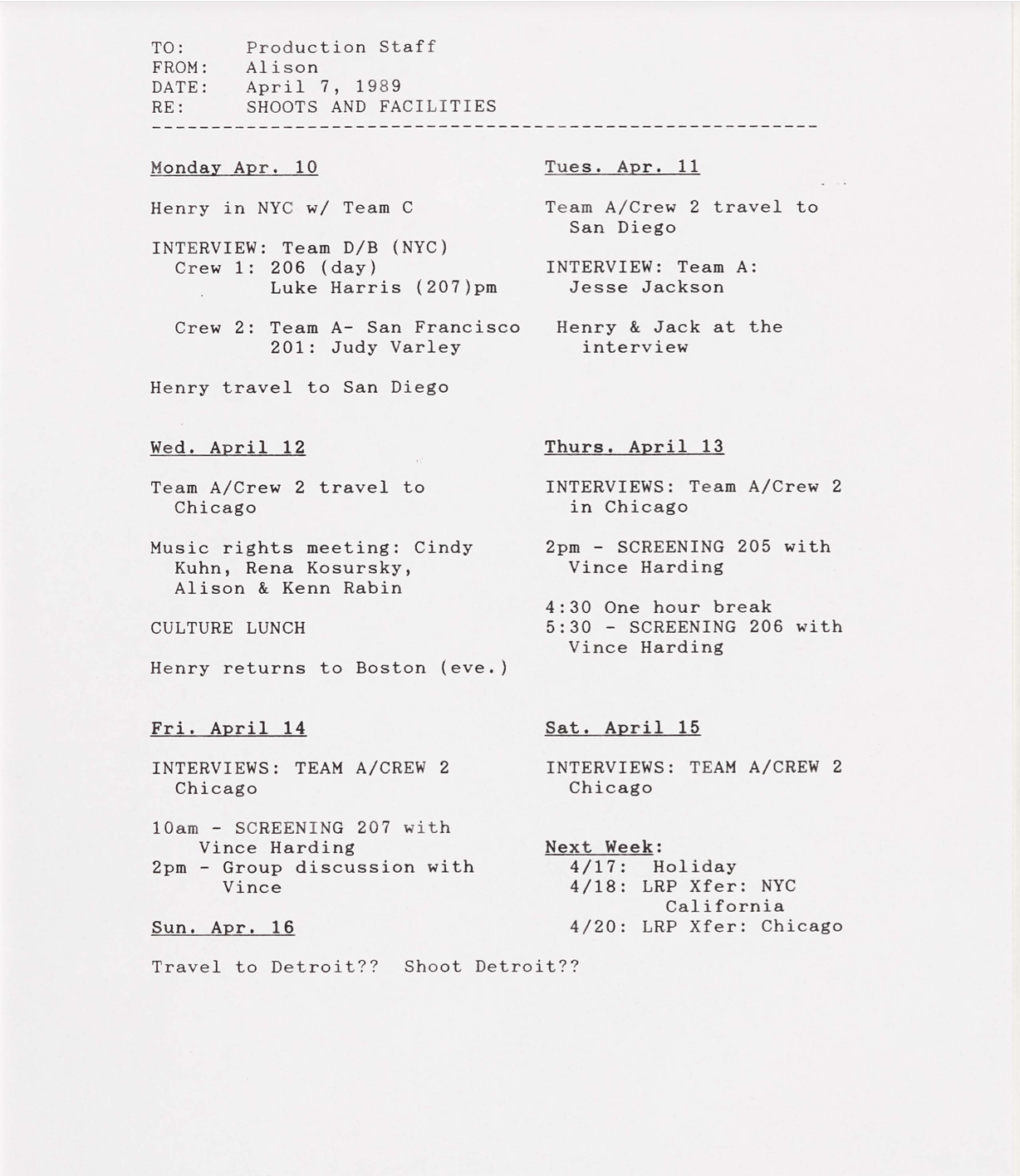 “Shoot Schedule (April 10 through April 16)”. Letter. 1989. Paper, 1989, More than Talking Heads, accessed February 11, 2026, https://digitalexhibits.library.wustl.edu/s/more-than-talking-heads/item/2169