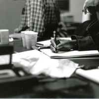 Notetaking Hands During Production Meeting. 1987. Unpublished, More than Talking Heads, accessed February 11, 2026, https://digitalexhibits.library.wustl.edu/s/more-than-talking-heads/item/2218