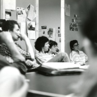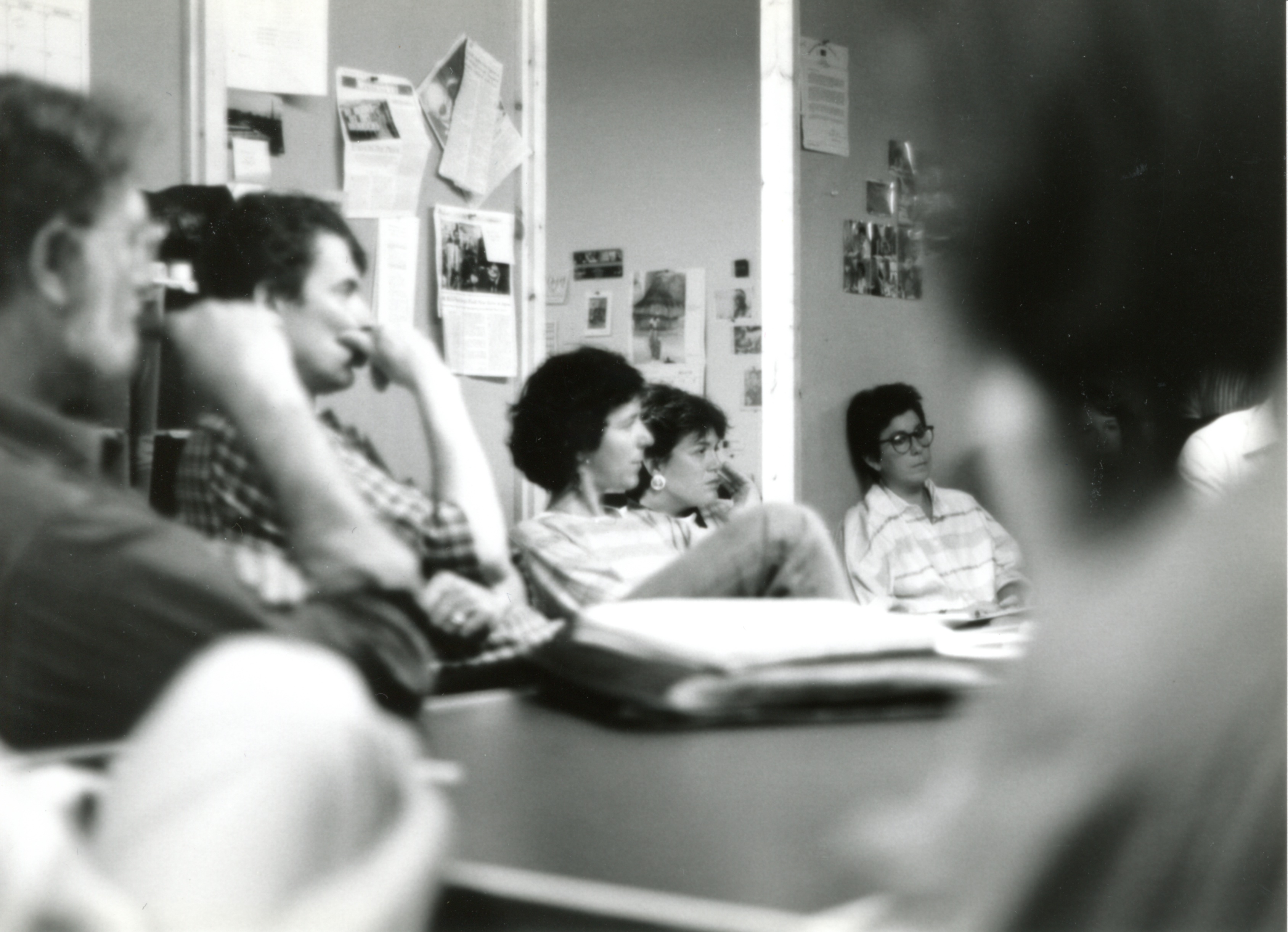 Steve Fayer, James DeVinney, Susan Levine, Dale Rose, and Janet Laurence at Production Meeting. 1987. Unpublished, More than Talking Heads, accessed February 11, 2026, https://digitalexhibits.library.wustl.edu/s/more-than-talking-heads/item/2220